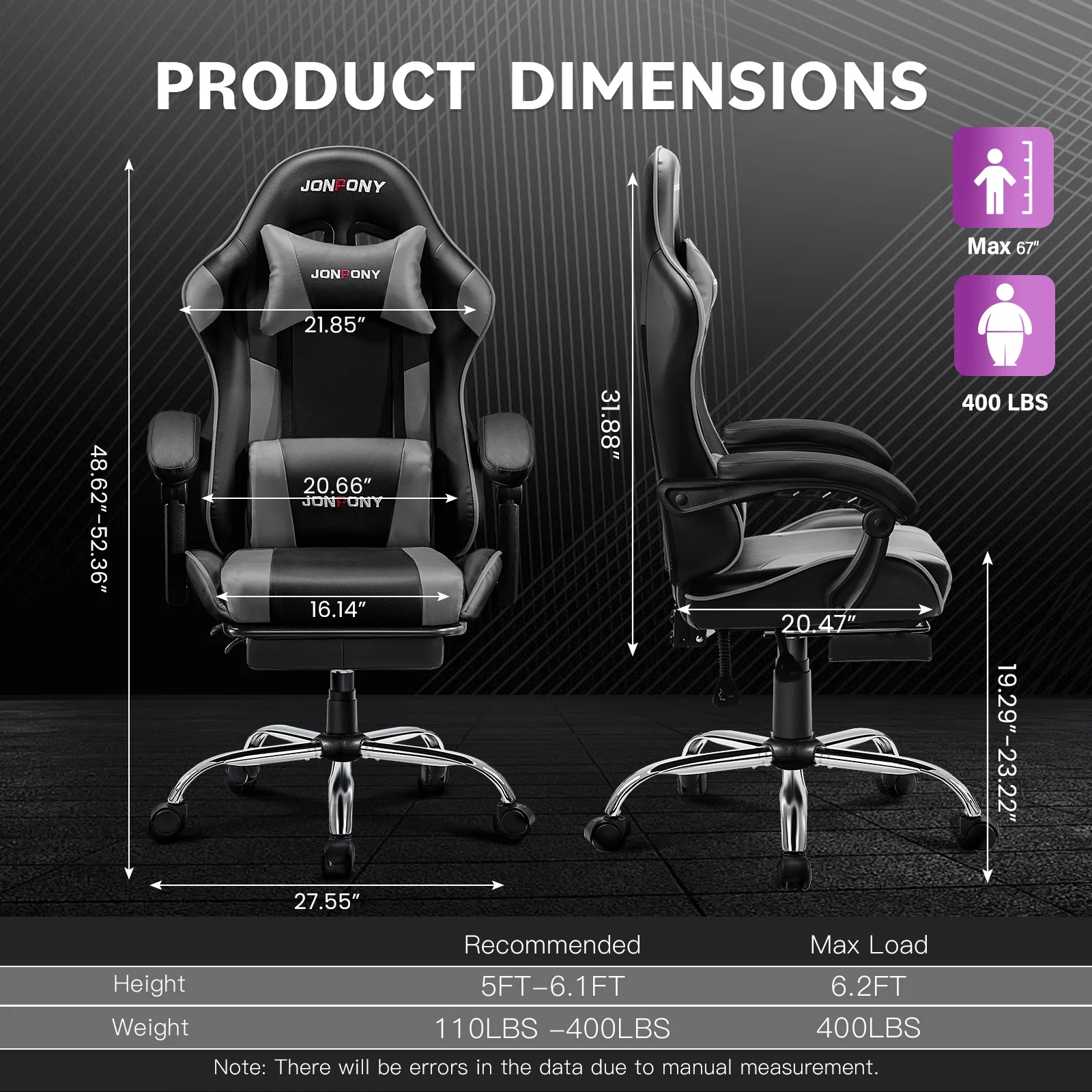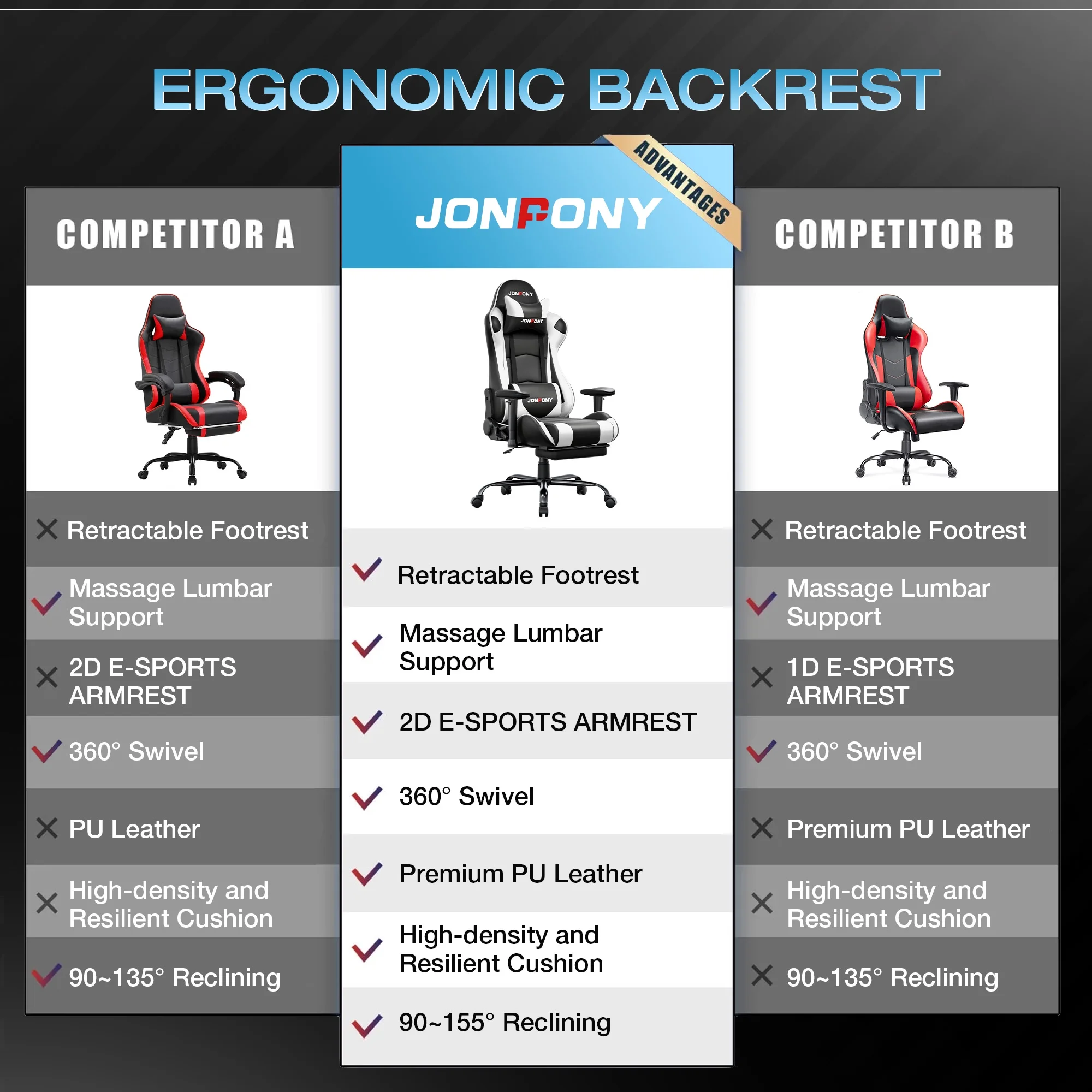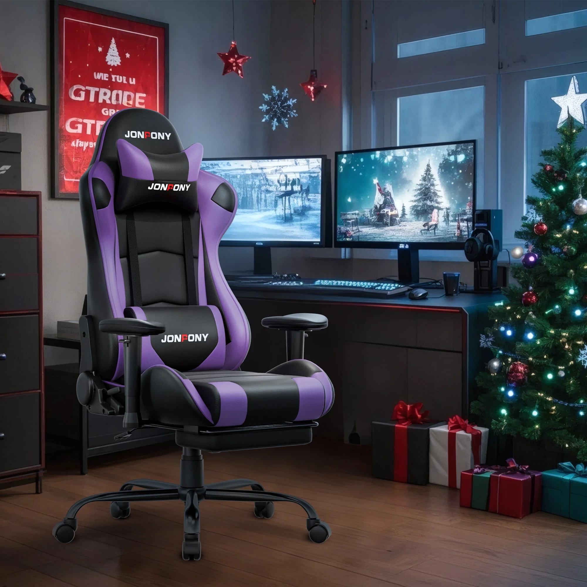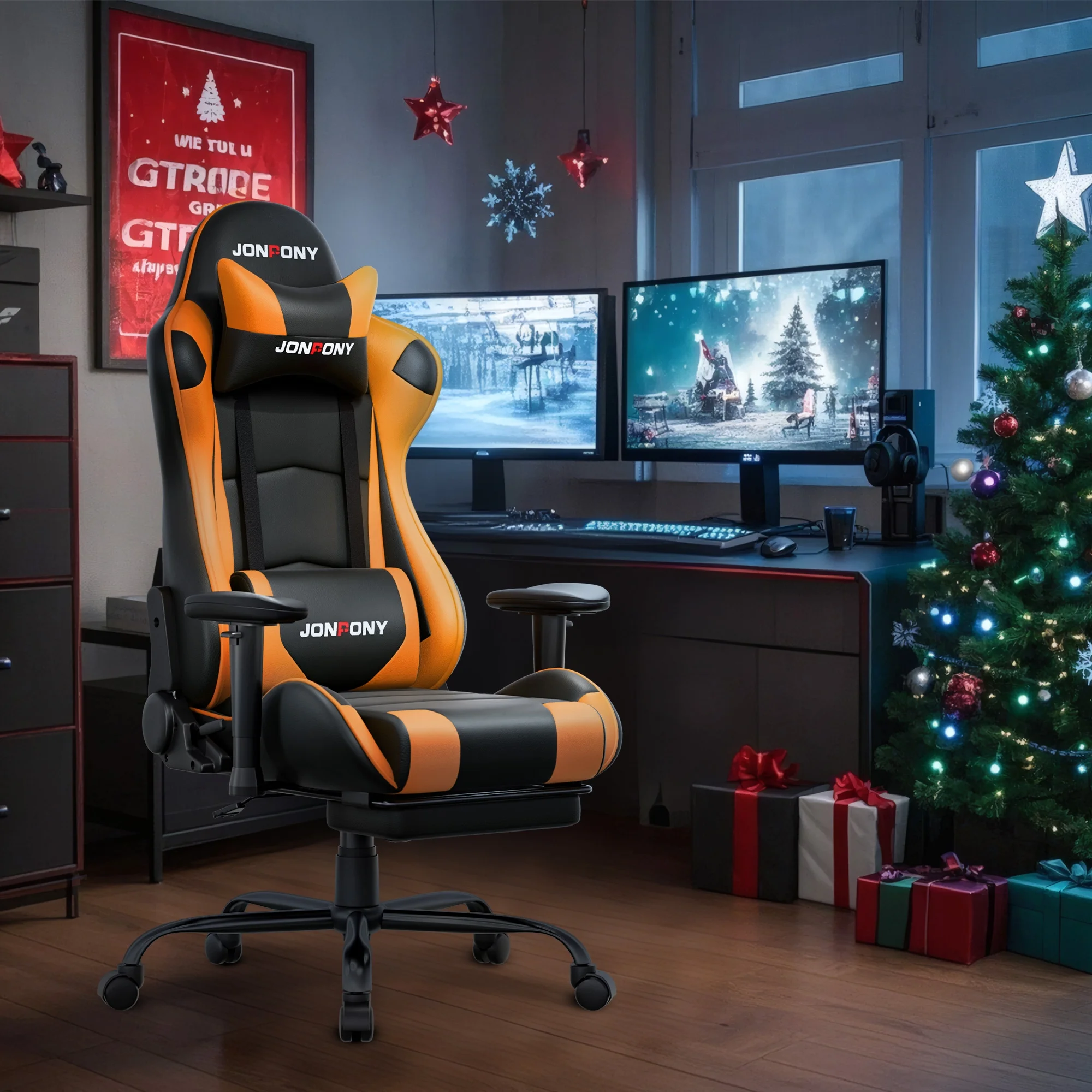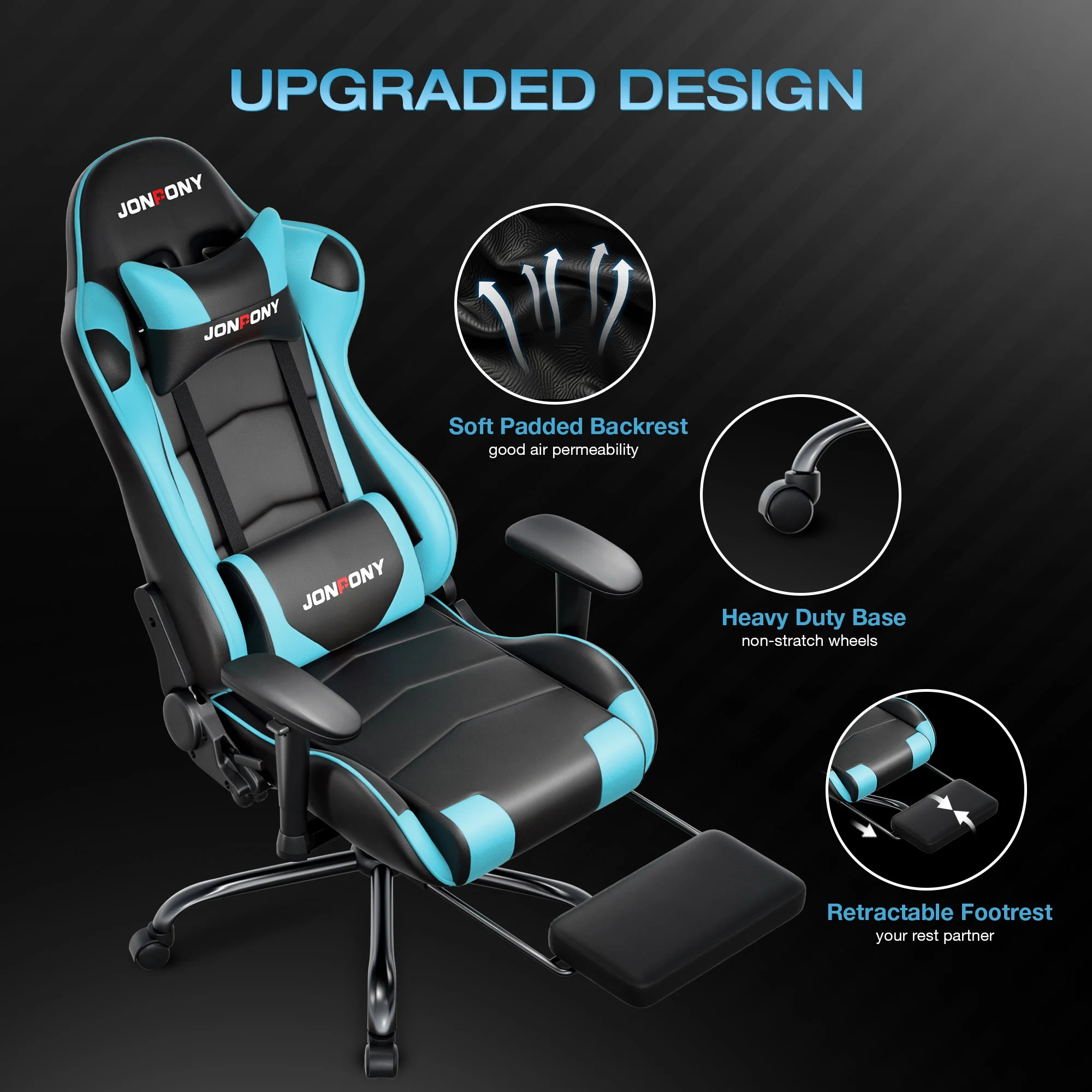 - ��Advanced Spring Cushioning��- The JONPONY gaming chair features advanced spring cushioning that elevates the user experience by balancing hip pressure distribution during seating. It also incorporates high-density foam sponge with exceptional rebound properties, adapting seamlessly to changes in sitting posture. The premium cushion material ensures long-lasting elasticity, transforming your gaming sessions into moments of pure enjoyment and relaxation.