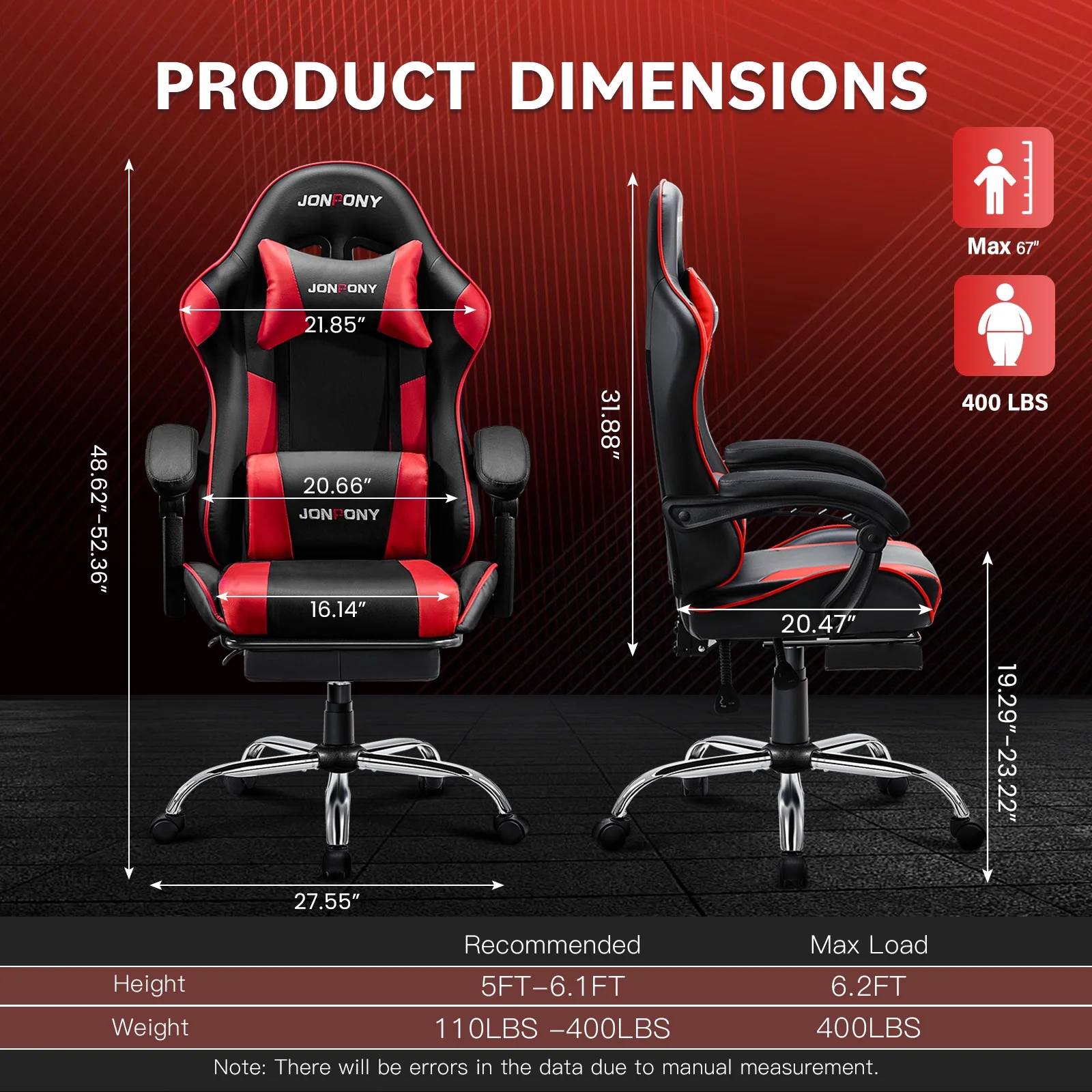JONPONY Big and Tall 500 lb Gaming Chair, Ergonomic Design, Gamer Chair PU Leather with Footrest and Lumbar Support, High Back Office Chair Support 8 Hours Long Sitting, Red Computer Chair, Red
