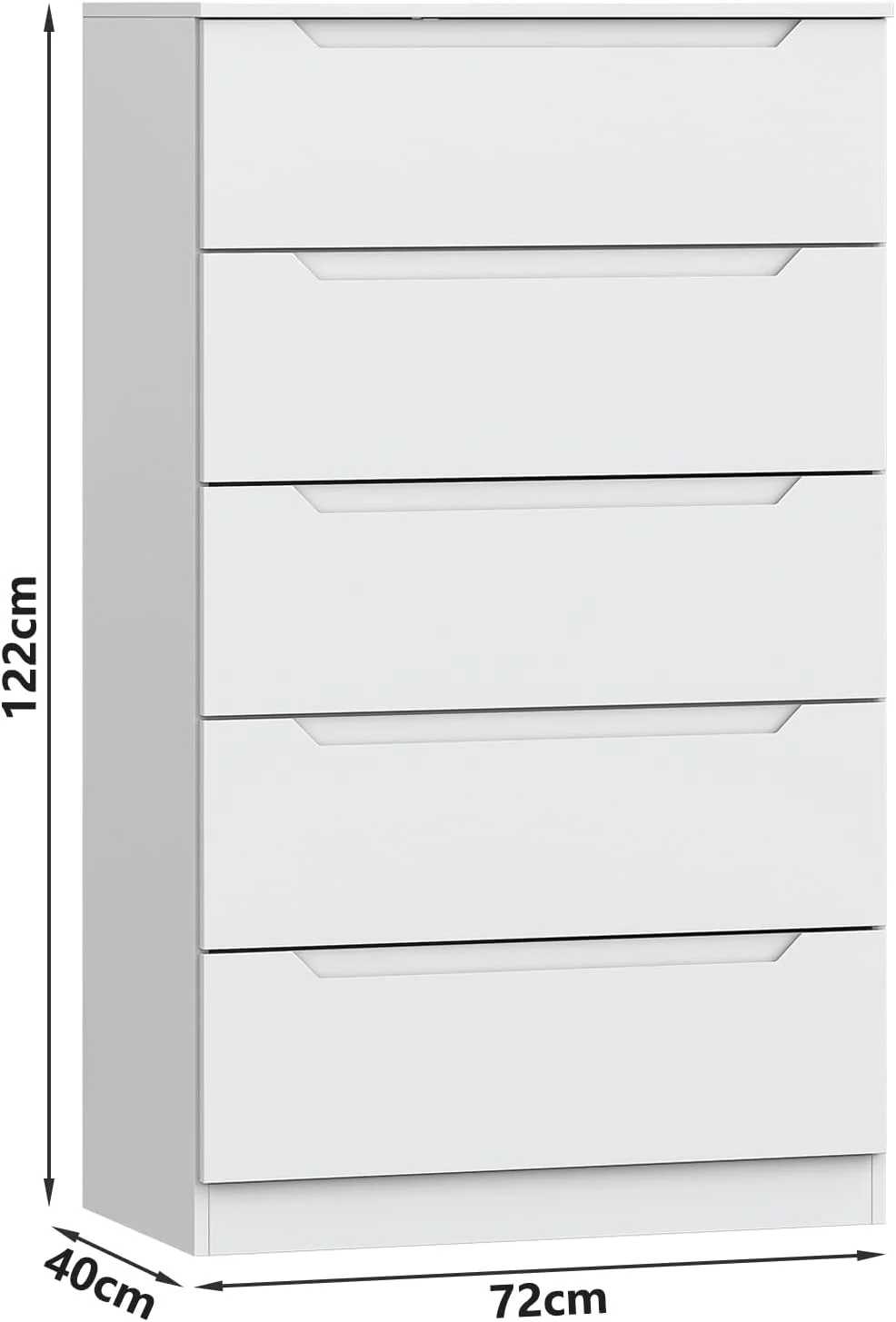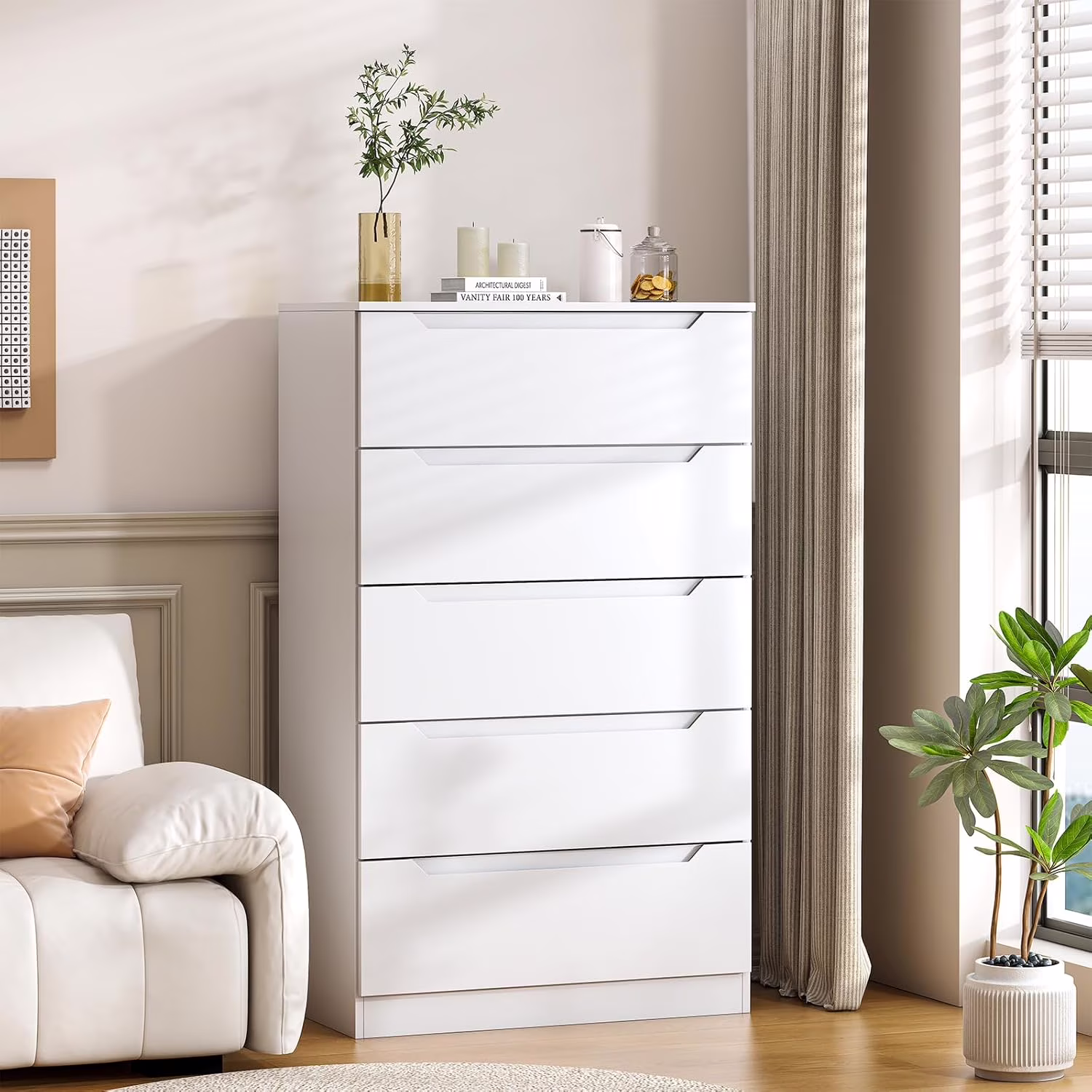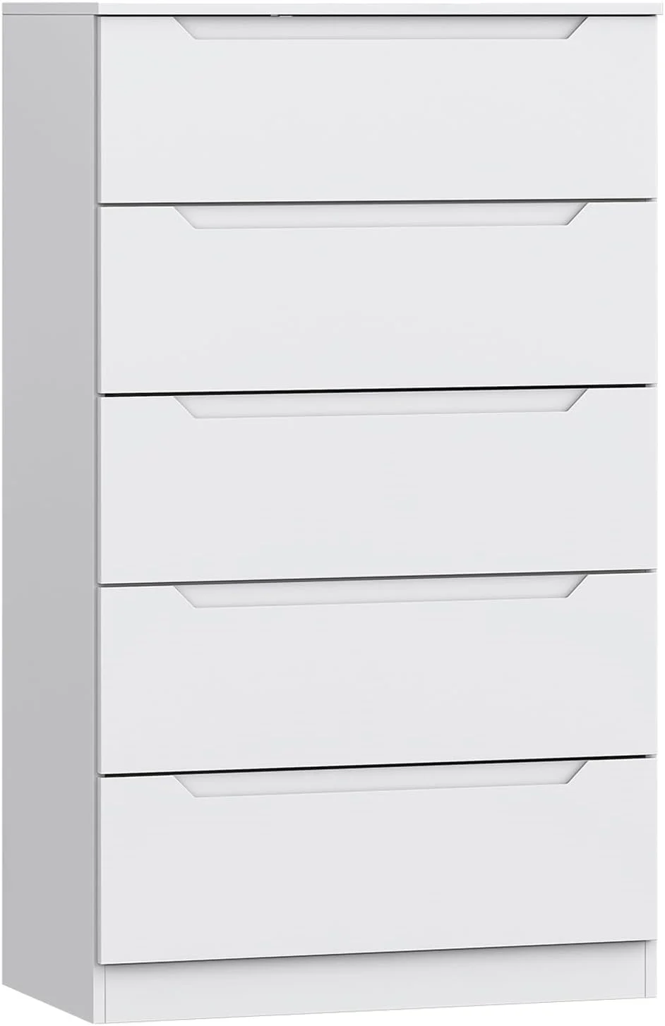 - ��STYLISH DESIGN��Created with clean lines and minimalist flat-front design, this white 5-drawer chest can easily fit in any decorative style. Unique cut-out handles and elegant fully closed base creates a contemporary, clutter free look for your space