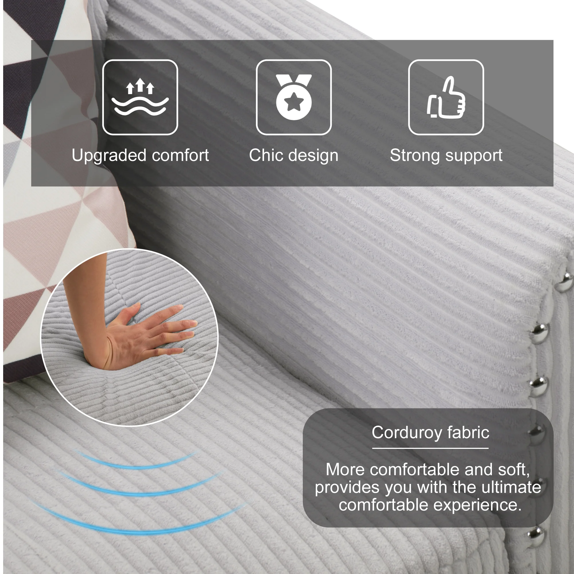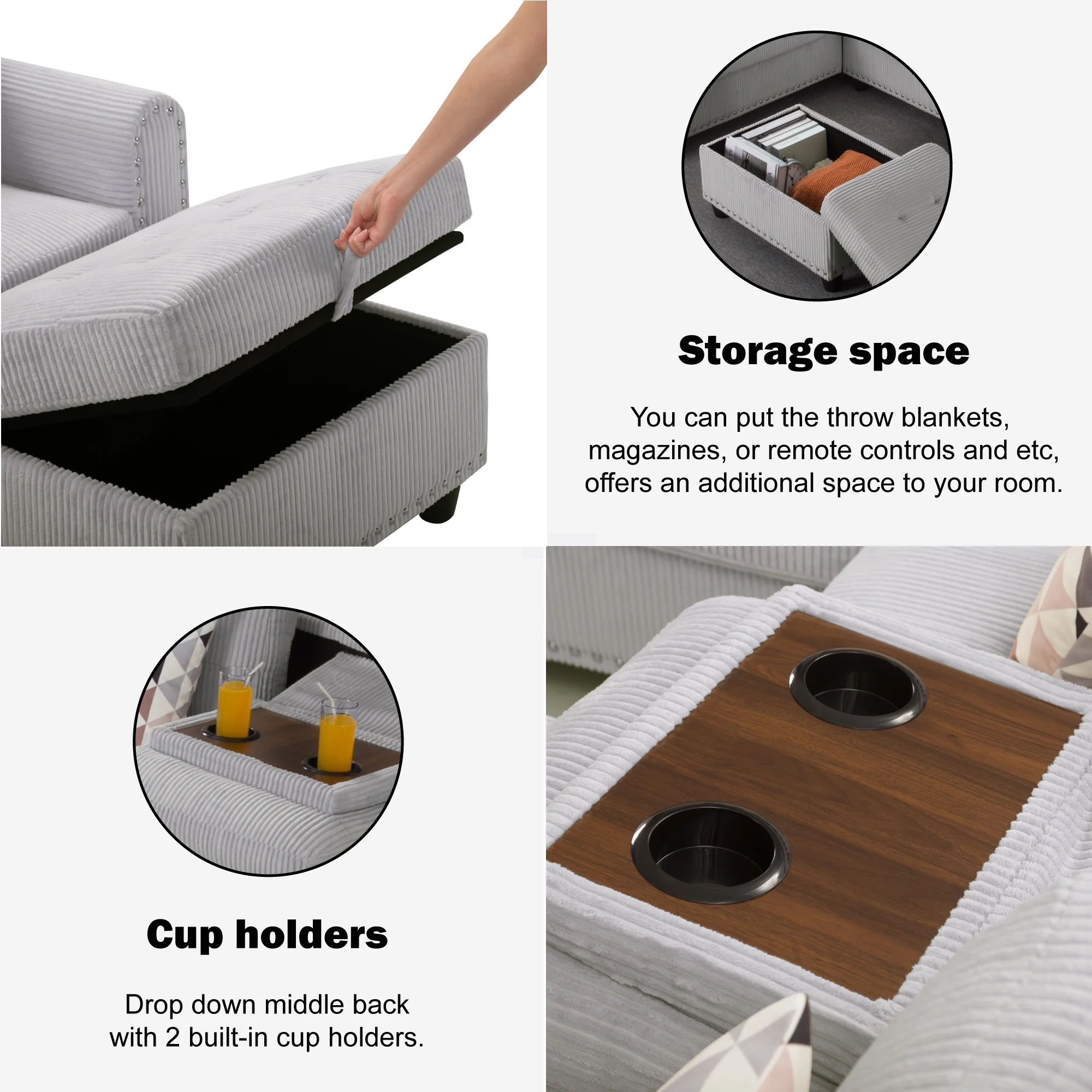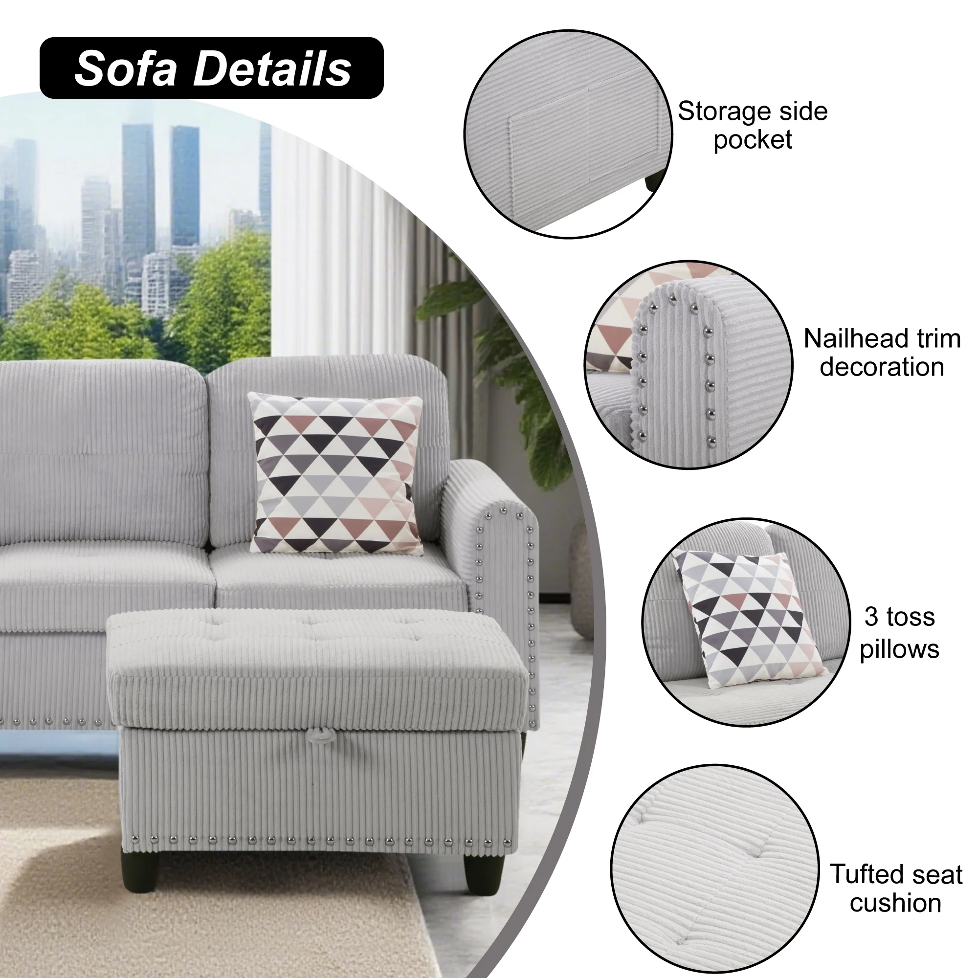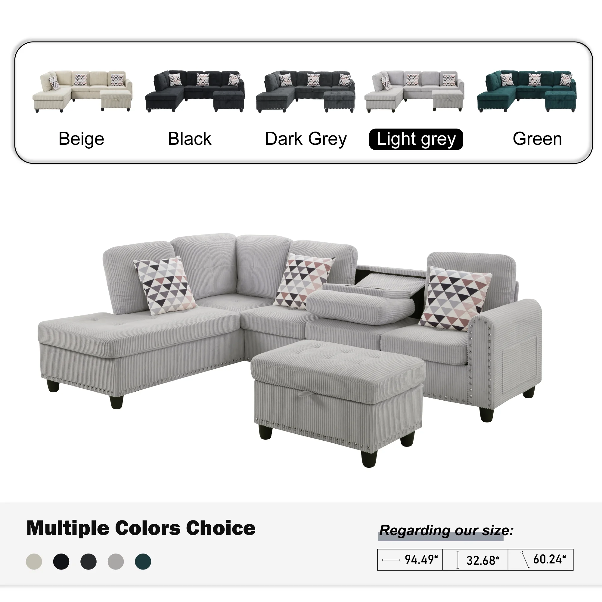 Ultimate Comfort��Indulge in superior comfort with this oversized sectional sofa set. Upholstered in soft corduroy fabric and filled with premium high-density foam, it offers a plush seating experience. Includes 5 matching toss pillows and movable ottomans.