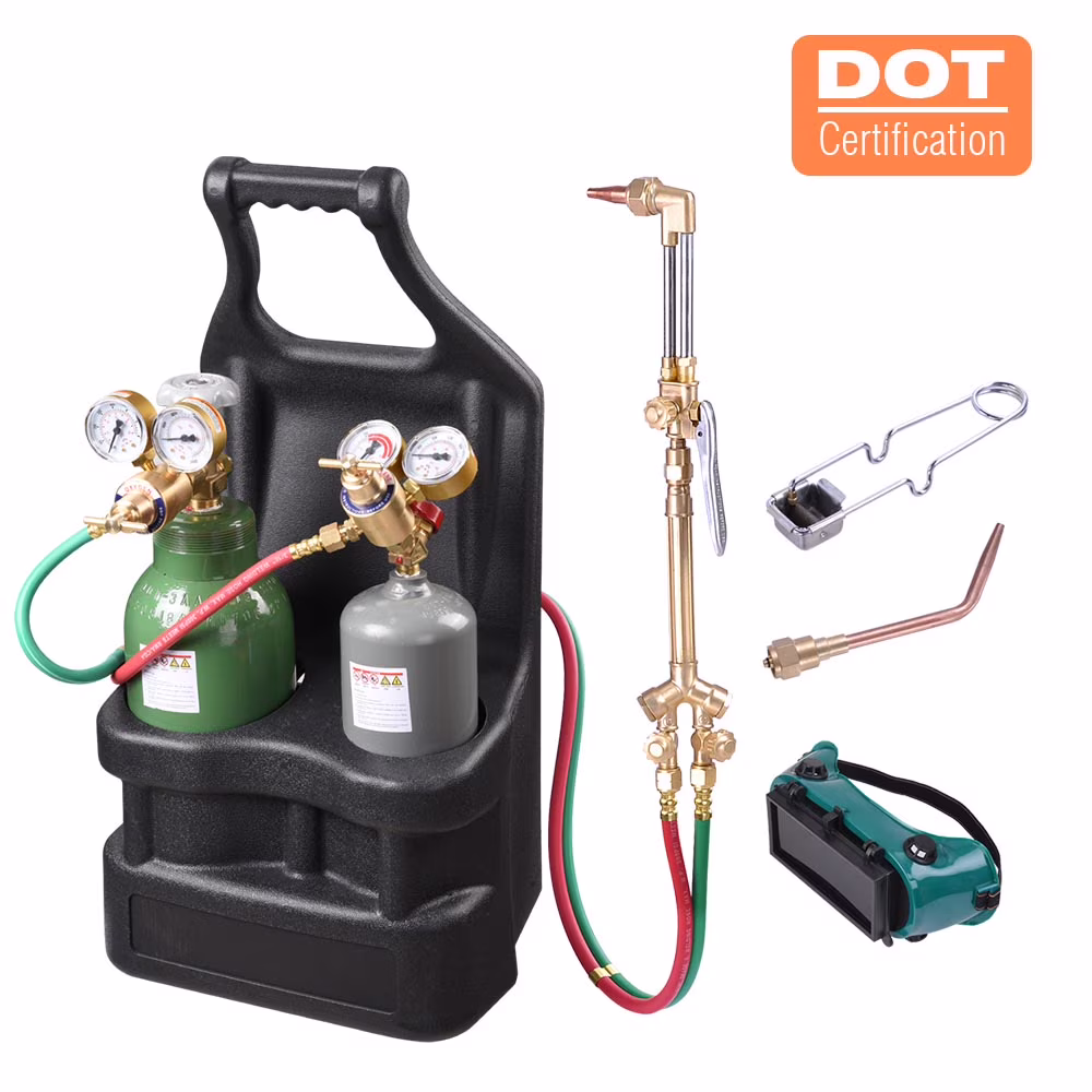 Welding Oxygen/Acetylene Torch Kit includes oxygen/acetylene regulators, tanks and a brass torch. All-in-one portable design for easy storage and transportation; A handy suitcase for easy carrying. Comes with DOT certification for the gas cylinder, sturdy & seamless steel to avoid heat inflation, ensure safety. ST14 steel gas cylinder, copper welding rod, tough brass torch handle for durability. Perfect for industrial or artistic use by automobile or air conditioner repairmen, maintenance personnel, etc