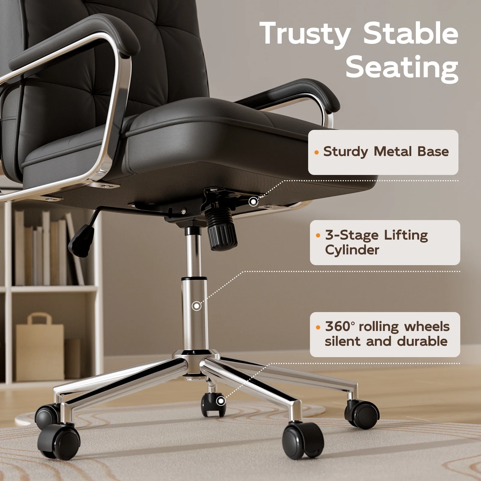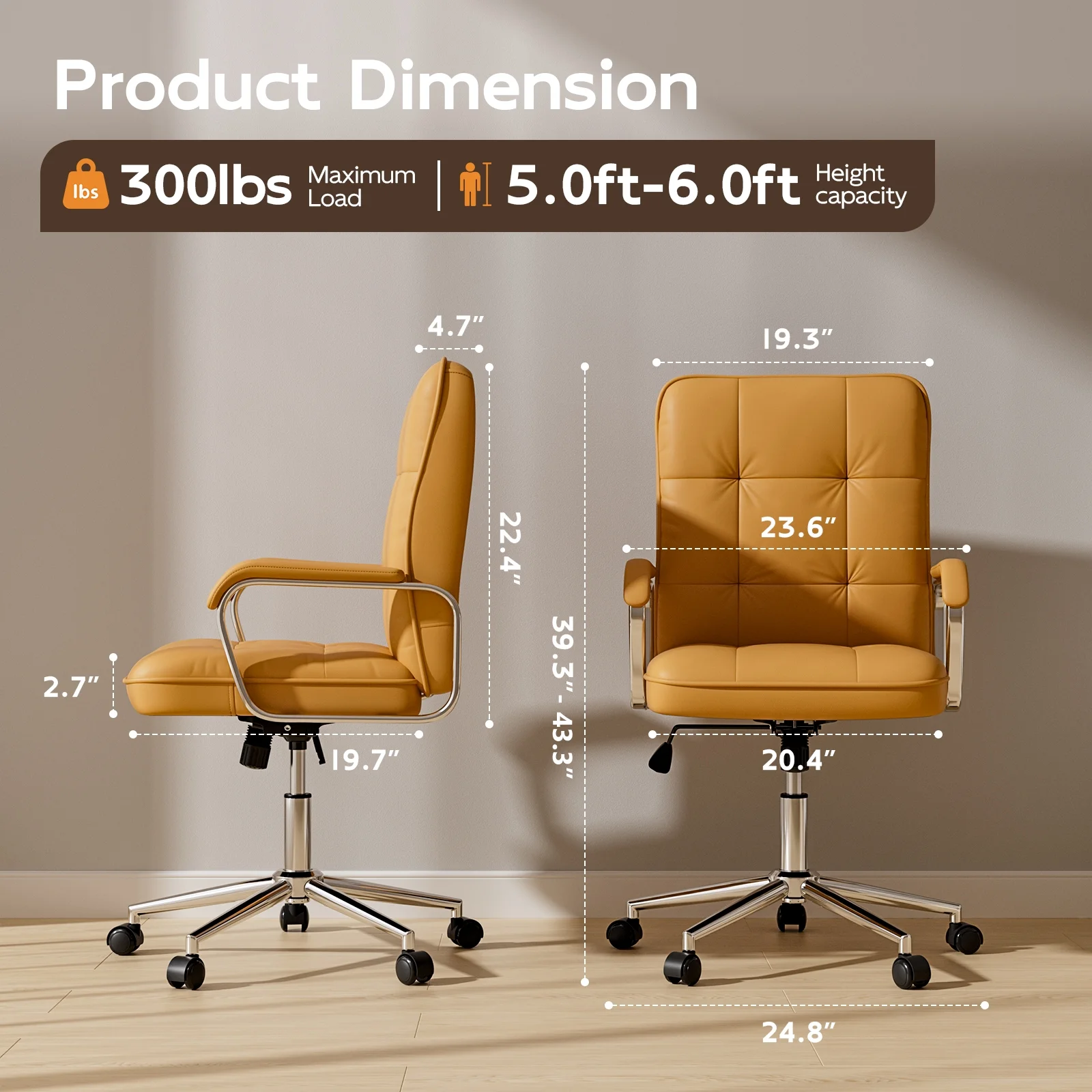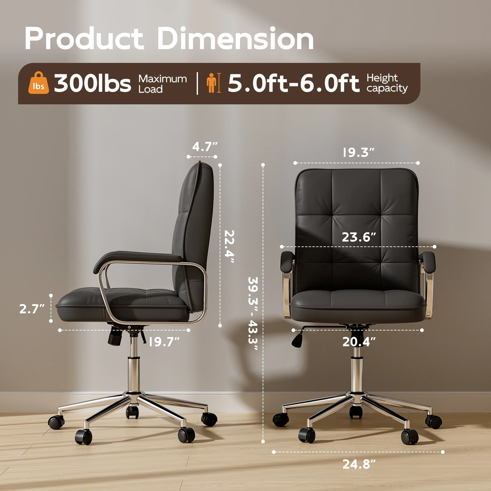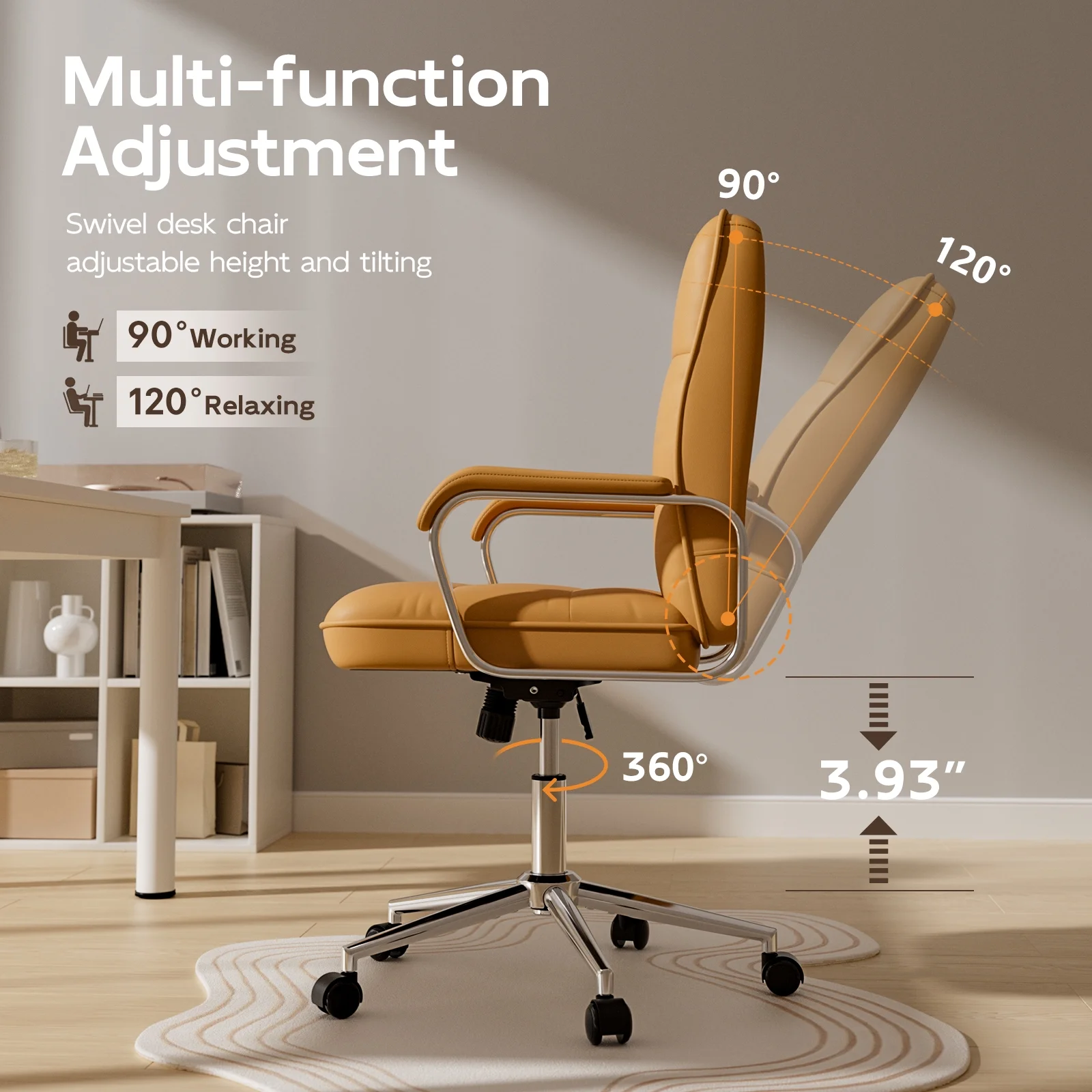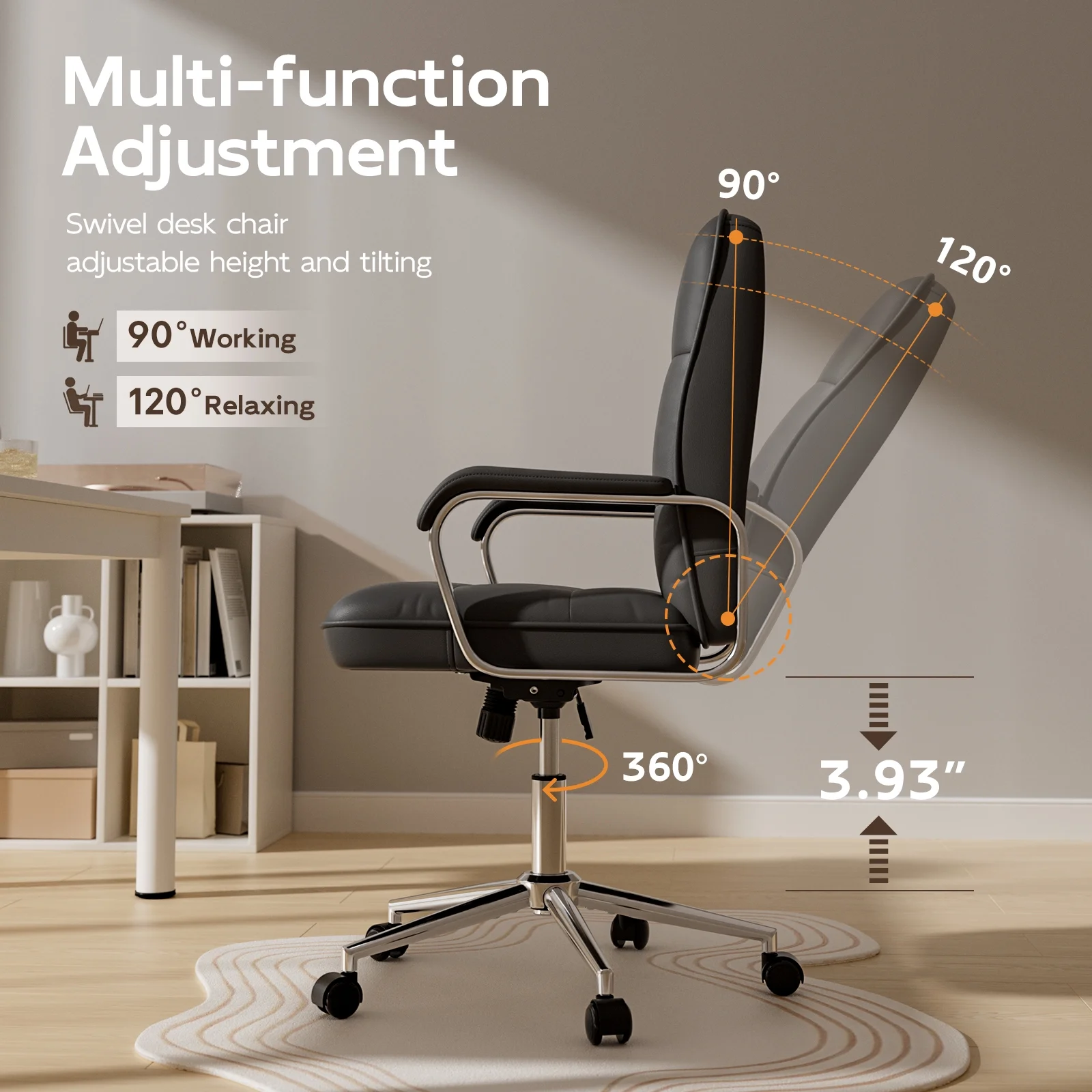 This executive office chair blends mid-century modern style with ergonomic features to provide excellent comfort and support. Made with PU leather, a sturdy metal frame, and padded foam with pocket springs, it supports up to 300 lbs. The chair offers smooth 360�� swivel motion, perfect for flexibility in any position. The adjustable backrest reclines from 90�� to 120��, while the padded armrests ensure extra comfort, making chair ideal as a reclining desk chair. The seat height is adjustable by 3.93 inches, and the BIFMA and SGS certified 3-stage lifting cylinder guarantees long-lasting durability. Designed for mobility, the 360�� quiet-rolling casters make this a reliable comfortable computer chair for any workspace. Whether you're looking for an ergonomic desk chair or a computer chair, this model provides the support you need. Overall dimensions: 24.8��(D) x 24.8��(W) x 39.37��~43.3��(H), with a seat size of 20.47��(L) x 19.7��(W).