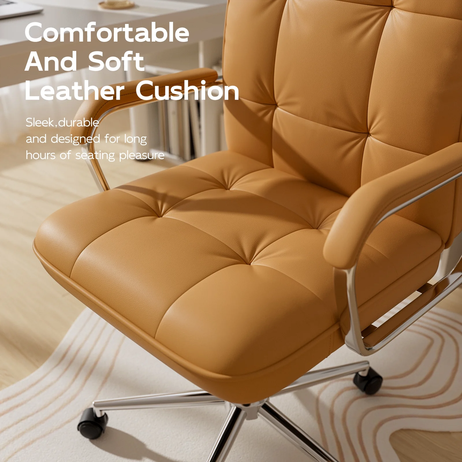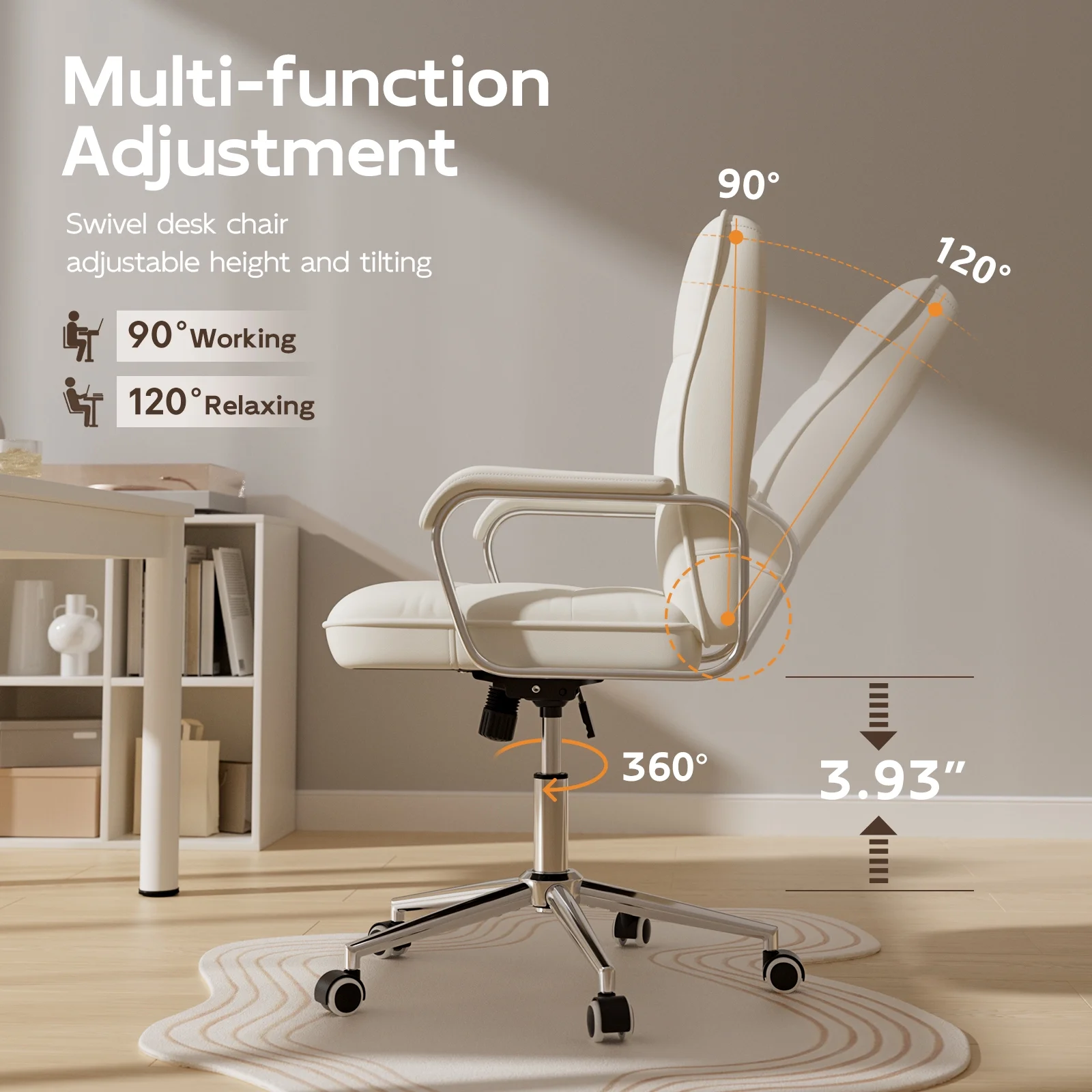 - ??360�� Swivel Design: Navigate your workspace effortlessly with the smooth 360�� swivel feature of this leather white desk chair, enhancing flexibility and productivity throughout your day.