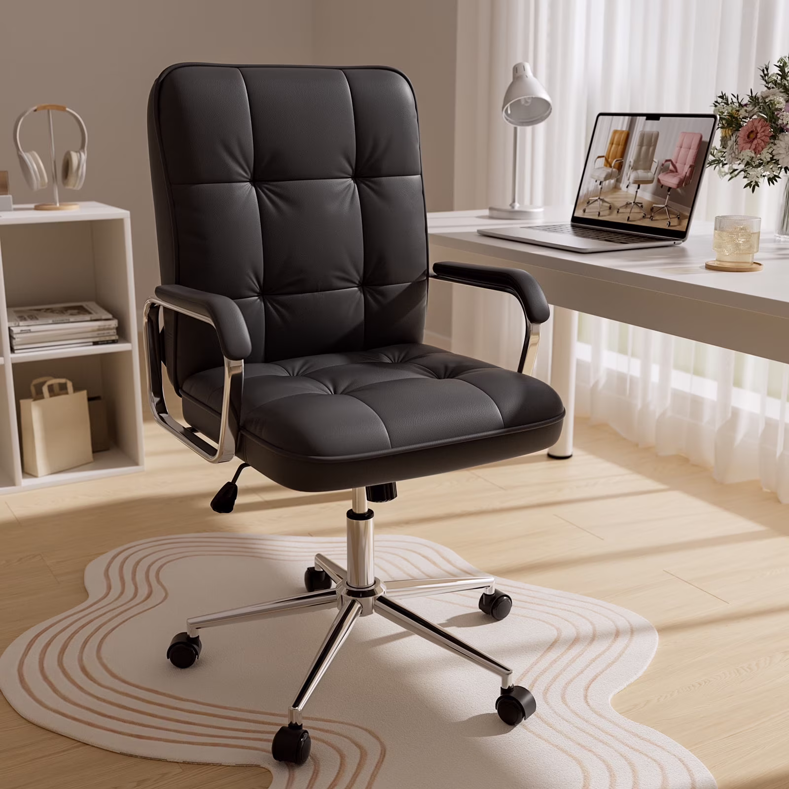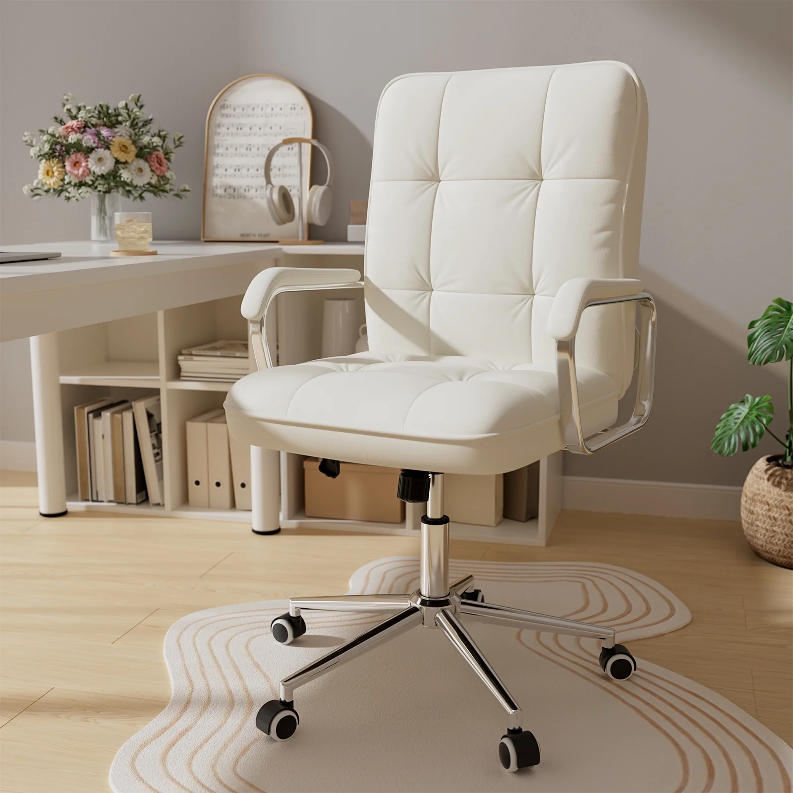 - ??Stylish Design: Add a touch of personality to your workspace with the charming design of this leather white office chair with armrest, combining both style and functionality to create a delightful office environment.