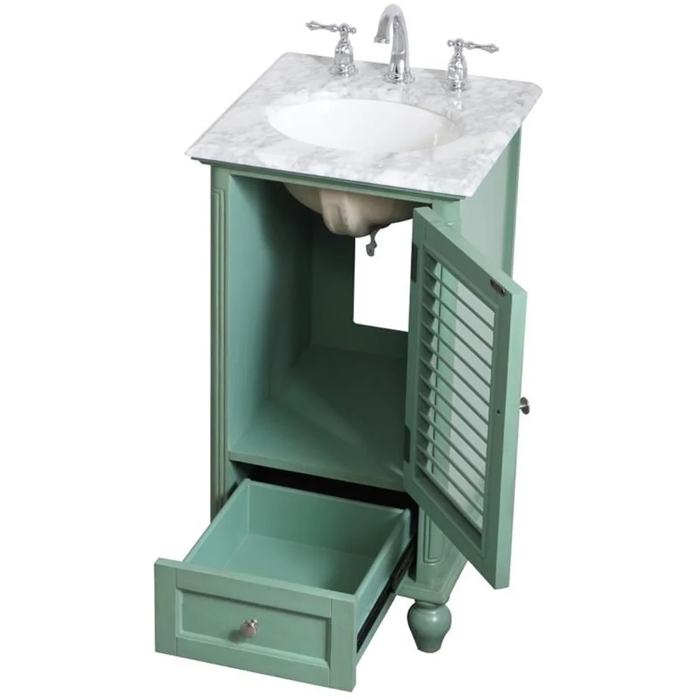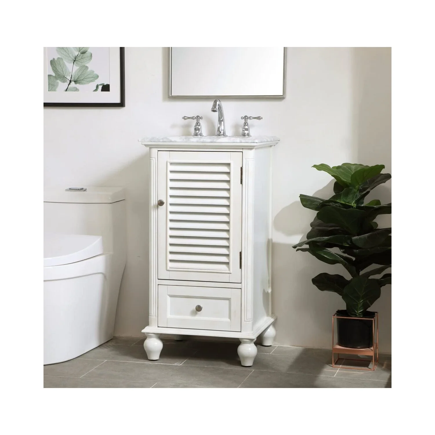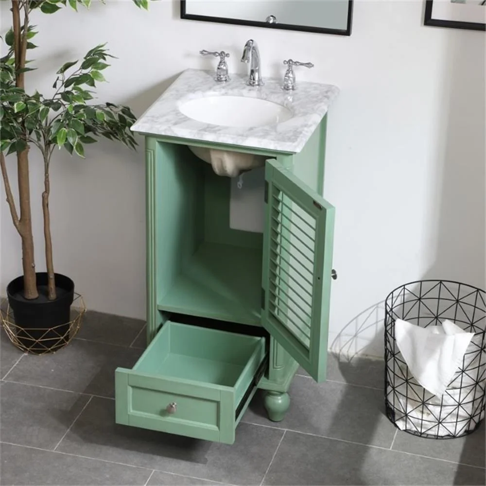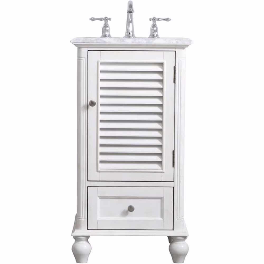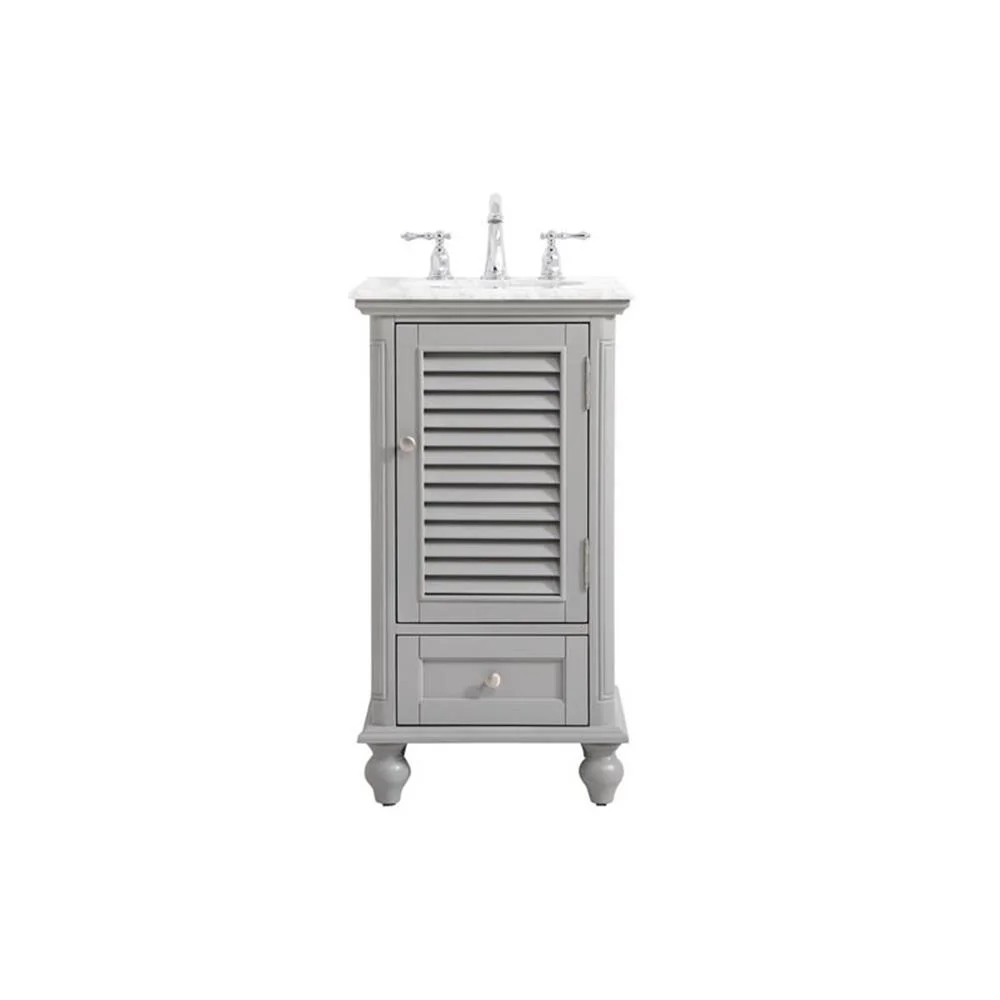 A small space doesn't mean you have to settle for less. The Rhodes collection compact vanity will add lovely sophistication and complement any small bathroom or powder room, while utilizing its charm and function to provide you with ample storage spaces. Metal round knobs gently adorn the shuttered cabinet door and drawer at the base, allowing for you to store away your bathroom essentials. The Carrara white marble countertop, porcelain undermount sink, dignified subtle engravings on the side edges, and rounded legs all come together to create contemporary beauty. Work with your space, and design a beautiful room, no matter the size.