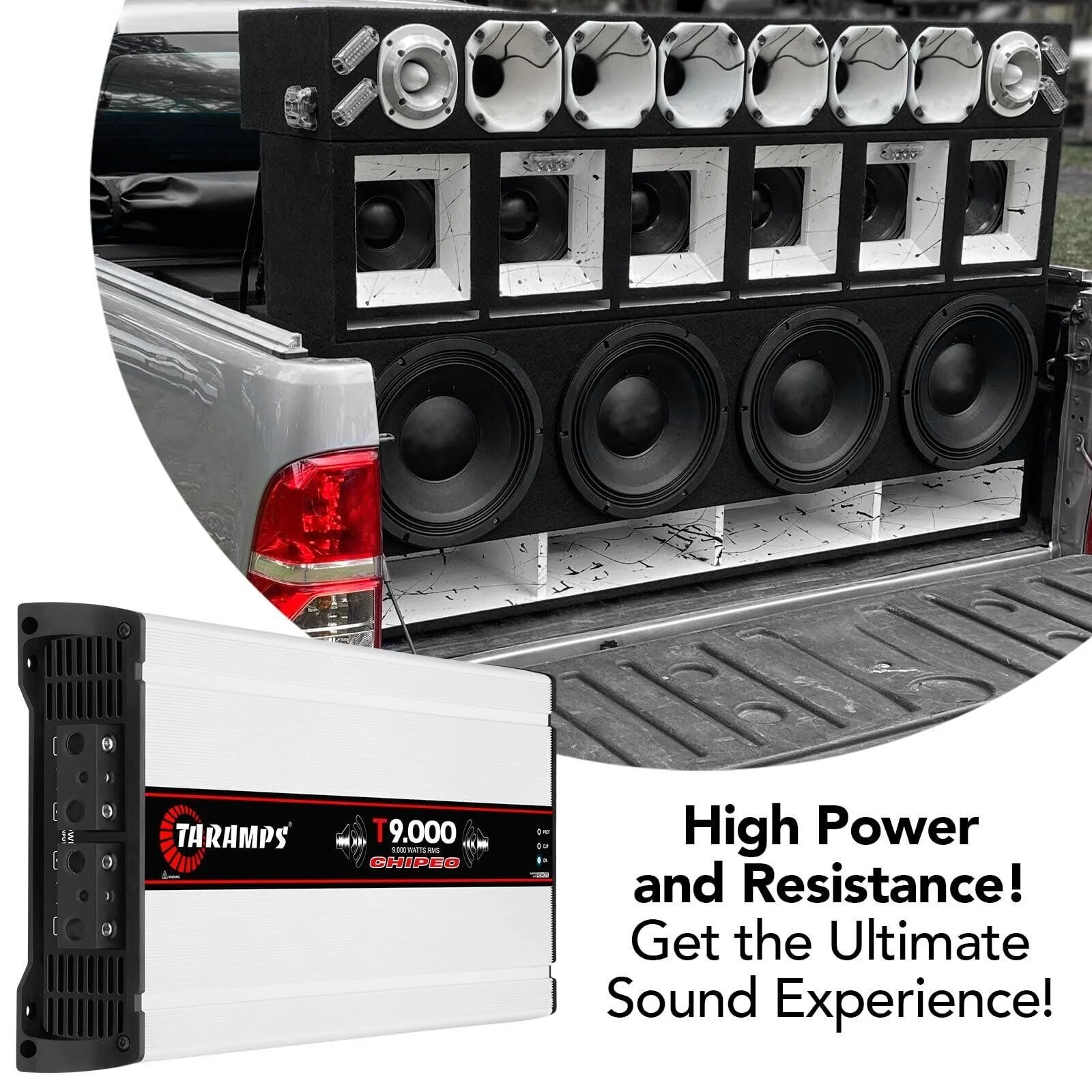 - Feel the difference with the Taramps T9000 Chipeo, an amplifier that redefines the standards of musical performance. Available in 1 or 2 Ohm versions, this fantastic amplifier offers an impressive 9000 WRMS at 12.6 Volts, and can reach an astonishing 11,000 WRMS at 14.4 Volts. With a wide frequency response of 5Hz to 5kHz, it covers sub-bass, bass, mid-bass and mid. Experience much more strength, quality, efficiency and resistance, and take your sound experience to a new level.