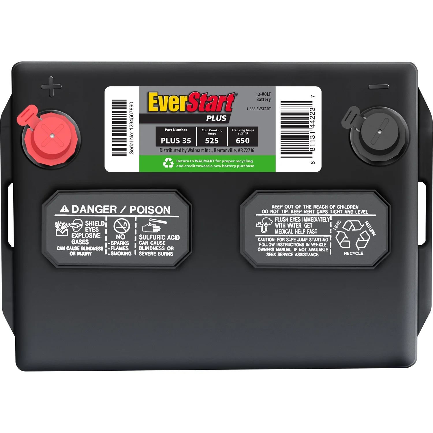 Get your car started and running again with the installation of the EverStart Plus Automotive Battery, Group Size Plus 35. Offering reliable starting power and a two year warranty this battery is a great economical choice. Compatible with a range of makes, models and years, it has conveniently located top posts for easily connecting positive and negative terminals. This 12 volt lead acid automotive battery delivers 525 cold cranking amps with 100 minutes of reserve capacity for reliable starts in all weather. This battery is maintenance free and can be conveniently installed and tested at a local Walmart Auto Care Center.