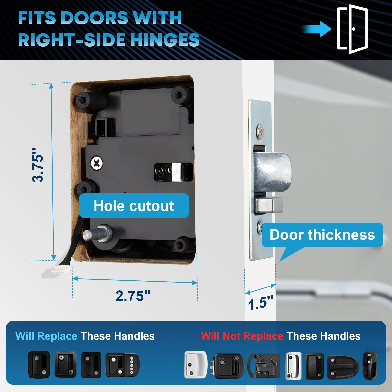 VERSATILE DOOR LOCK: The RV keyless entry door lock fits most RV doors with an opening size of 3.75"x 2.75"x 1.5". Please measure your RV door opening size before purchasing. It can be widely applied in travel trailers, campers, trucks, horse trailers, cargo haulers, etc.