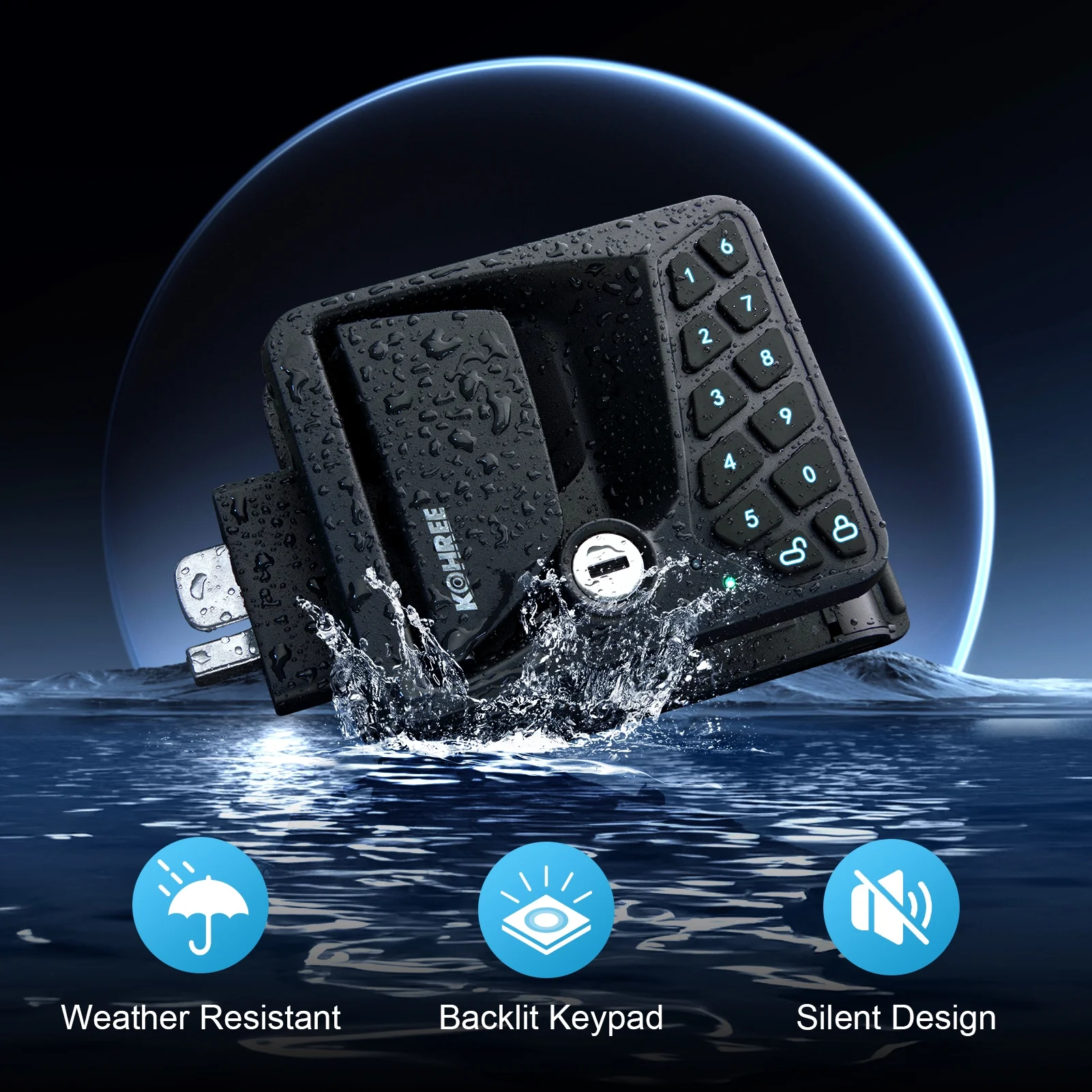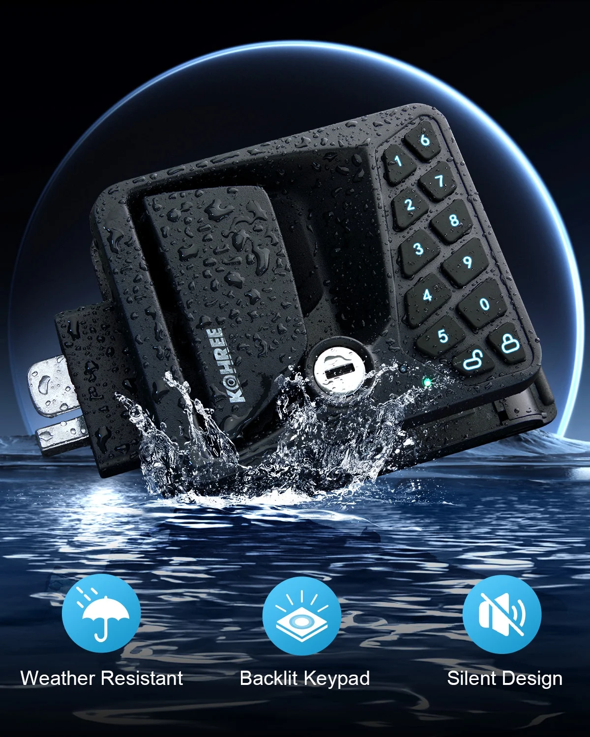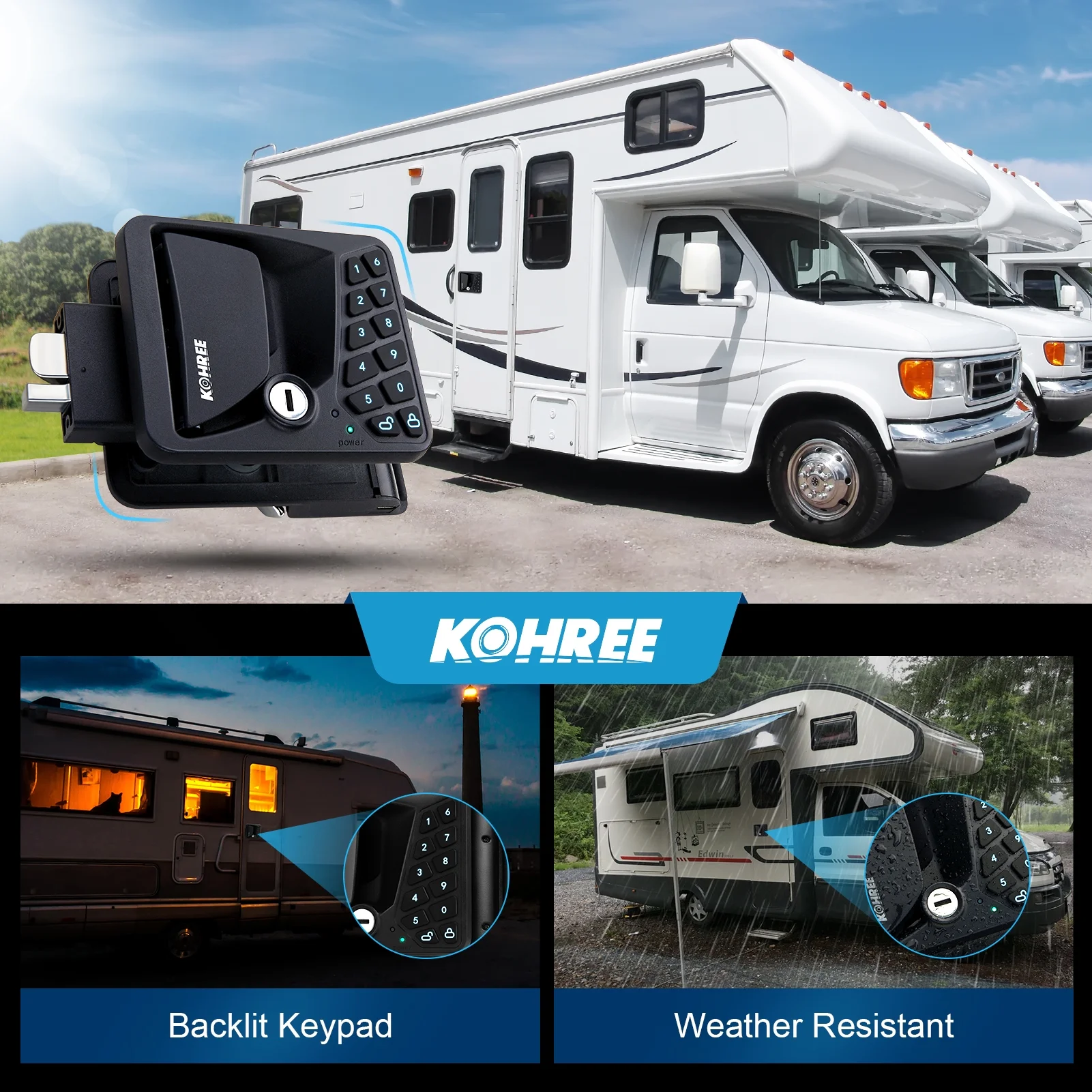 Kohree RV door lock provides keyless entry via a password keypad or remote key fob (12m/40ft range), eliminating the need for physical keys (U.S. patent pending). Designed for safety, it features an IP66 waterproof, all-metal build and a Grade C anti-theft lock cylinder for robust security. Compatible with RV doors sized 3.75"x2.75"x1.5", it suits trailers, campers, trucks, and more. Installation is quick and DIY-friendly, securing both the exterior handle and deadbolt in one step with simple wiring and screwing (under 10 minutes). Enhanced for outdoor use, it includes an LED backlit keypad for nighttime visibility, ensuring convenience and durability in varied conditions.