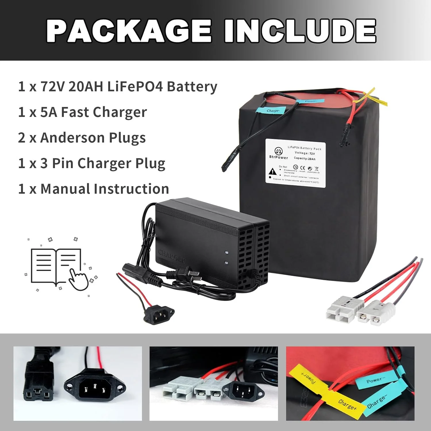 - ��Product Contains�� 1x72V 20AH LiFePO4 Battery(4.7In*7.9In*8.7In ),1x5A Charger,1x3Pin connector,2xAnderson connector,1xManual,We have US warehouse and package will be delivered within 2-5 business days.The 72V battery can perfectly replace the 36V 48V 52V battery!
