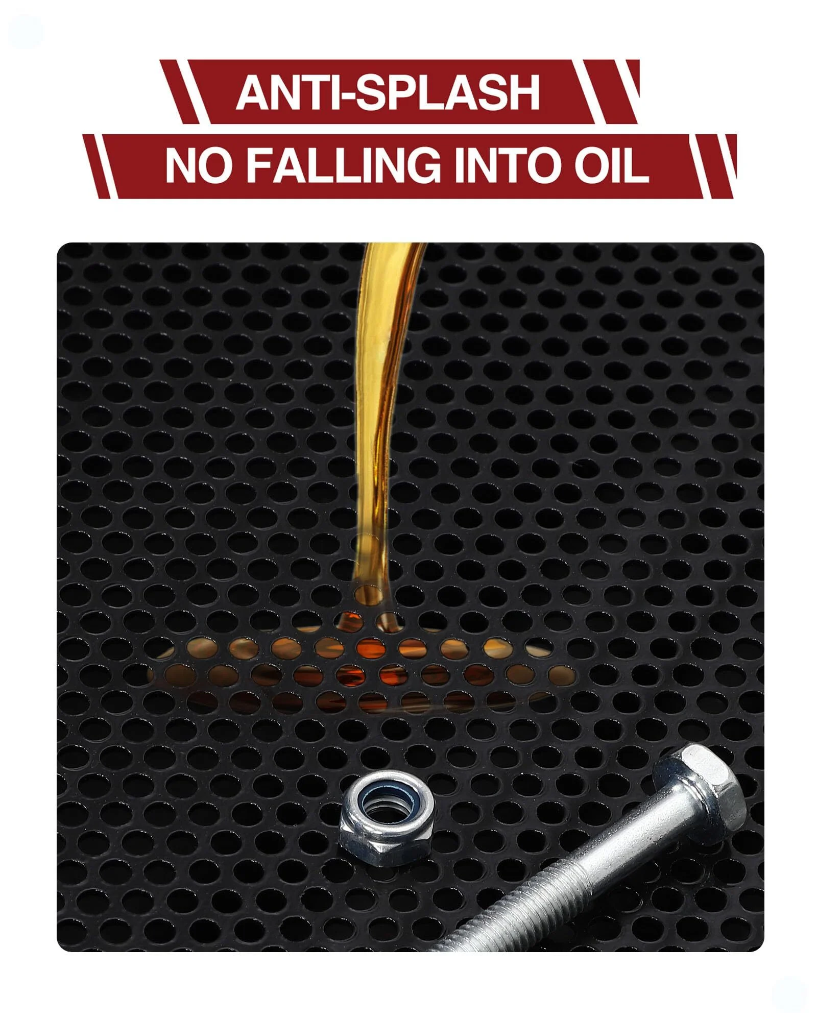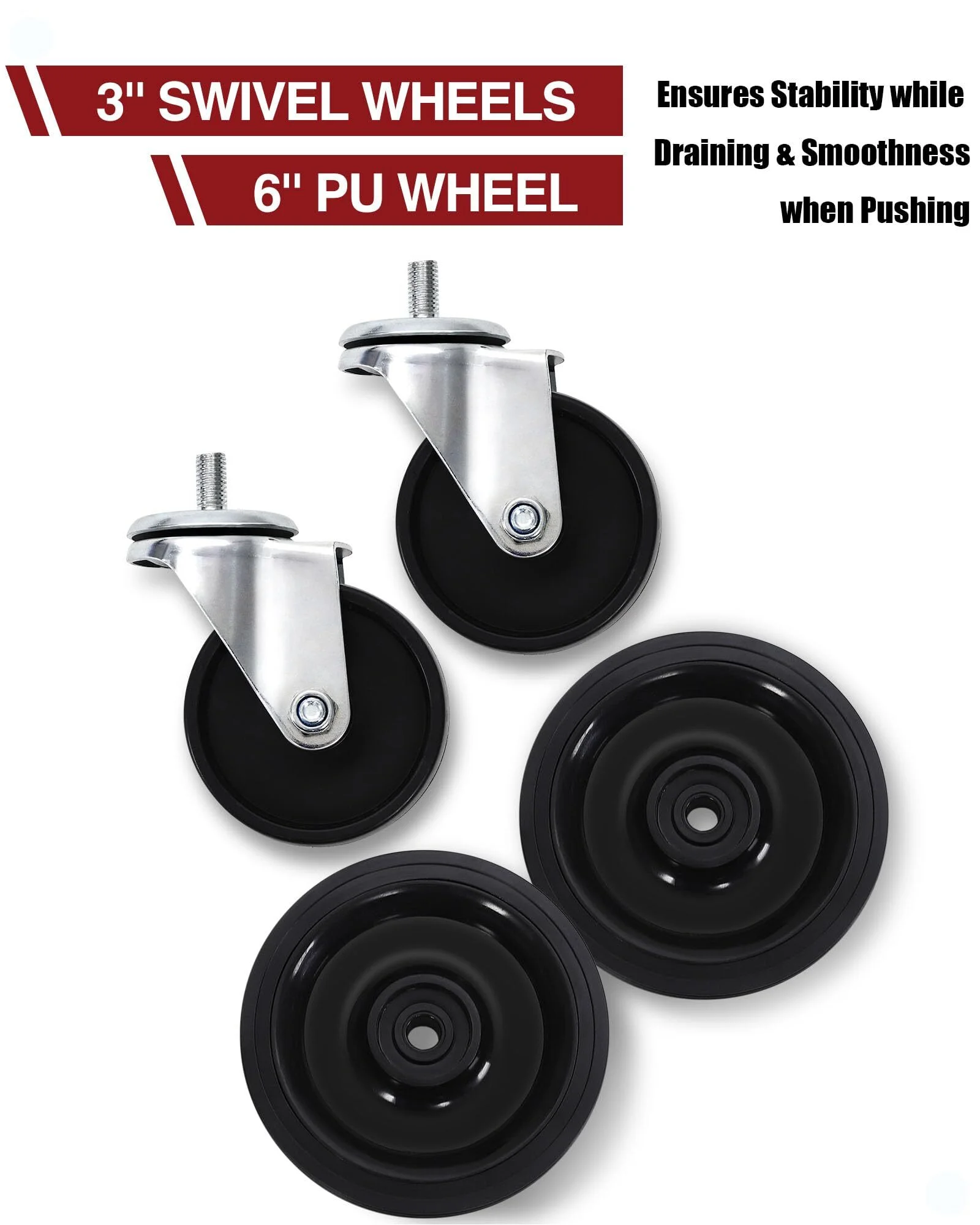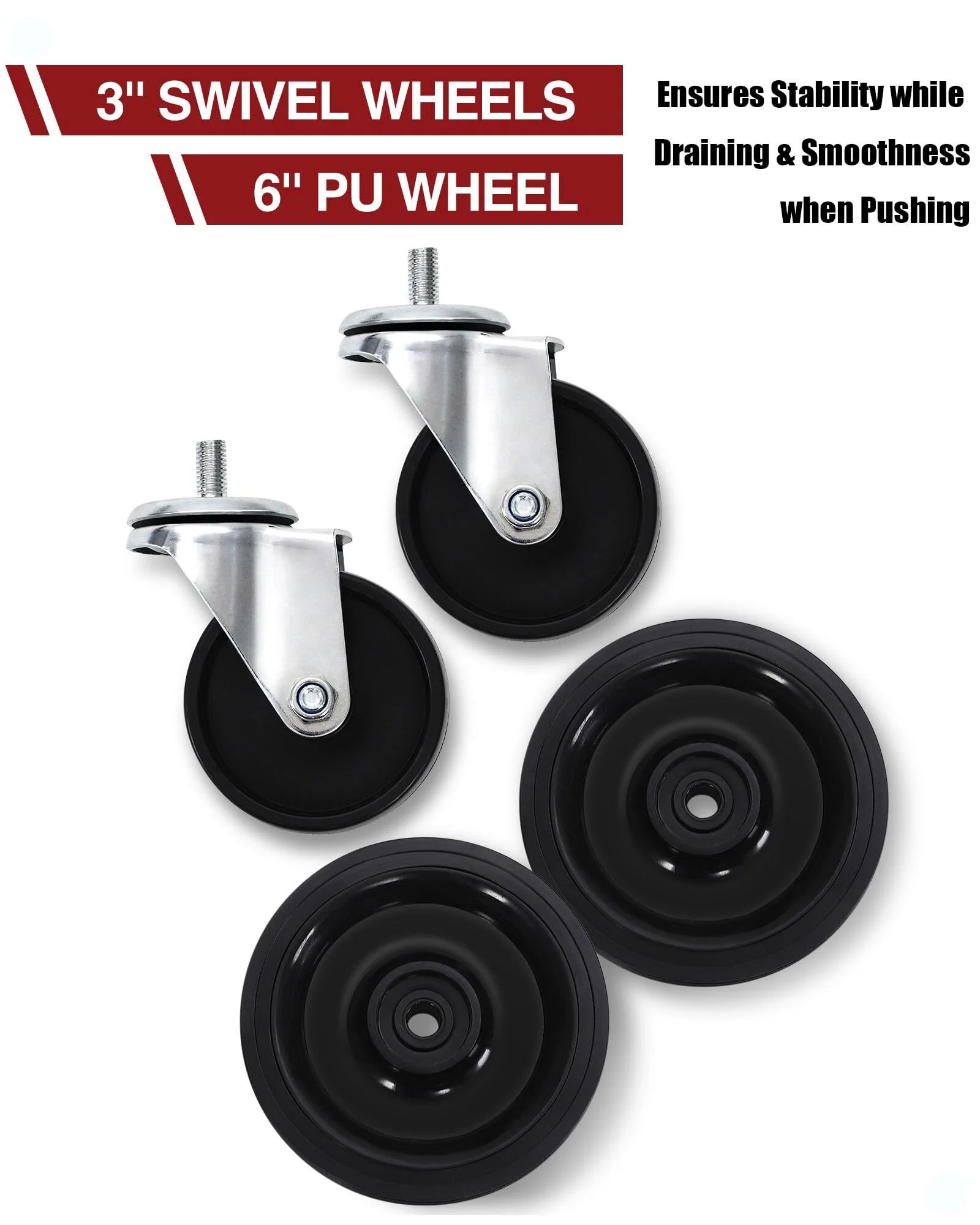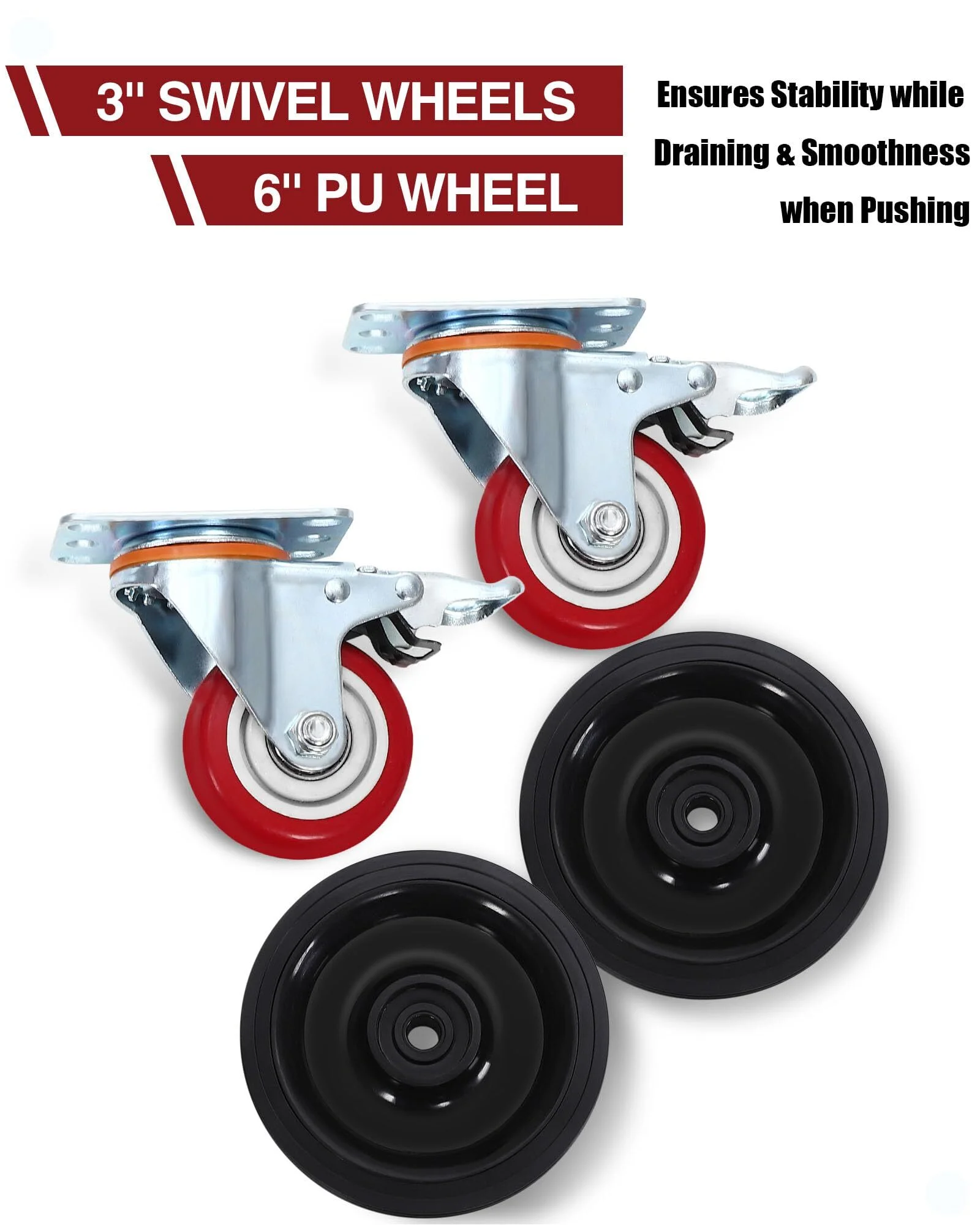 - ??��CASTER DESIGN��- RIEDHOFF oil drain pan features four caster wheels (two fixed and two free), that allow for easy mobility and positioning, making oil-changing a breeze. The fixed wheels provide stability and support, while the free wheels allow for smooth movement around the garage or workshop floor.