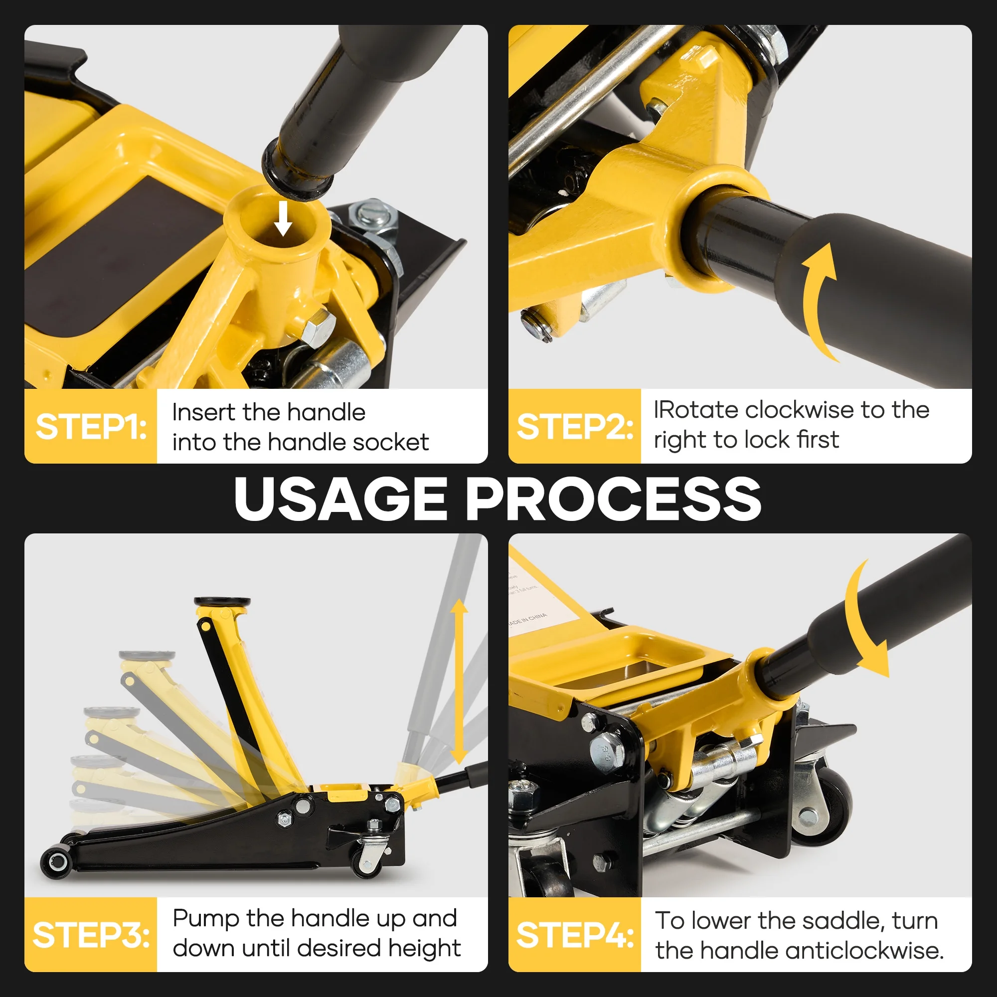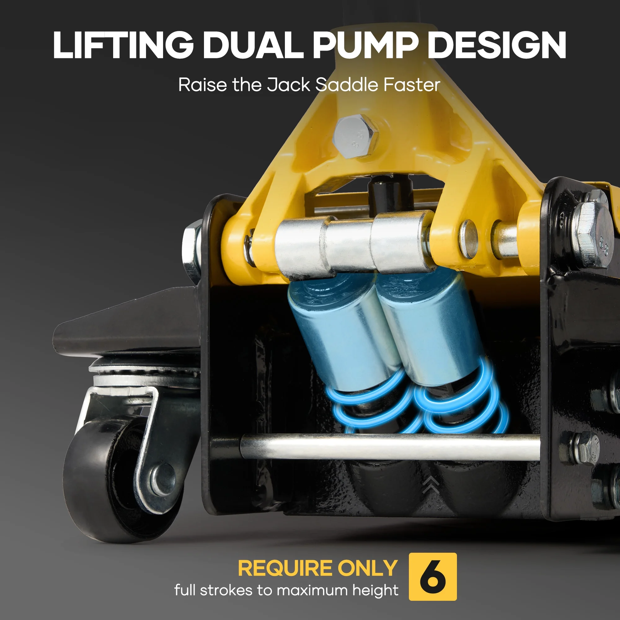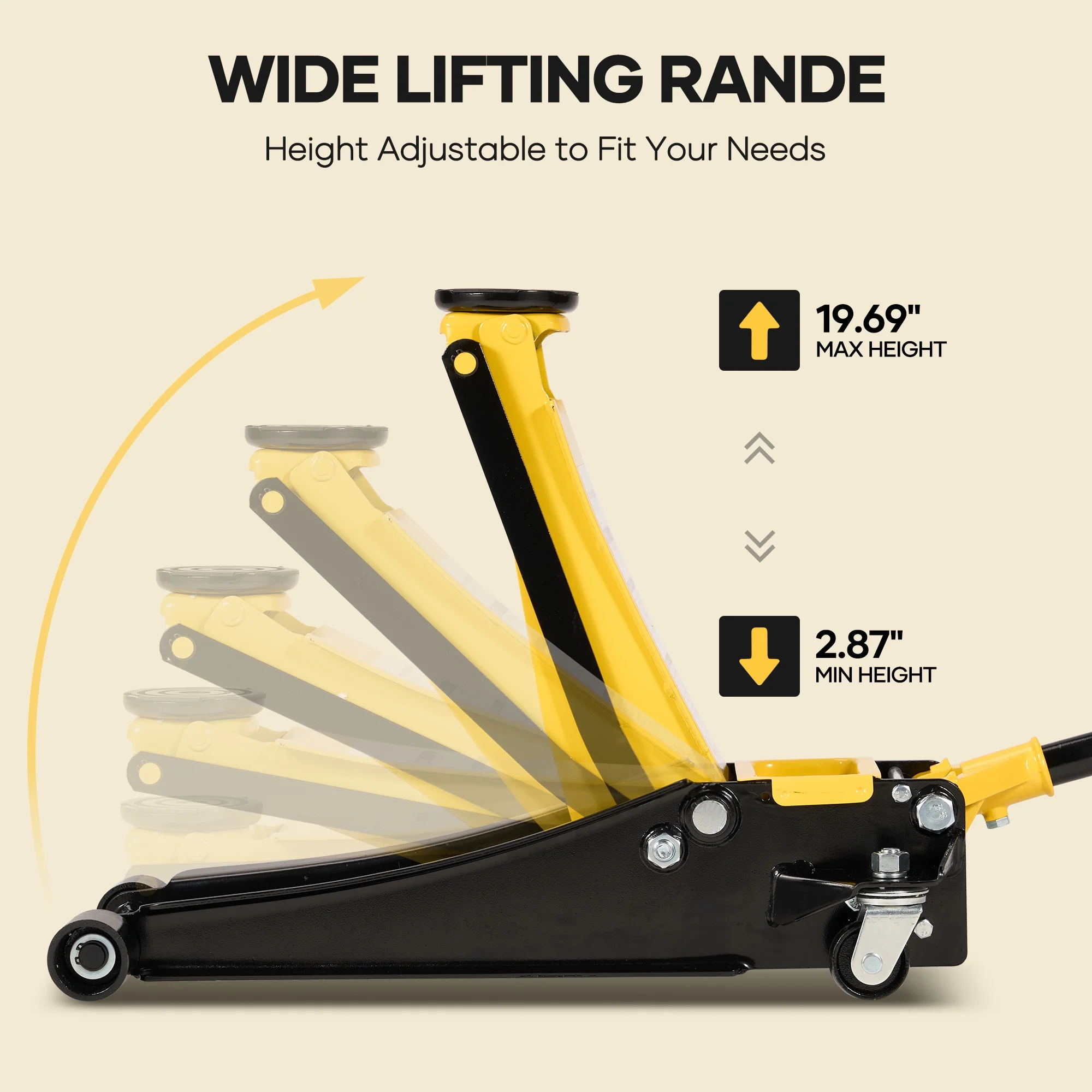 With a lifting height range from 2.87" to 19.69", it accommodates a variety of vehicles including family cars, SUVs, and light trucks. Its dual pump design allows for rapid lifting, taking only six strokes to reach maximum height, and the user-friendly features like four swivel casters, a non-slip rubber saddle.