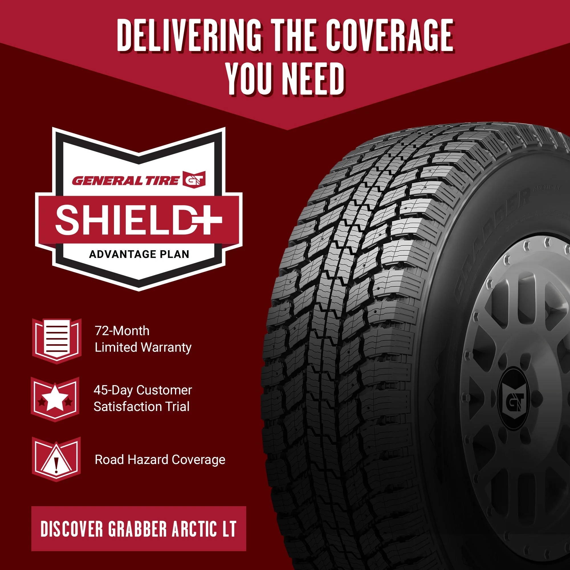 The General Grabber Arctic LT is a winter tire for light trucks and SUVs that can be pinned with studs (where permitted). Ideal for heavy-duty traction on wet, snow, and ice-covered roads, the Grabber Arctic LT features General's Duragen Technology that enhances strength and durability, delivers cut-and-chip resistance, and extends tread life.