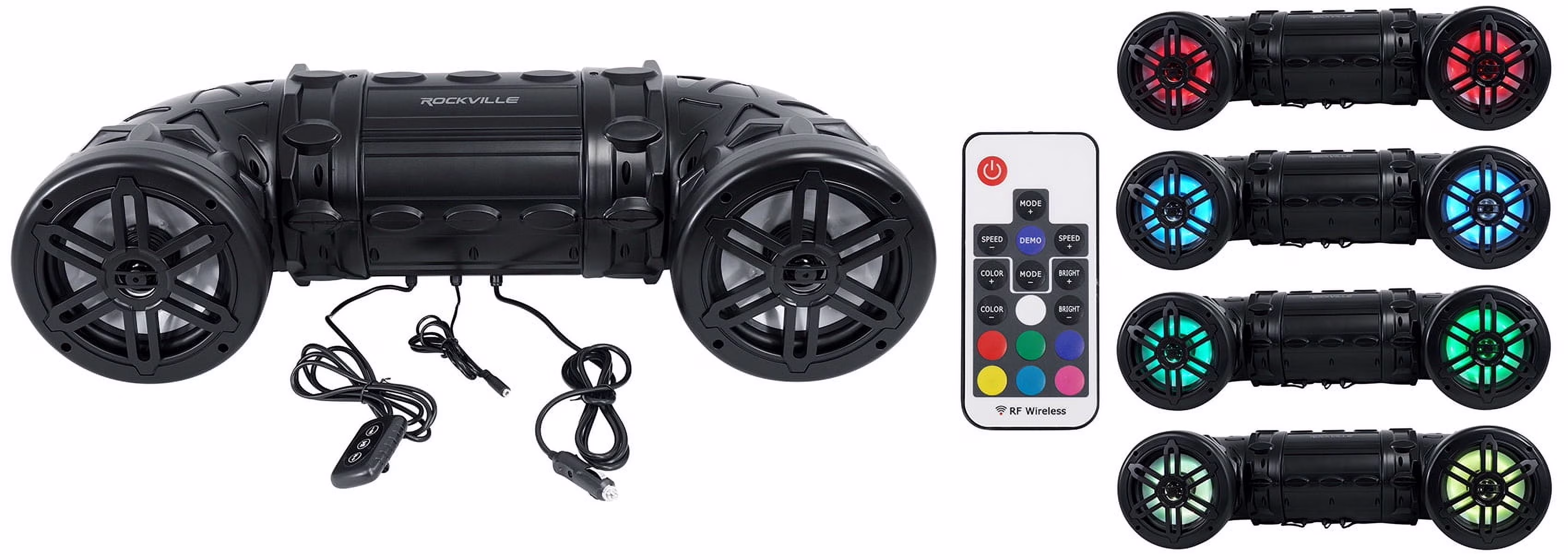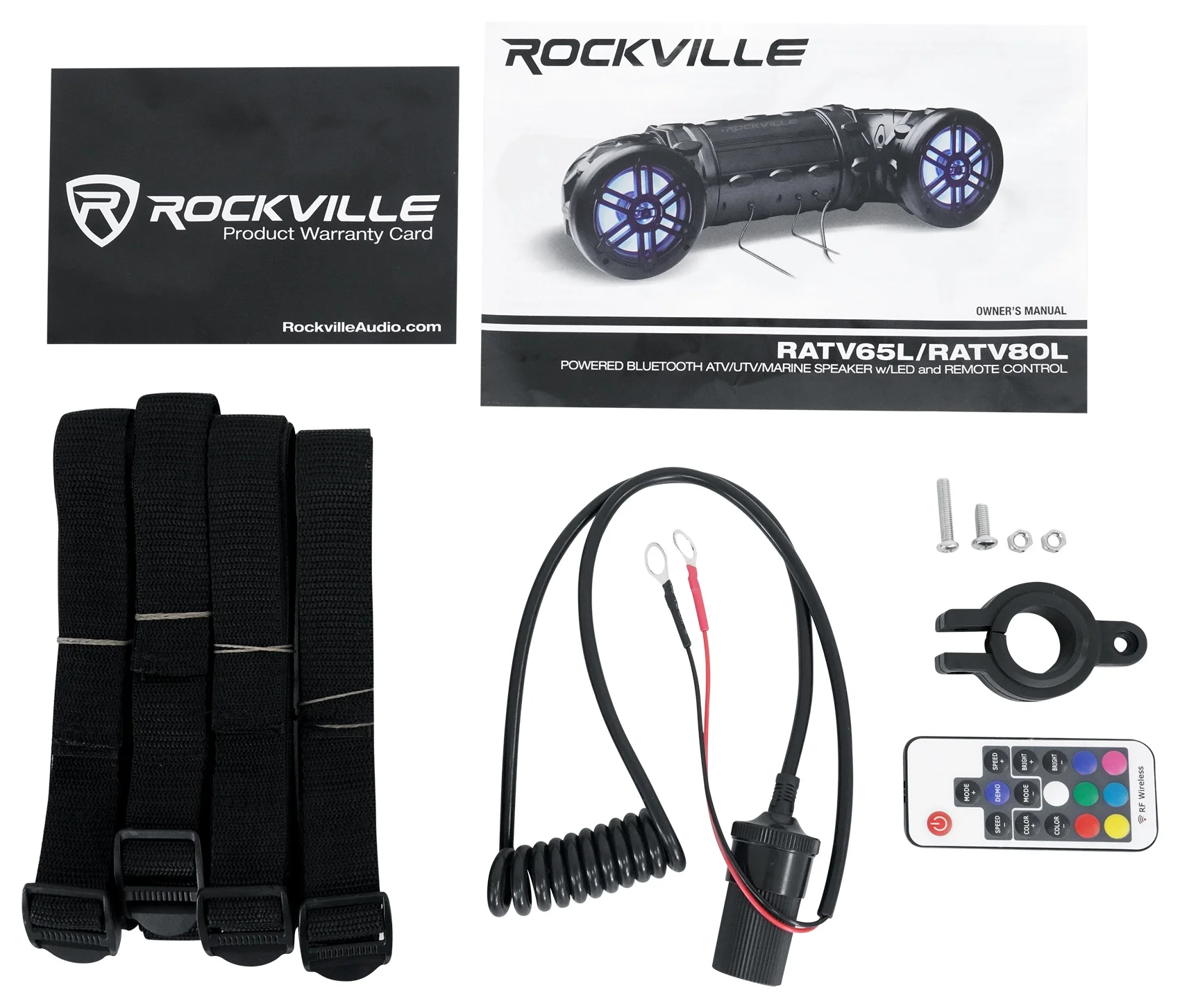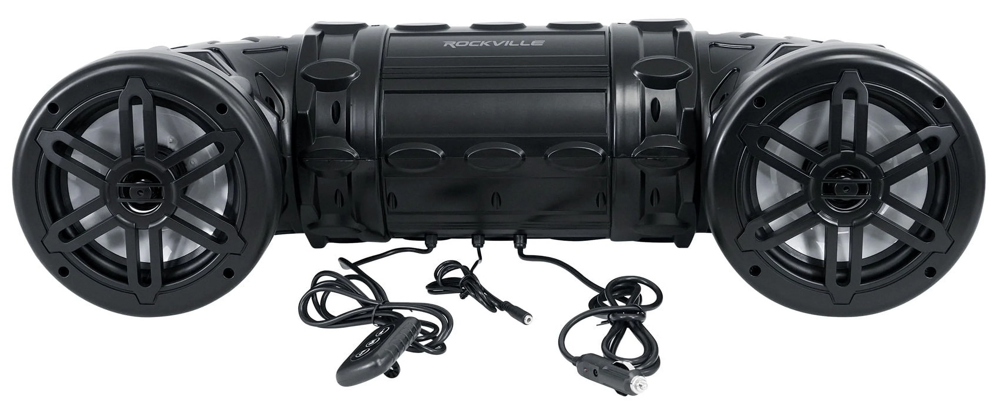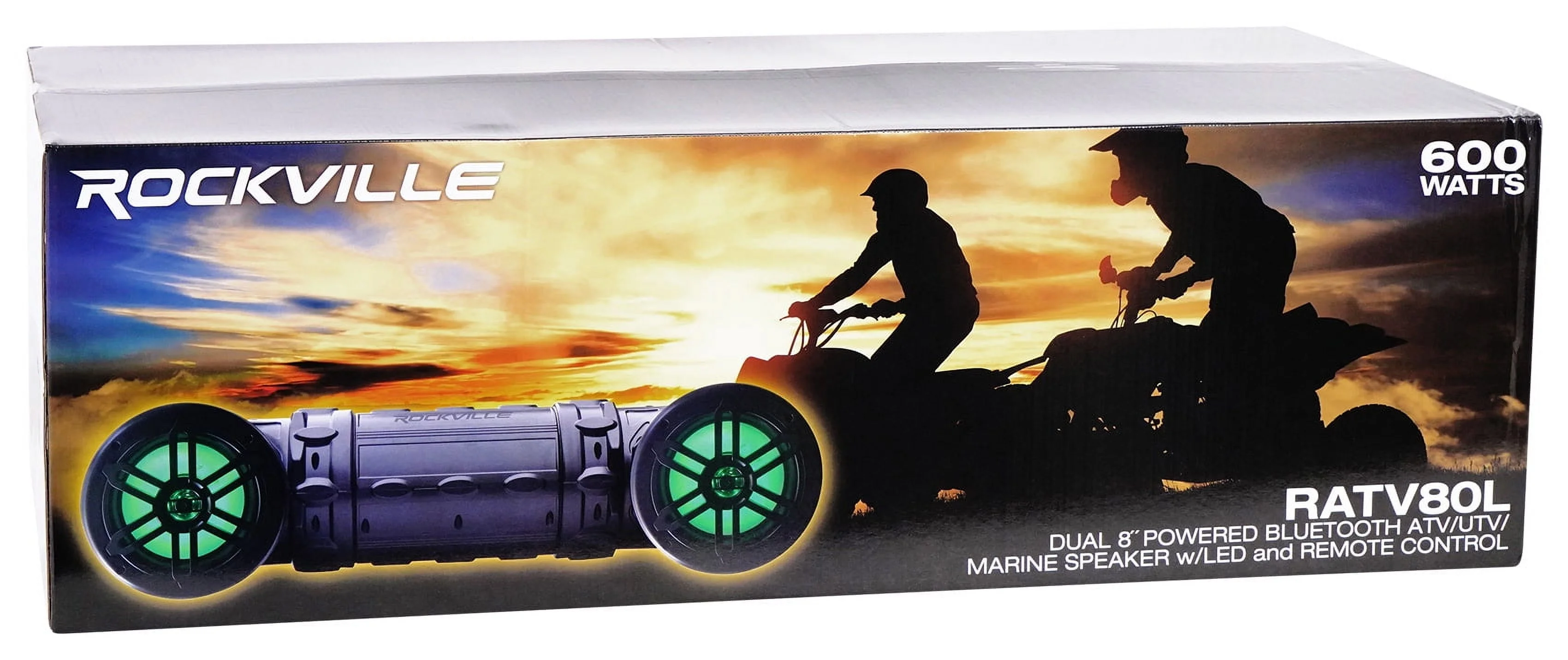 <p><strong>Includes:</strong><br></p><ul><li>Speaker system<br></li><li>4 Heavy Duty Mounting Straps with Velcro Closures<br></li><li>5 foot 3.5mm to 3.5mm Mini Jack MP3 Cable<br></li><li>Multifunction Remote Control (Water Resistant) with 3.5mm Jack<br></li><li>Cigarette Lighter Power Connector<br></li><li>LED Wireless Remote Control<br></li><li>Wired audio remote control with handlebar mount</li></ul><p><strong>Description:</strong></p><p>The Rockville RATV80L V2 is a best in class off road Bluetooth speaker system.<br><br>We include a handle-bar mounted remote so you can easily control your volume and your tracks. We also include a wireless LED remote that has 19 modes and 20 static colors to choose from.<br><br>The power is huge. Its extremely loud so you can hear your music even while riding at high speeds. The sound quality is just great. It is tuned for outdoor listening with a tight bass response and very loud and clear highs.<br><br>Our design is also completely marinized and sealed bringing you years of enjoyment.<br><br>This is perfect for ATVs, snowmobiles, off road vehicles, and other marine applications.<br><br>Installation is so easy with the included cigarette lighter power connector.<br><br><strong>Features:</strong><br></p><ul><li>Rockville RATV80L V2 Bluetooth Dual 8" Powered 500w ATV/UTV/Marine Speaker w/LED + Remote Control<br></li><li>600 Watts Total Peak System Power<br></li><li>150 Watts RMS Each Speaker x 2<br></li><li>Perfect for ATV, snowmobiles, off road vehicles, and other marine applications<br></li><li>Bluetooth Enabled High Fidelity Audio Streaming from iPhone/Android/Tablet<br></li><li>Completely Waterproof Marinized System<br></li><li>Twin 8" Woofers with high excursion<br></li><li>Injection molded cone with rubber surround<br></li><li>Linear Progressive CONEX Spider<br></li><li>Built-In Capacitor Crossover Network<br></li><li>Extended Frequency Response with Superb Bass and Clear Highs<br></li><li>(2) 1��PEI Tweeters<br></li><li>All Speakers are Forward Firing So You Can Hear The Music Clearly While Riding<br></li><li>Automatic Pairing with In-Range Reconnect<br></li><li>Handle Bar Mounted Waterproof Multi-Function Remote Control<br></li><li>3.5mm Auxiliary Audio Input<br></li><li>Shockproof Design<br></li><li>ABS Weather Resistant Grills and Hardware<br></li><li>Frequency Response: 35Hz-20KHz<br></li><li>Includes Heavy Duty Mounting Straps with Velcro Closures and all power connection cables<br></li><li>Quick, Fast &amp; Easy Installation<br></li><li>Height: 9.3" (263mm), Length: 32.4" (825mm), Depth: 12.2" (310mm)</li></ul><p><strong>LED Features:</strong></p><ul><li>19 Dynamic LED Modes<br></li><li>20 Switchable static LED Colors<br></li><li>256-Grade PWM<br></li><li>Adjustable LED Strobe Speed<br></li><li>5 Adjustable LED Brightness Settings<br></li><li>Slim Card Type LED Remote<br></li><li>Demo LED Mode<br></li><li>Included Remote can control all of the LED features</li></ul>Rockville RATV80L V2 Bluetooth Dual 8" Powered 600w ATV/UTV/Marine Speaker w/LED