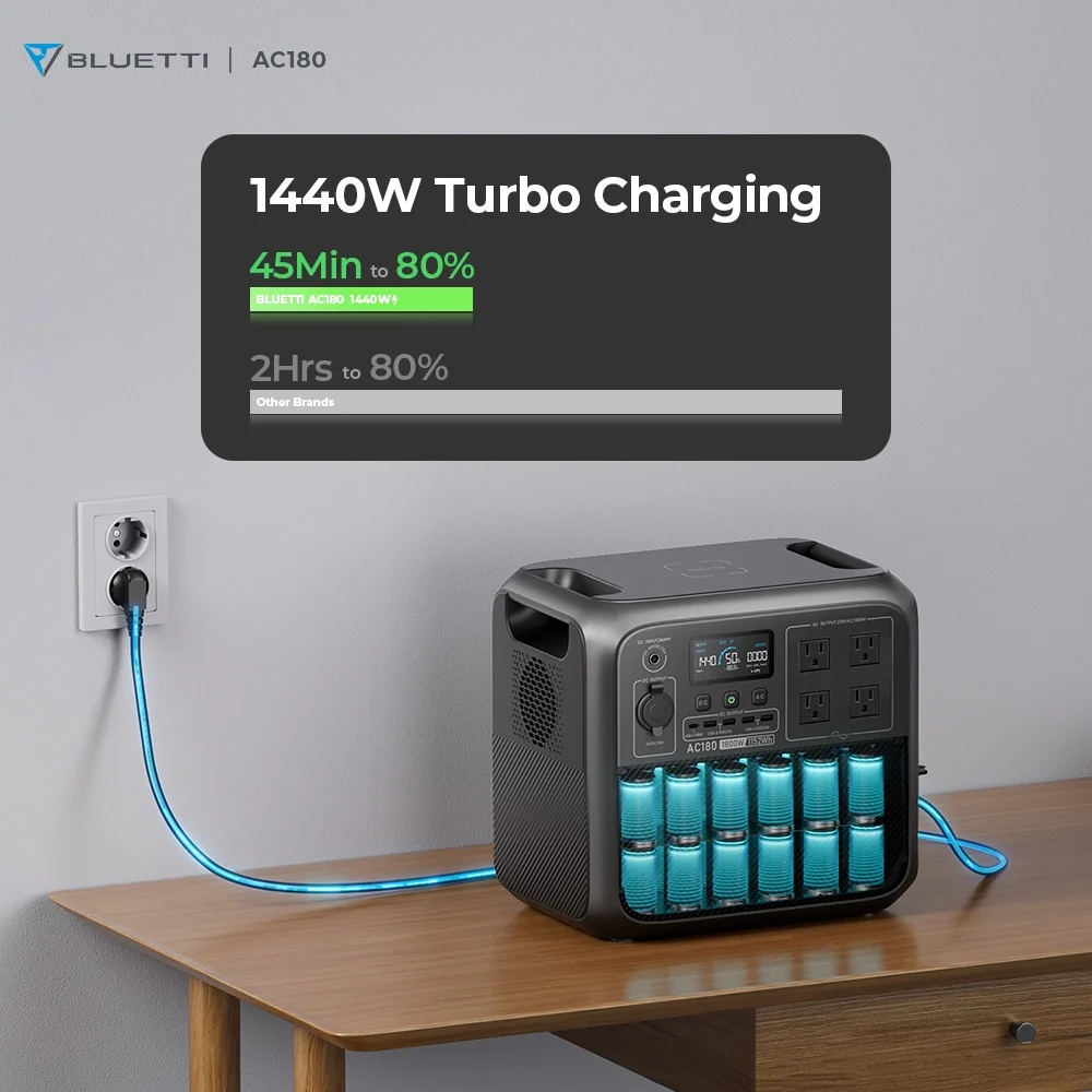 - This generator features Turbo Charging with up to 1440W input, which allows for a 0-80% charge in just 45 minutes. You can recharge it in multiple ways including wall sockets, solar panels, cars, and generators.
