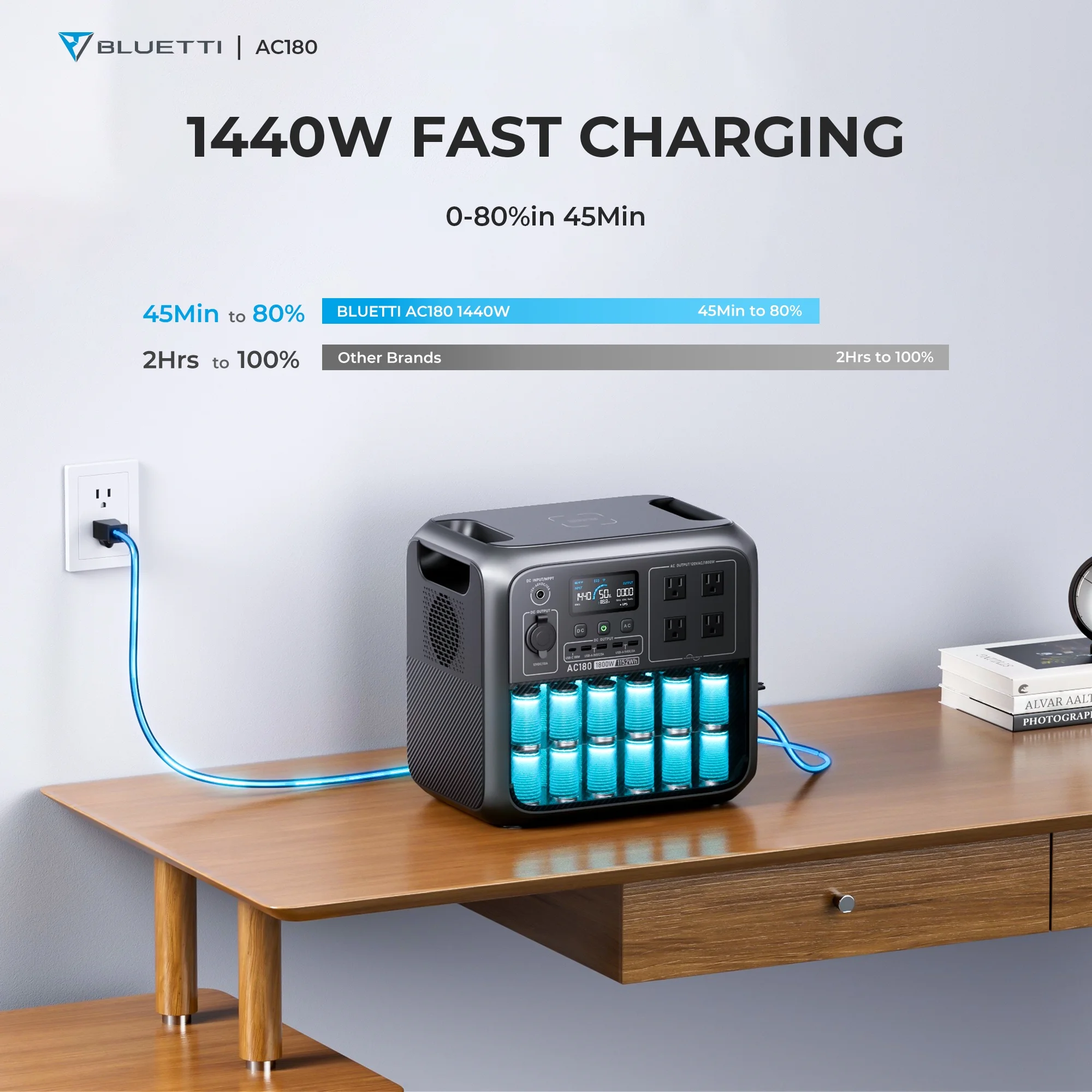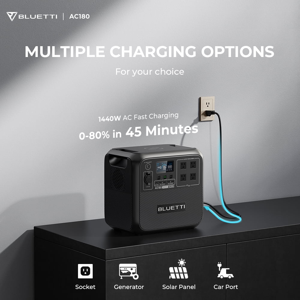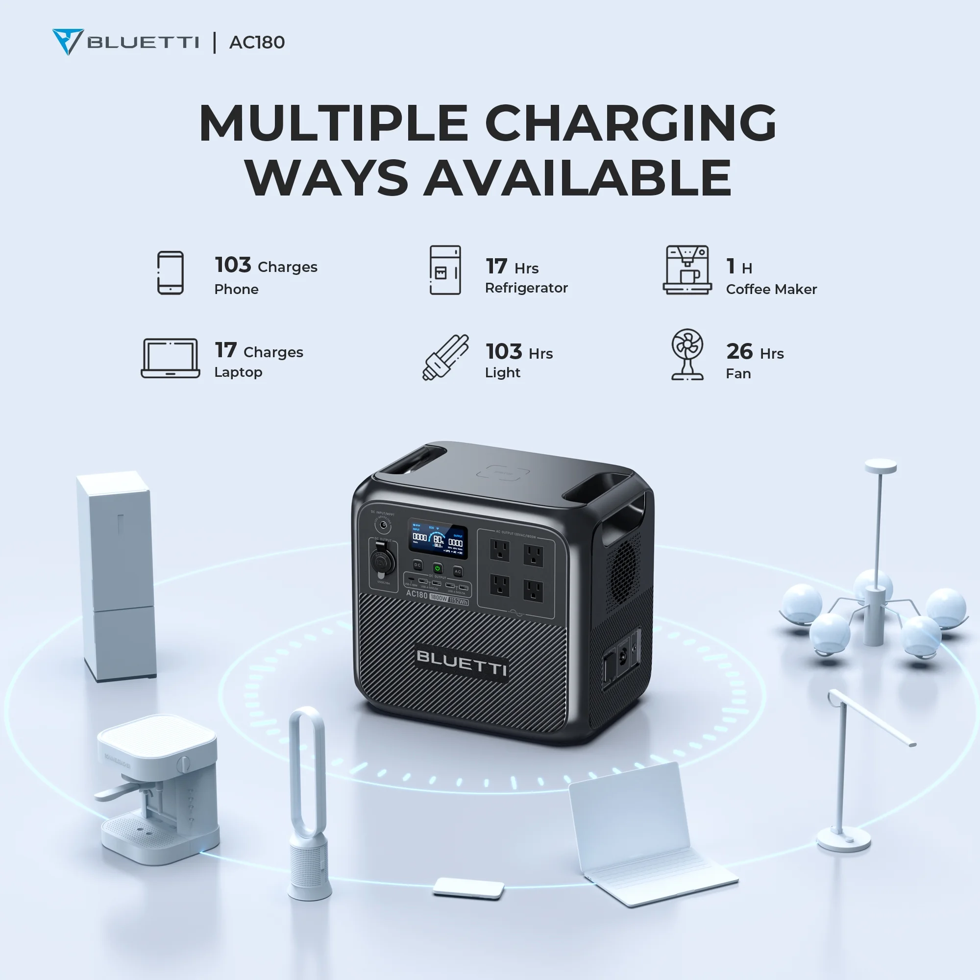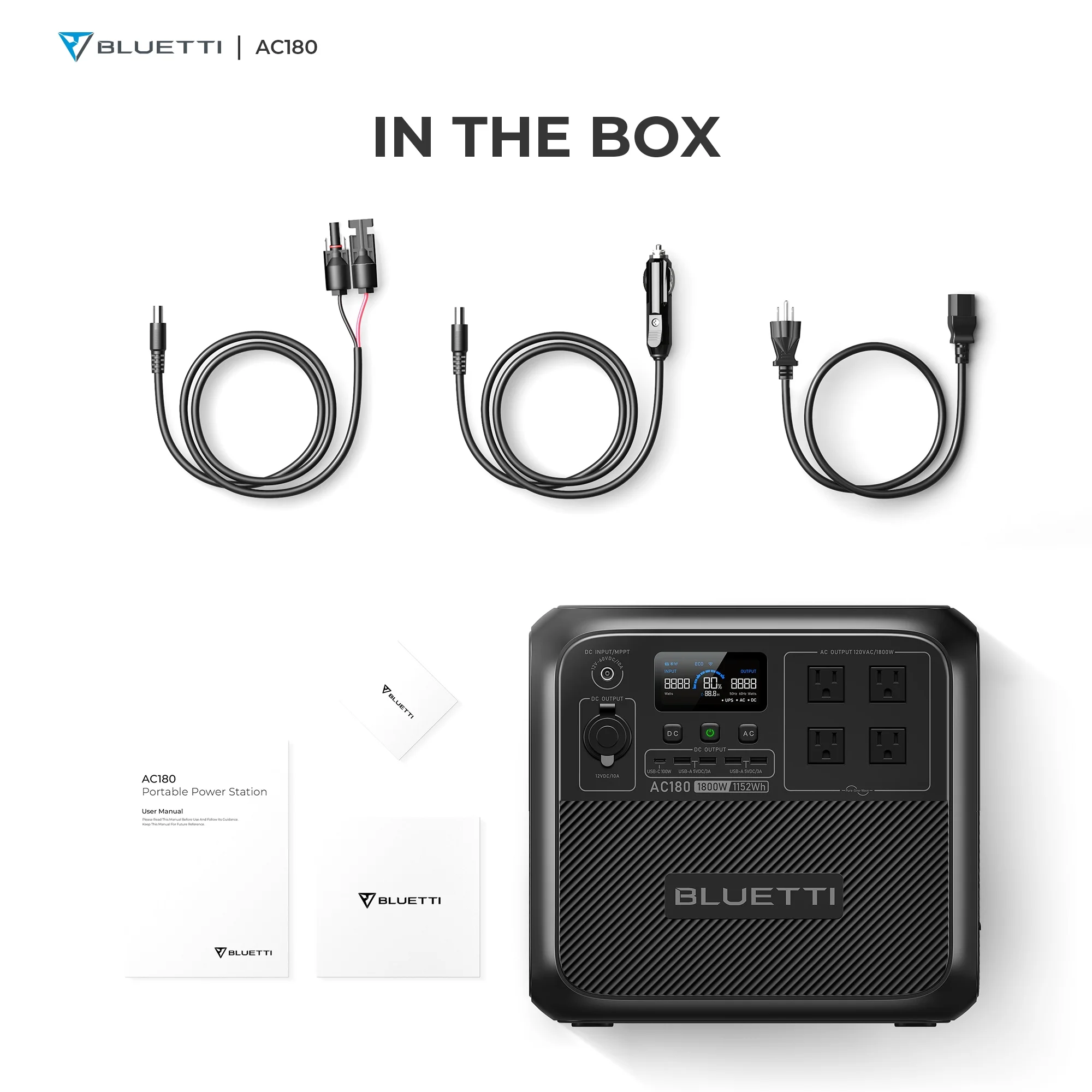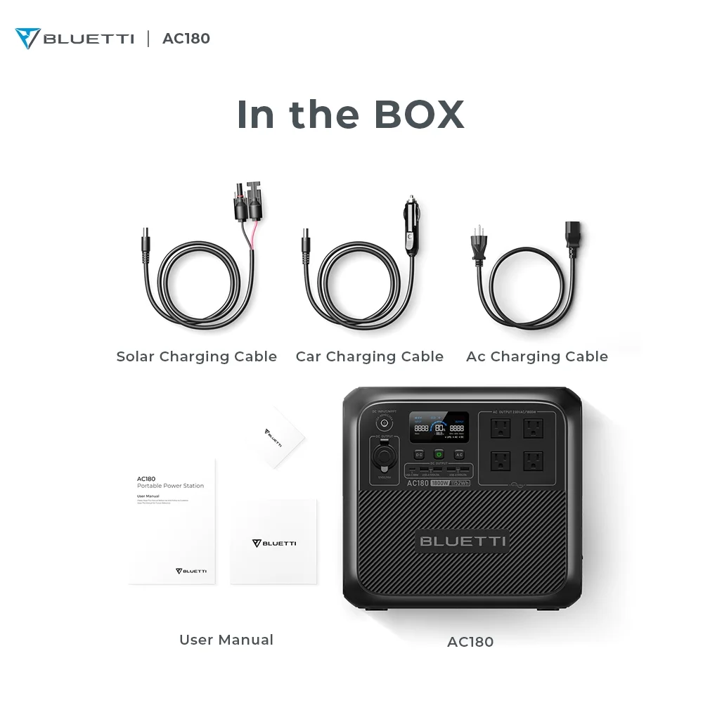 - BLUETTI AC180 Portable Power Station, 1PCS Multimeter,AC Charging Cable, Car Charging Cable, Solar Charging Cable, User Manual, Warranty Card, and Friendly Customer Service.