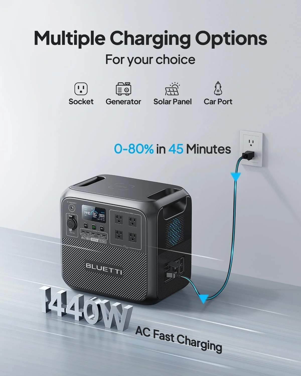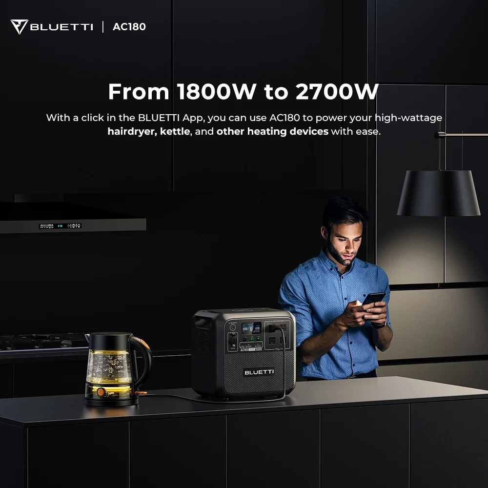 - This power station boasts 1800W rated power and 2700W lifting power. To ensure a consistent power supply, you can also charge the AC180 with compatible expansion batteries.