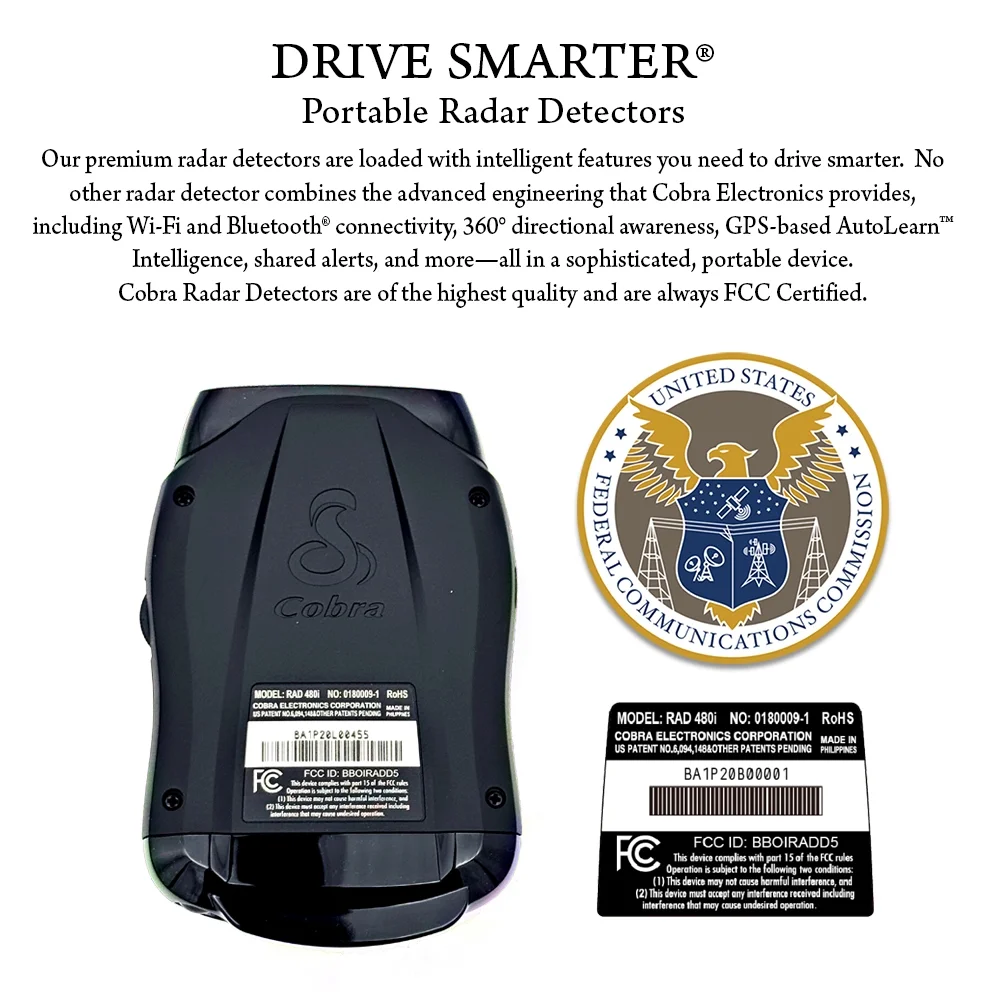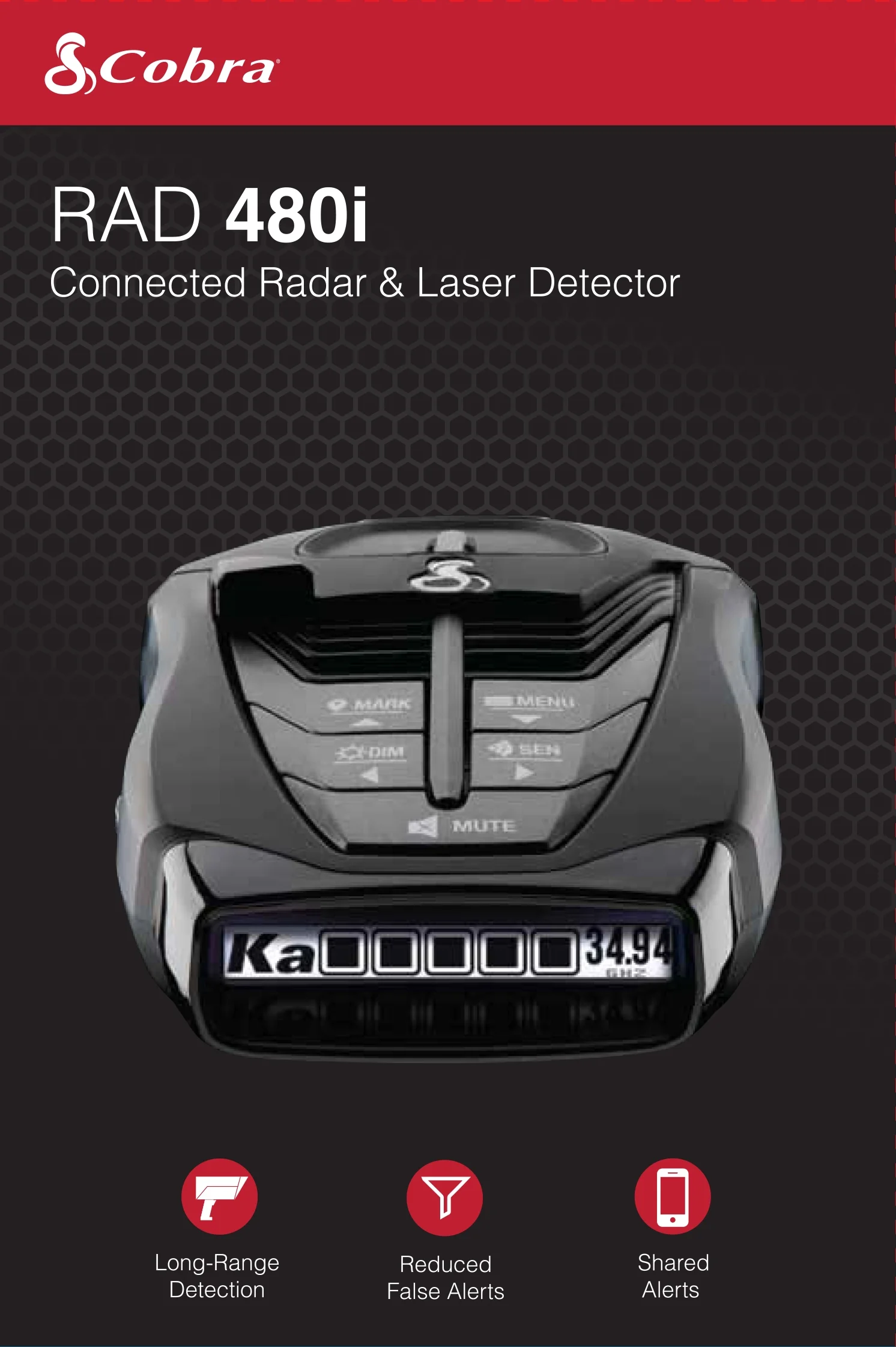 - Everything You Need Comes in the Box - The Cobra RAD 480i radar detector comes with a 12V vehicle power cord, suction cup car windshield mount, a hook and loop fastener for dash mounting, and a quick start guide. Everything you need for wherever the road takes you.