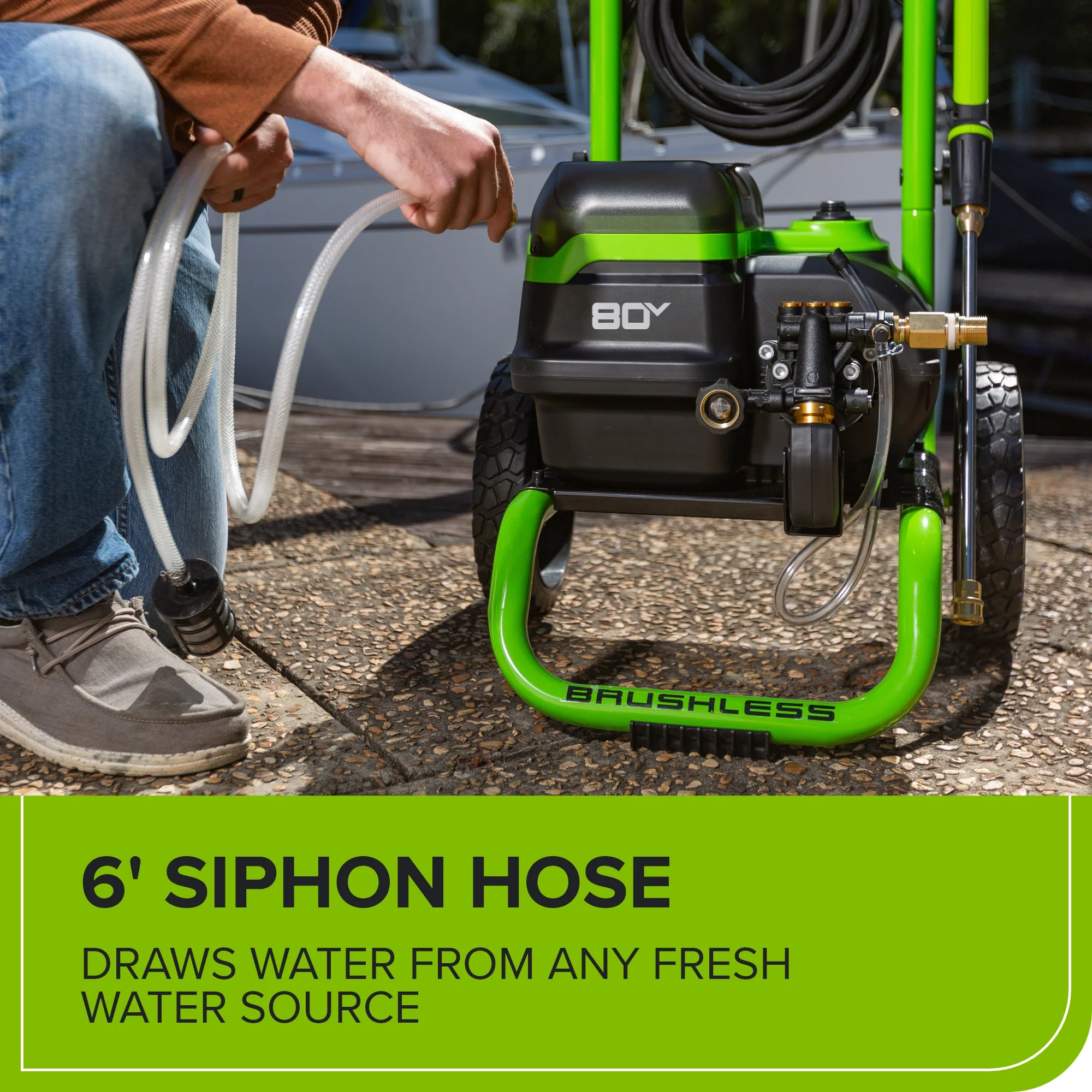 - [EASE-OF-USE] Complete portable power with no electrical cords and includes a self-primed siphon hose that allows you to draw water from a standing water source, water tank, or connect to a garden hose