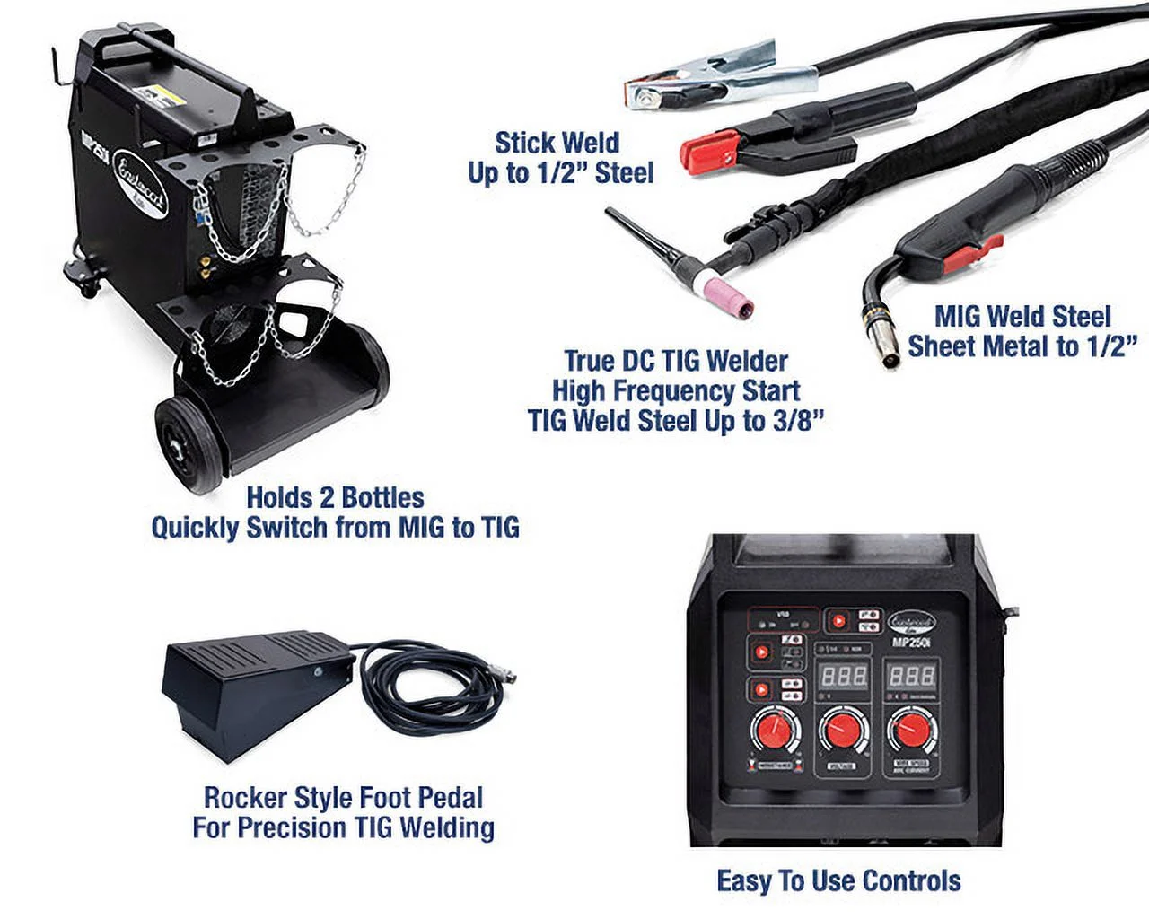 When you want a Multi-Process machine that's built to deliver great results with no compromises, you need the Eastwood Elite MP250i. It has all of the features of a standard DC TIG Welder like High Frequency Start and a Rocker Style Foot Pedal so when you switch from MIG to TIG you know you're going to get the same great results you'd expect from a dedicated TIG machine.