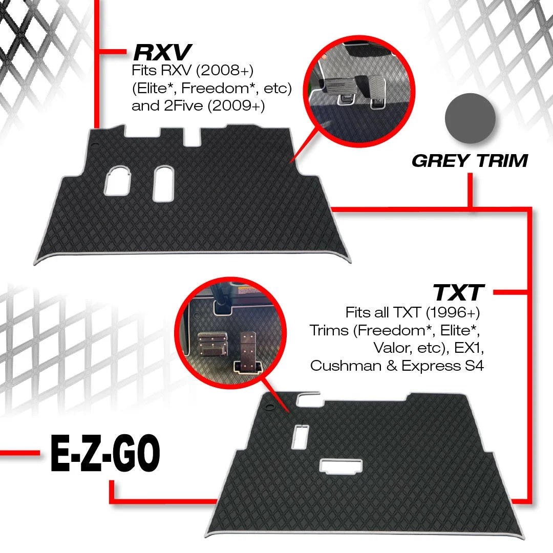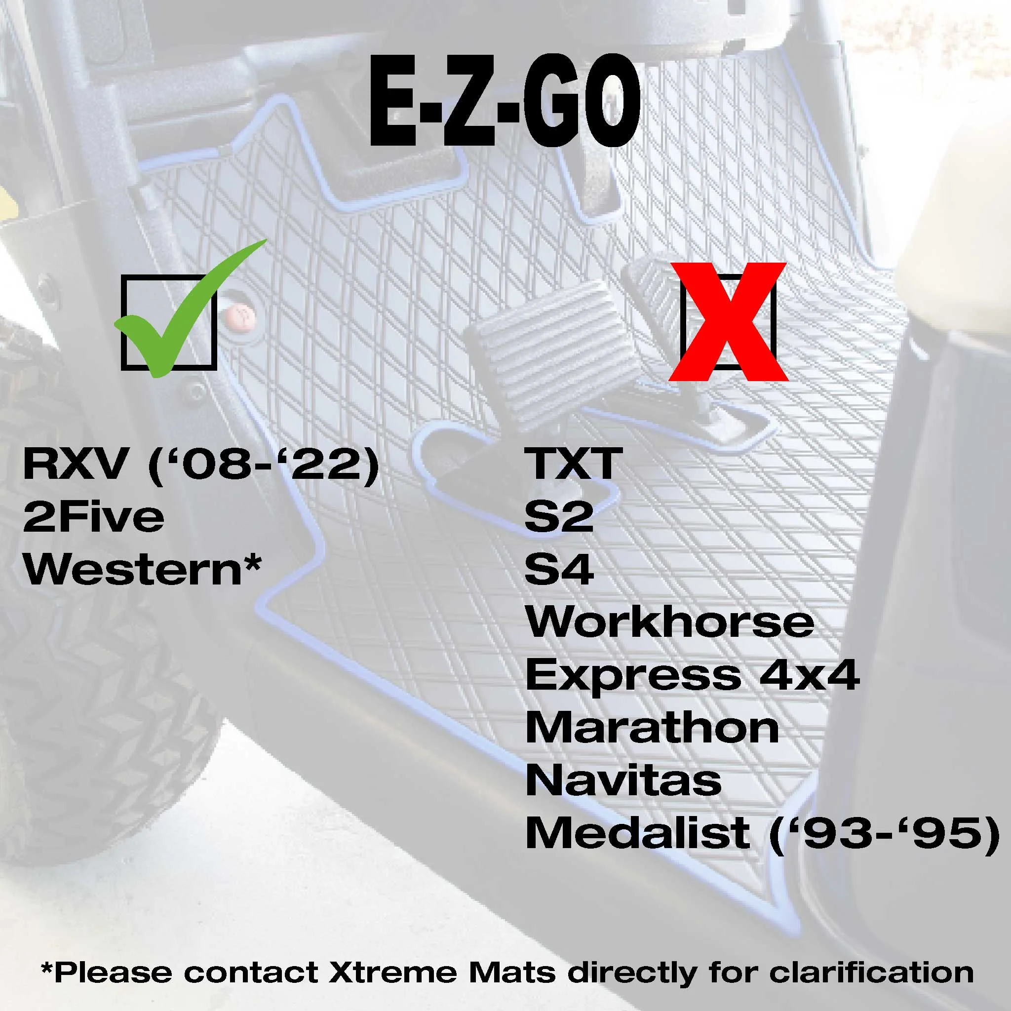 - UPGRADE YOUR RIDE - Give your golf cart a facelift and elevate your EZGO, Club Car, ICON, or Yamaha with our Xtreme Mats liners. Perfect for enhancing a plain or newly street-legal golf cart or complementing with your existing golf cart accessories. Available in black, gray, red, blue, green, and beige trims for your color preference. Pairs especially well with any matching golf cart seat covers.