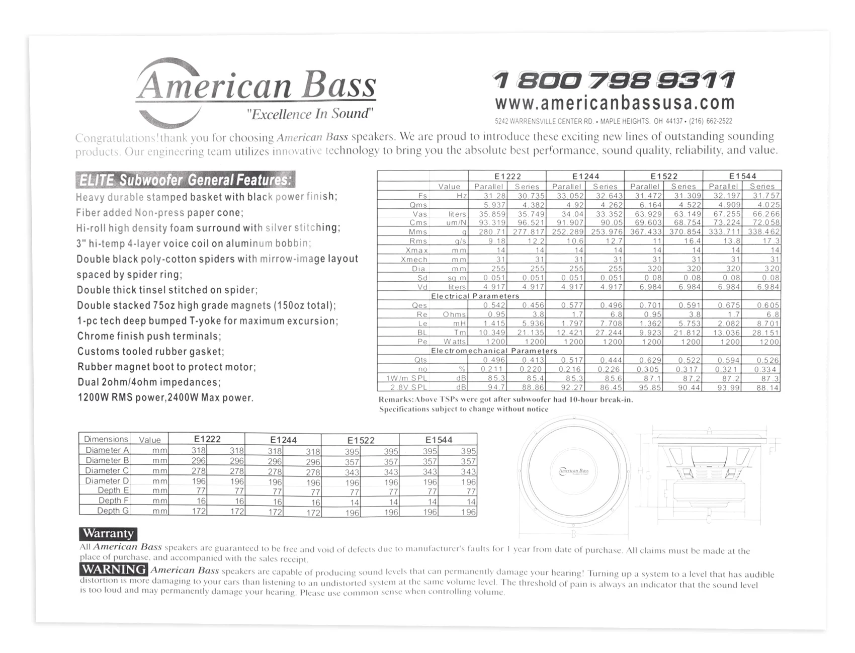 - RMS Power: 1200W. Max Power: 2400W. Impedence: DVC 4-ohm. Sensitivity Db: 86.45. Mounting Depth (In): 6.77. Cutout Size (In): 10.94. Ported Box Cu ft: 2.5. Magnet Size (Oz): 150. Voice Coil Size: 3"