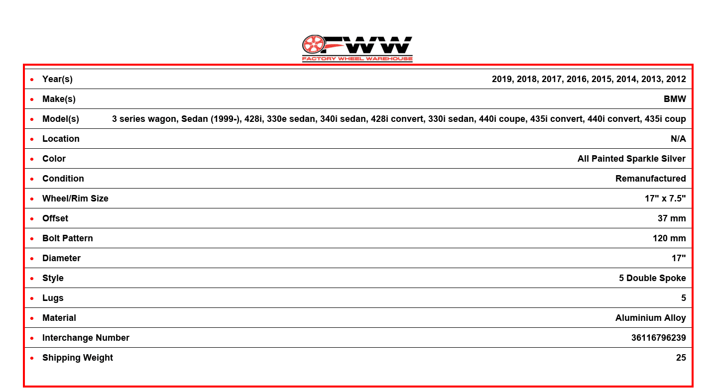 This Factory OEM BMW Aluminium Alloy 5 DOUBLE SPOKE wheel comes stock on 2019, 2018, 2017, 2016, 2015, 2014, 2013, 2012 BMW 330I XDRIVE SEDAN, 330I SEDAN, 3 SERIES WAGON, 340I SEDAN, 330E SEDAN, 3 SERIES SEDAN (1999-), 440I COUPE, 440I CONVERTIBLE, 435I COUPE, 435I CONVERTIBLE, 428I COUPE, 428I CONVERTIBLE. The OEM part number(s) for the rim are 36116796239, 560-71534. This is a 5 lug wheel with a 17 inch diameter, width of 7.5 inch and an offset of 37 mm. The finish on the wheel is ALL PAINTED SPARKLE SILVER.