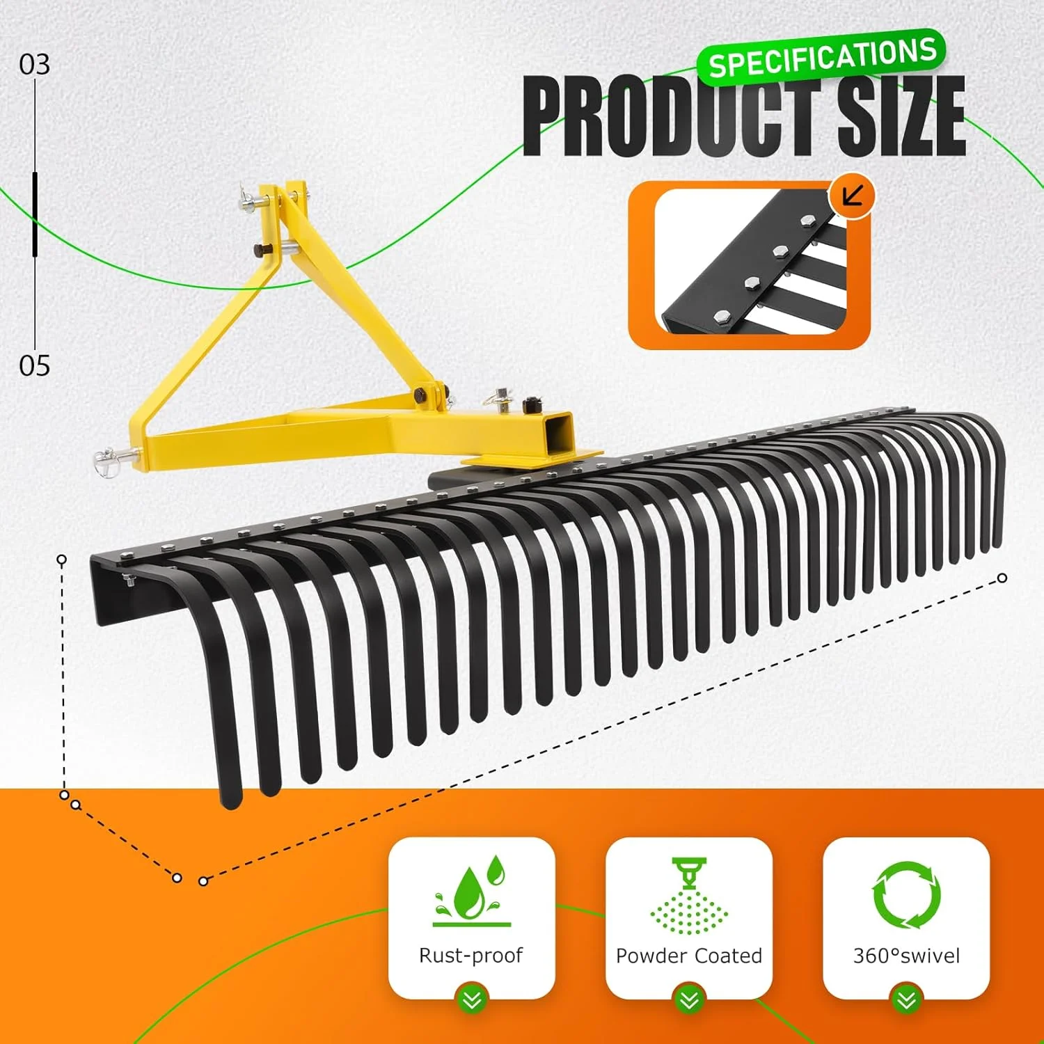 - Versatile tractor compatibility: This 60-inch landscape rake is designed for Category 1, 3-point linkage tractors, making it suitable for a wide range of applications including industrial, construction and agricultural work. Whether you're levelling land, raking hay or mowing the lawn, this rake does it all efficiently.