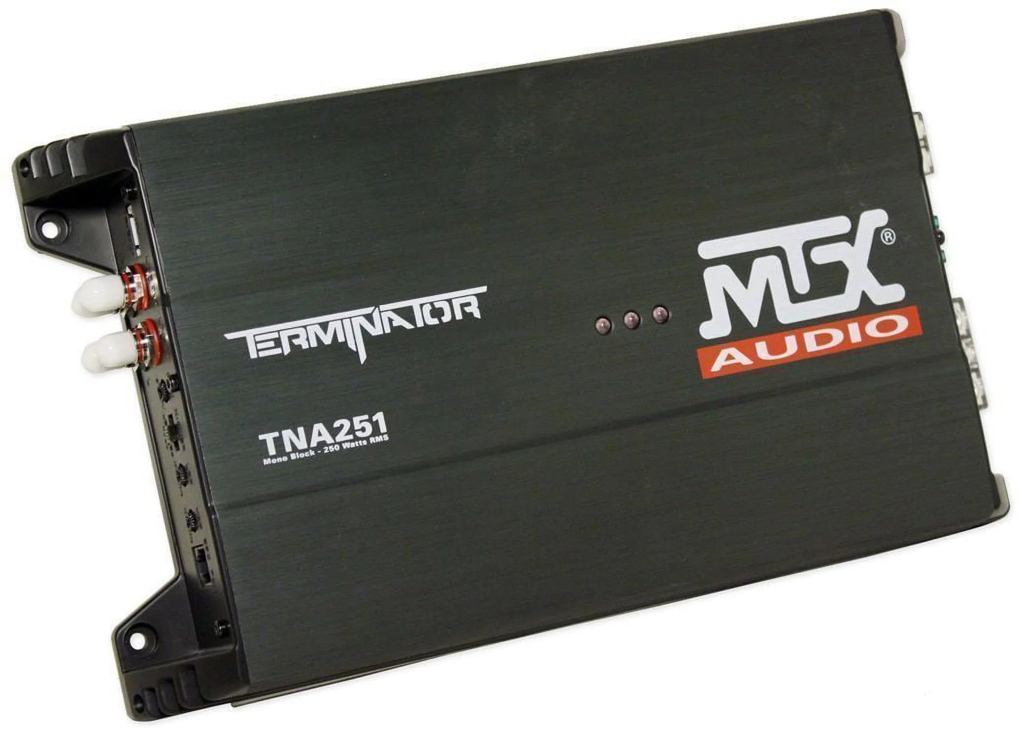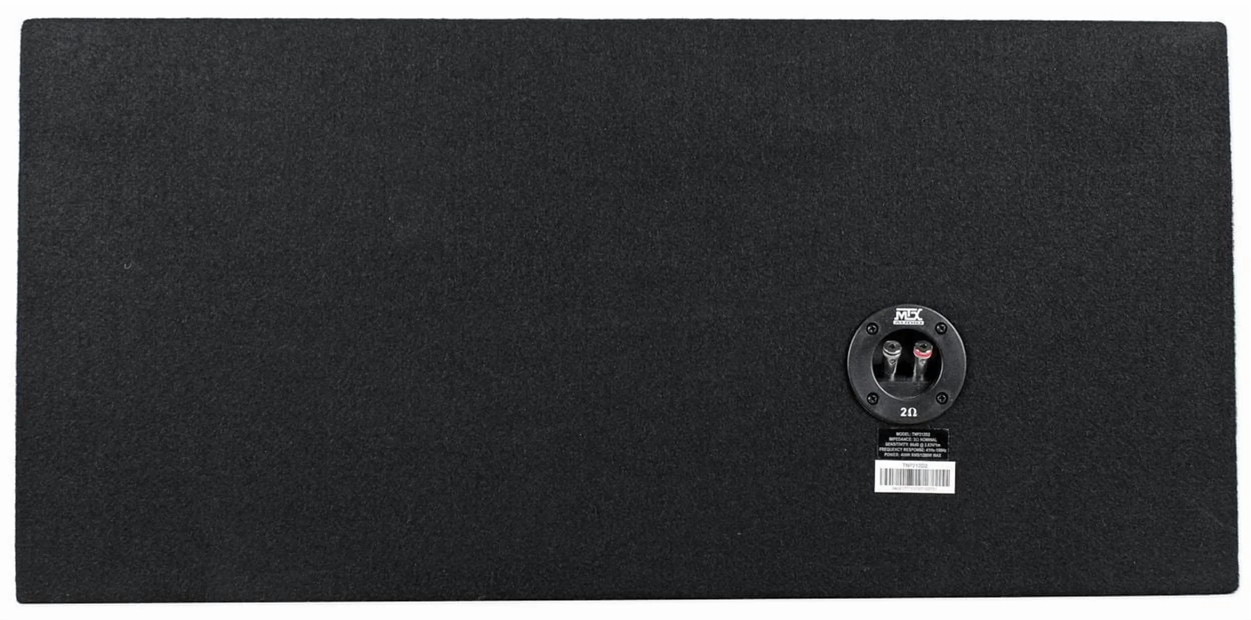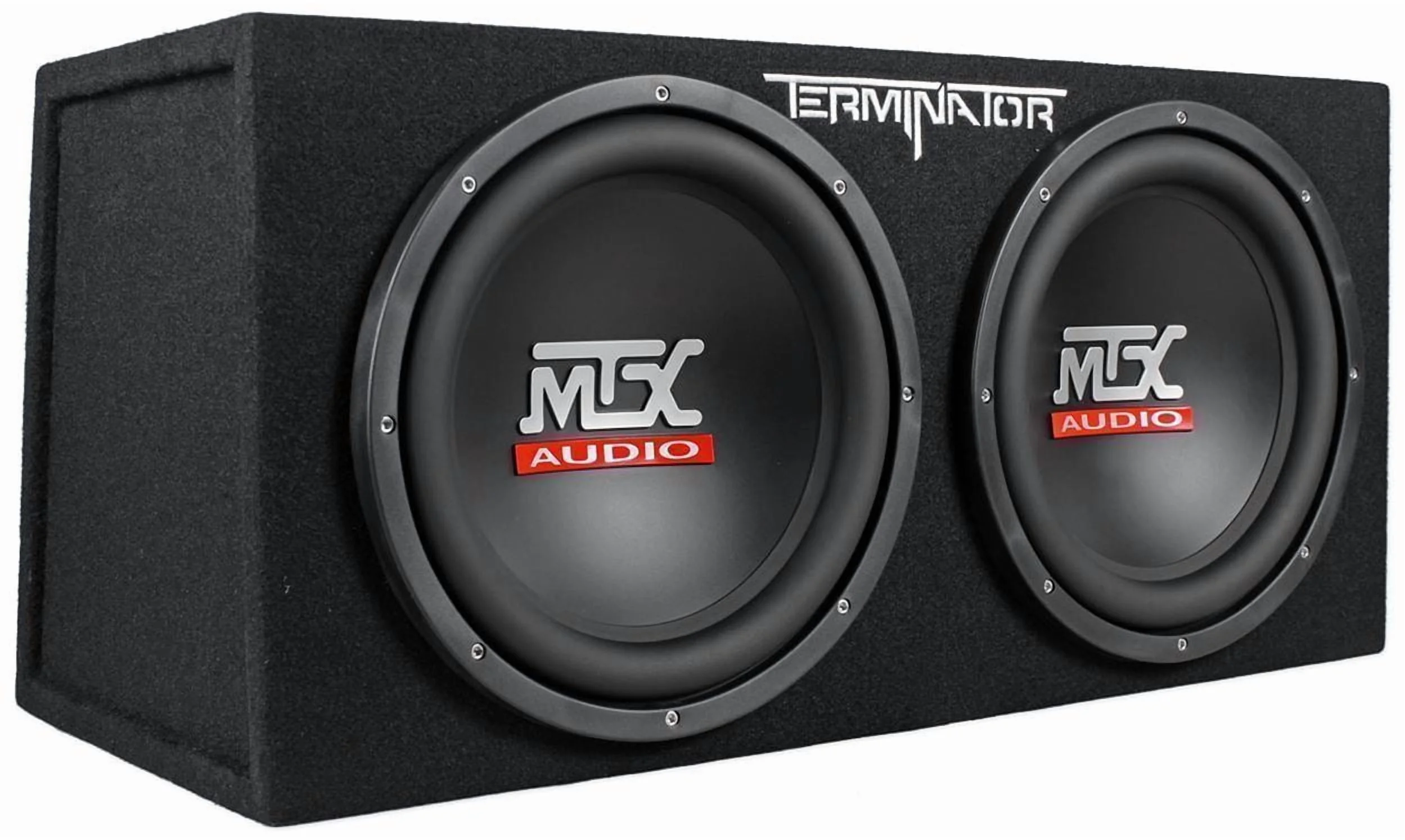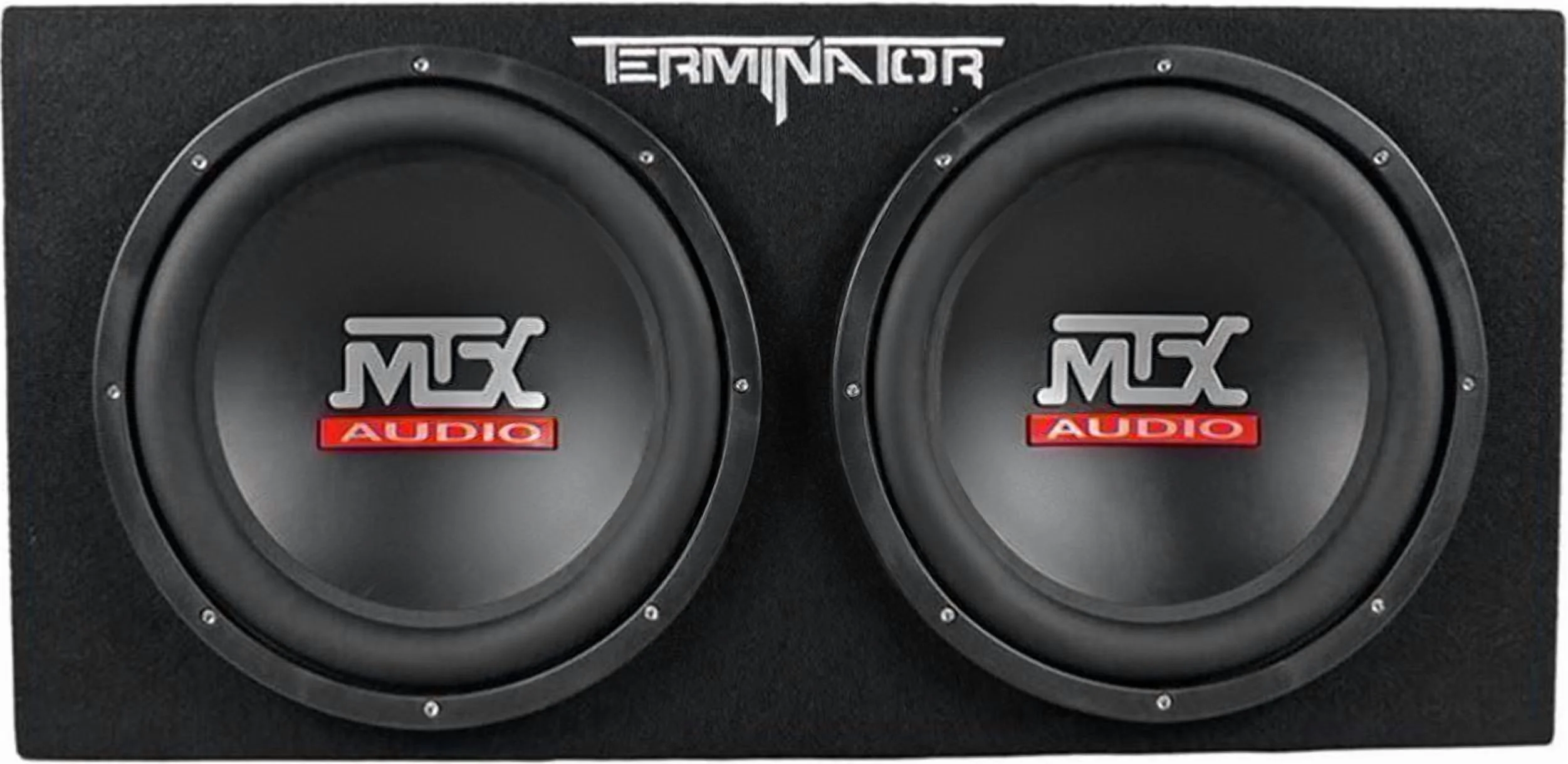 - MTX Logo on Dustcap. 48oz. Magnet. Frequency response: 37-150 Hz. Dual 12" Sealed Sub Enclosure. 5/8" MDF Solid Construction. Durable Black Carpeting. Stylish Logo in Carpet. Dimensions: 13.875"H x 29.625"W x 13.875" D. Amp Features: Terminator Series Class D Monoblock Car Amplifier. 400 x 1 watts peak @ 2 omhs. 200 x 1 RMS @ 2 ohms. LED power and protection indicators. Selectable bass boost (0, 6, 12 dB at 40 Hz). Mono gain control. Smart engage auto turn-on circuitry