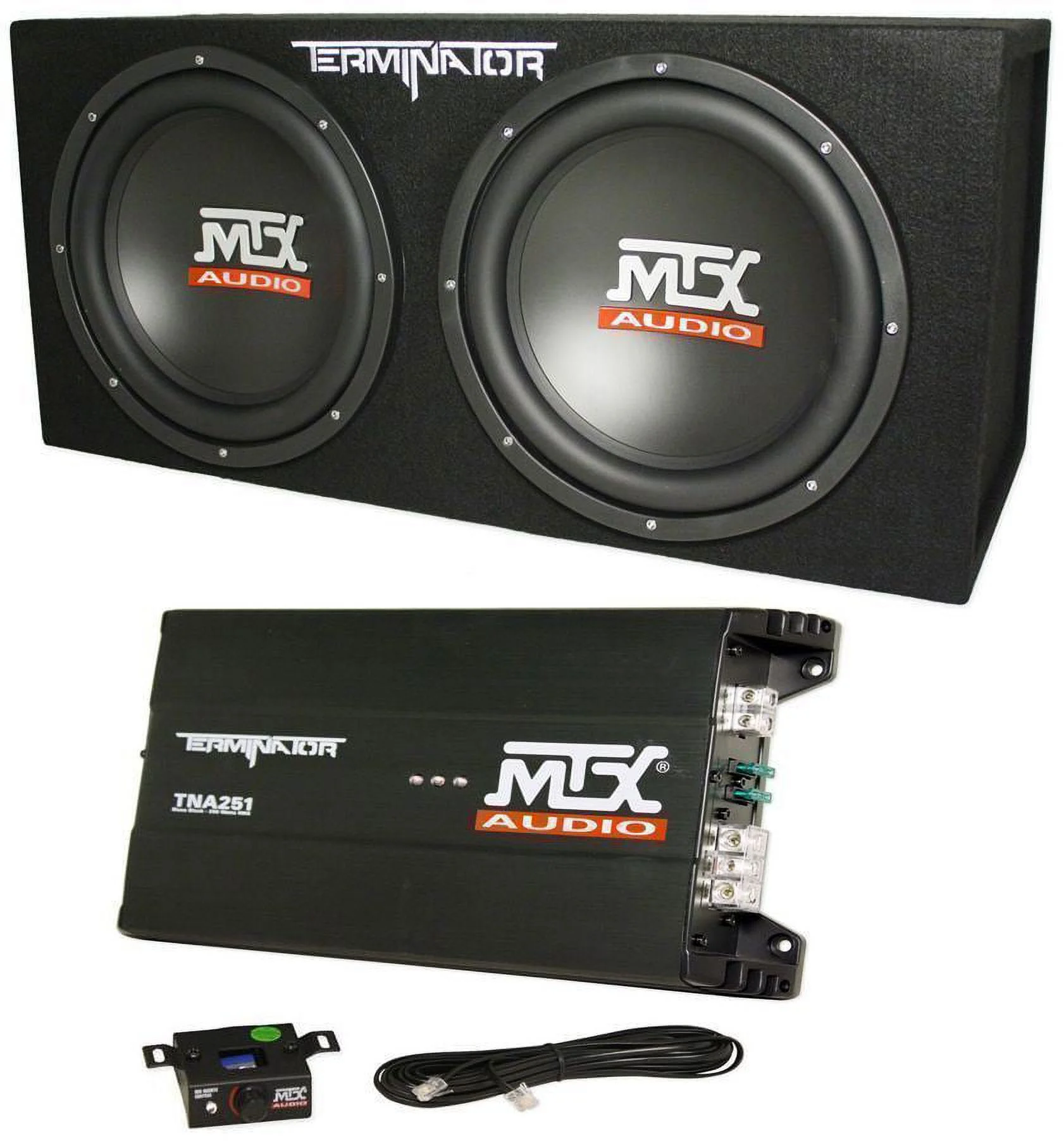 - Package Includes: (1) MTX Terminator TNP212D2 1200 Watt Dual 12�� Subwoofers. (1) Rockville RWK81 8 Gauge Complete Amp Installation Wire Kit with 100 % Copper RCA. (1) Rockville RXC2D 2 Farad Stiffening Power Capacitor. Features for dual subs + box: Dual Loaded 12" Subwoofer Enclosure. 2 12" Terminator Series Subwoofers Included. 1200 watts peak output. 400 watts RMS. 2" Aluminum voice coils. Single 4 ohm voice coils per sub (pre-wired down to a 2 ohm load). Rubber Surround. Polypropylene Cone