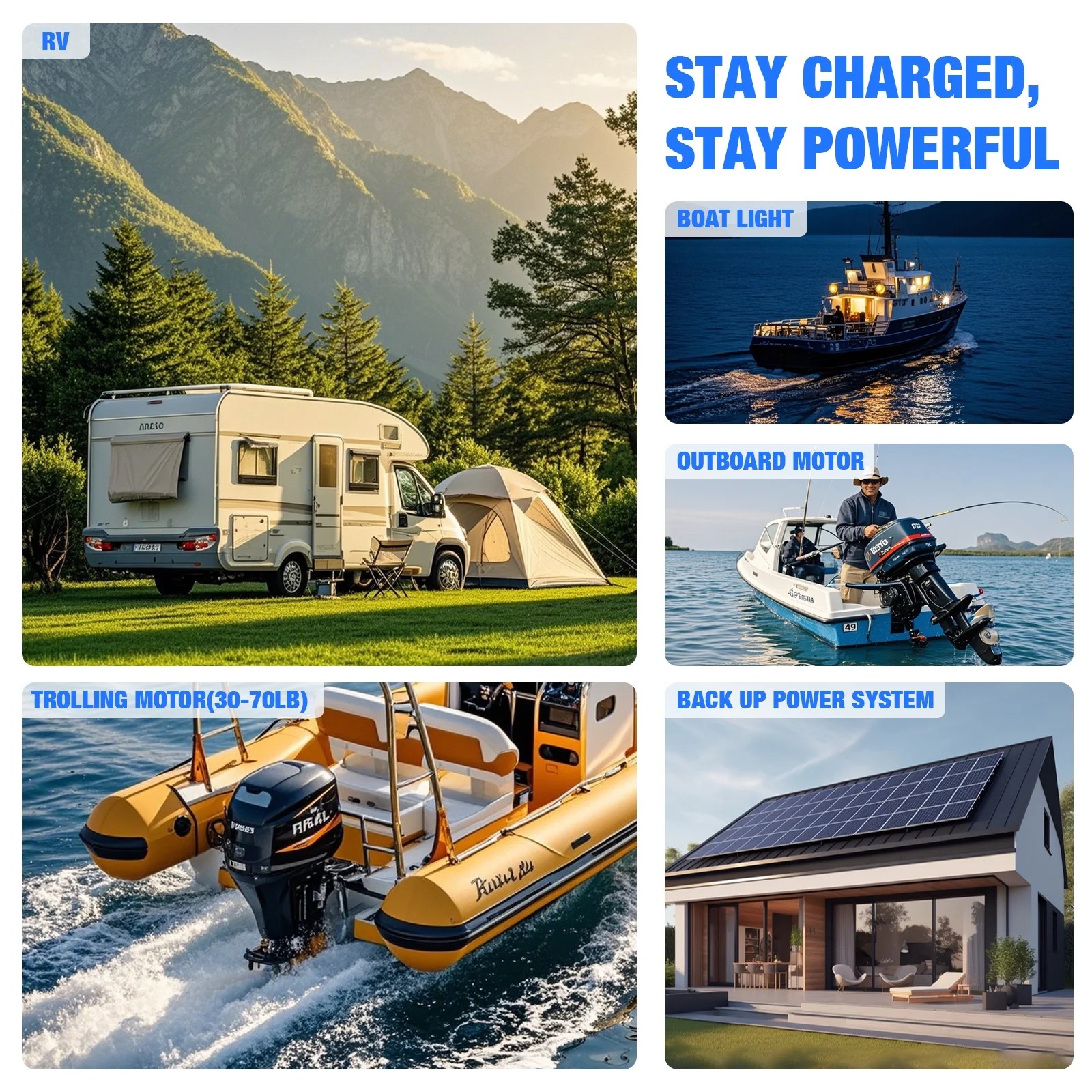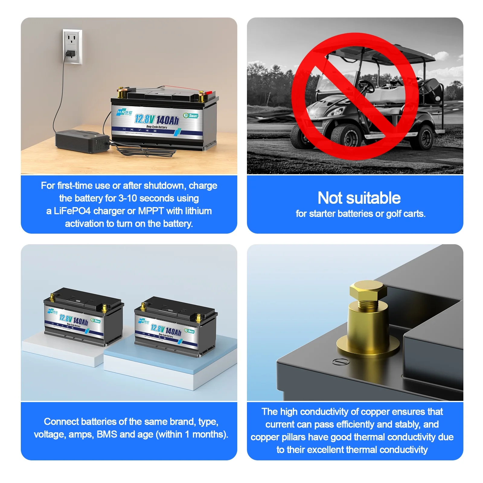 - HRBEENERGY 12V 140Ah LiFePO4 battery is designed as an energy storage battery, it can be used in the following areas: Home energy storage systems, RVs, Campers, Trailers, up to 55lbs Trolling motors. However, this 12V 140Ah deep cycle battery can't be used to start any engines in vehicles, like Golf Carts and automobiles.