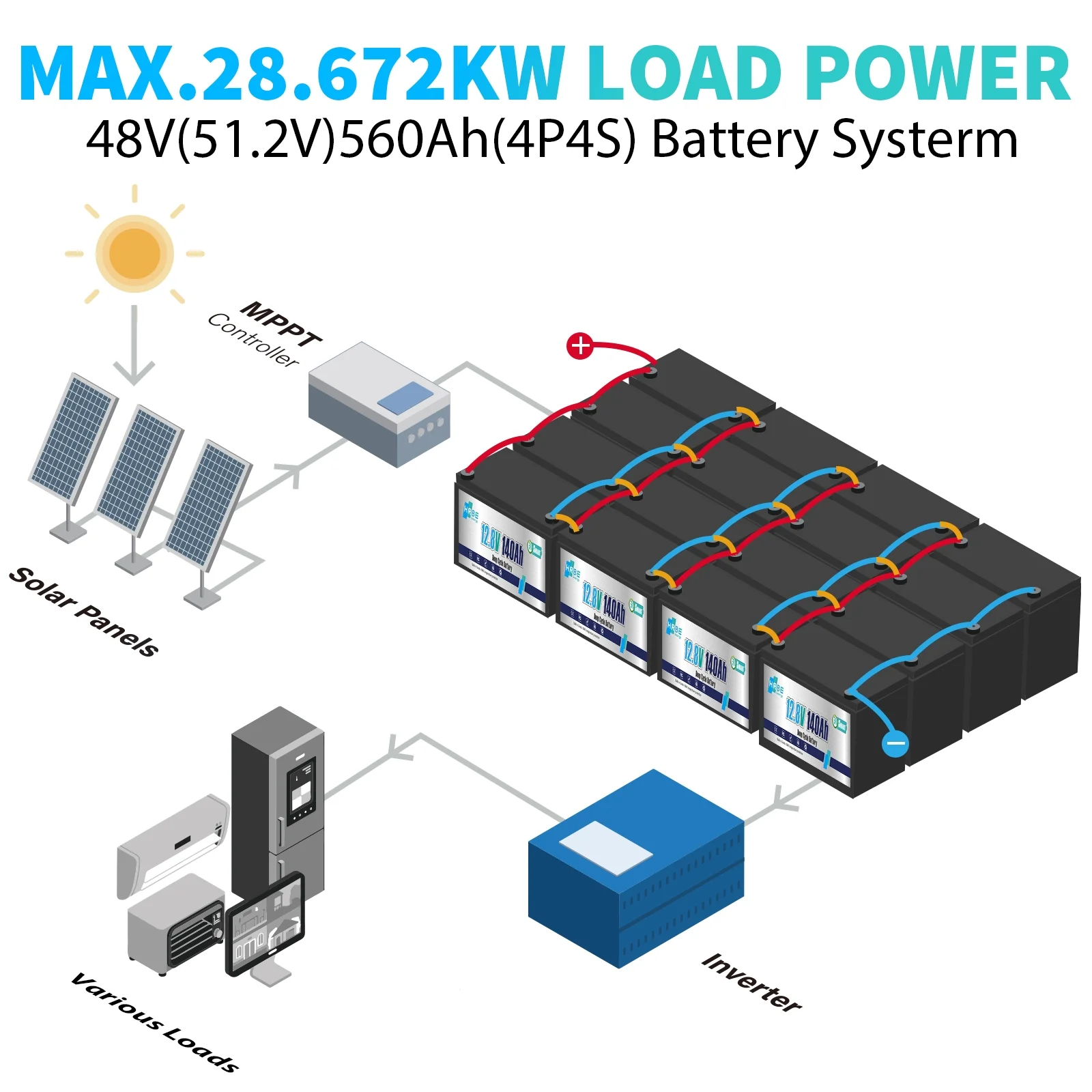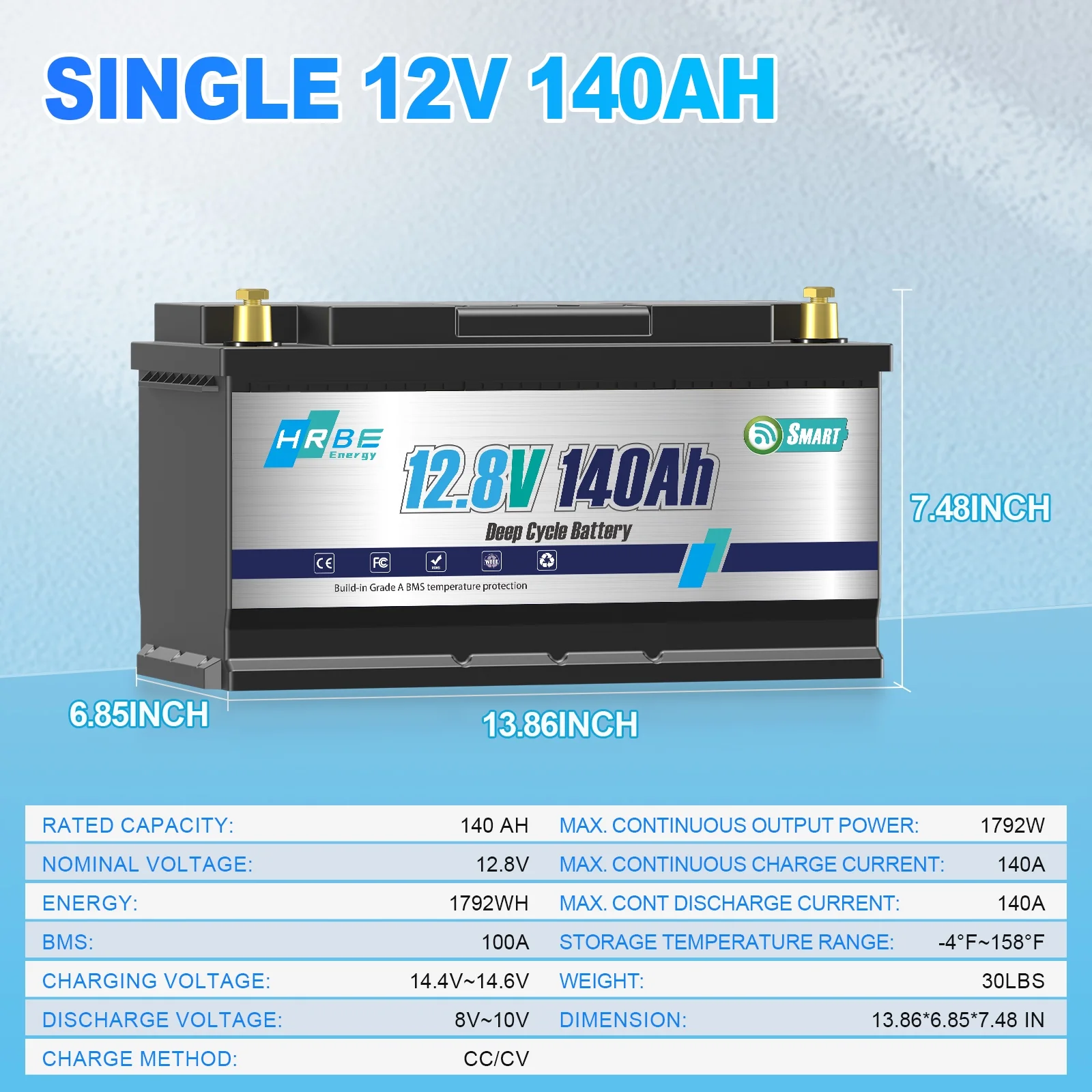 - HRBEENERGY 12V 140Ah LiFePO4 lithium battery achieve 100% SOC and 100% DOD, supporting Max.100A charge/discharge current. 12V/24V/36V/48V in series,no limited in parallel.