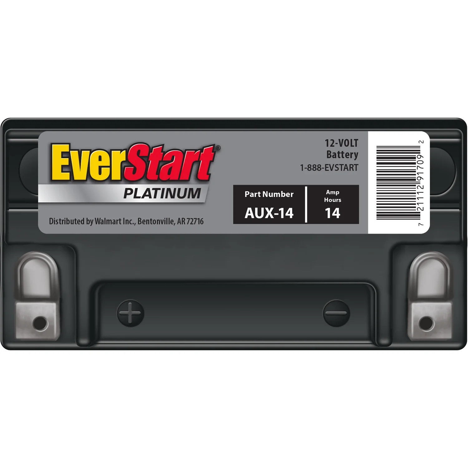 Stay on the go with this The EverStart Platinum AGM battery, Group AUX 14 (BOXED). It is the best choice for your power-hungry vehicle and comes with a one year warranty. Electronic features such as DVD players, GPS systems, heated seats, audio systems and start-stop technology all add to the demand on a battery. Every additional electronic component creates a power draw, which leads to more discharge and recharge cycles, which shorten the lifespan of ordinary batteries. This 12 volt EverStart Platinum AGM battery delivers 200 cold cranking amps with 14 amp hours. They are precision engineered to offer the ultimate combination of reliability, durability, and safety, even under the most demanding applications.