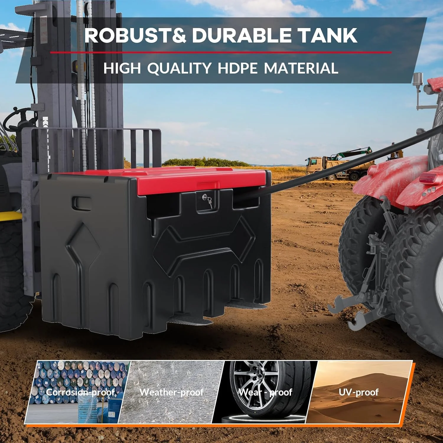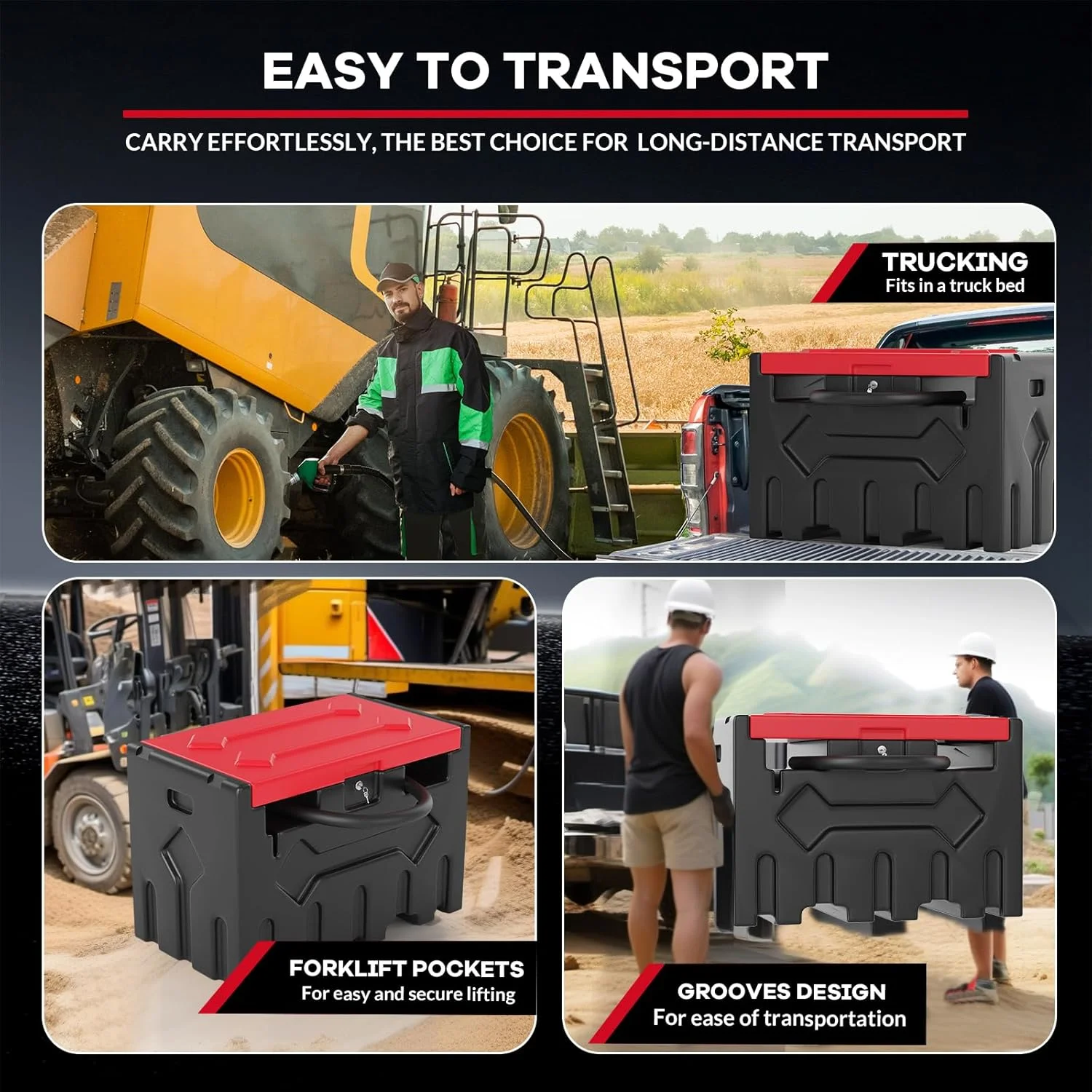 - Versatile & Easy to Transport: Designed for agriculture, construction, and industrial use, this portable diesel tank is forklift-compatible and fits seamlessly on pickups and trucks. The groove design ensures stable lifting and secure transportation.