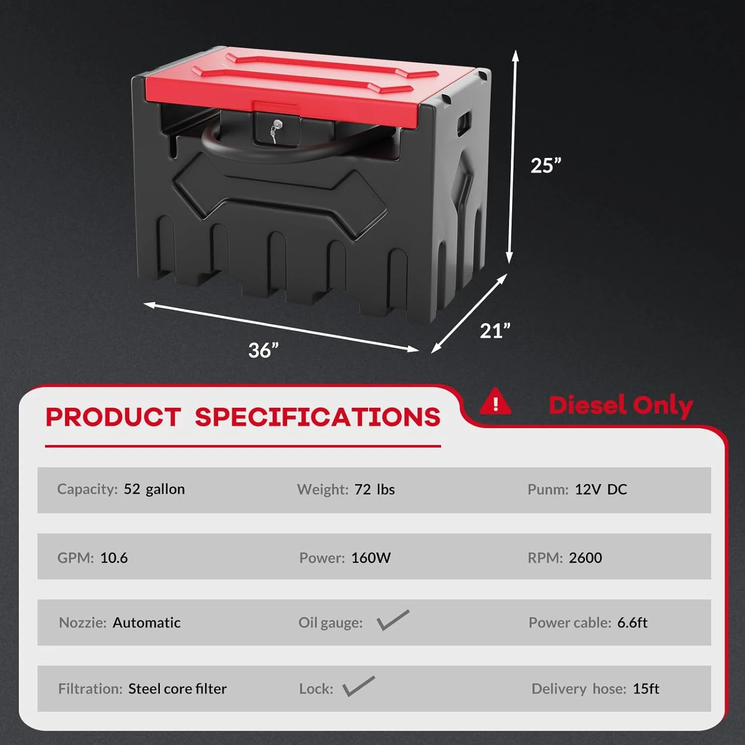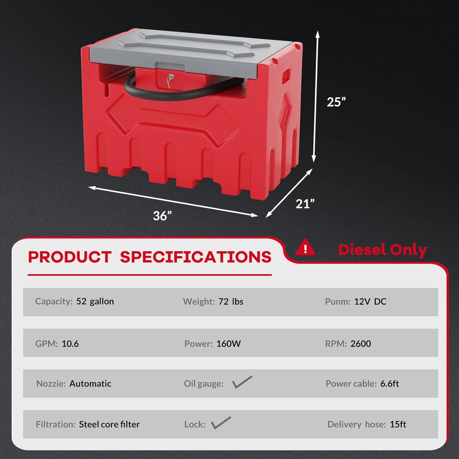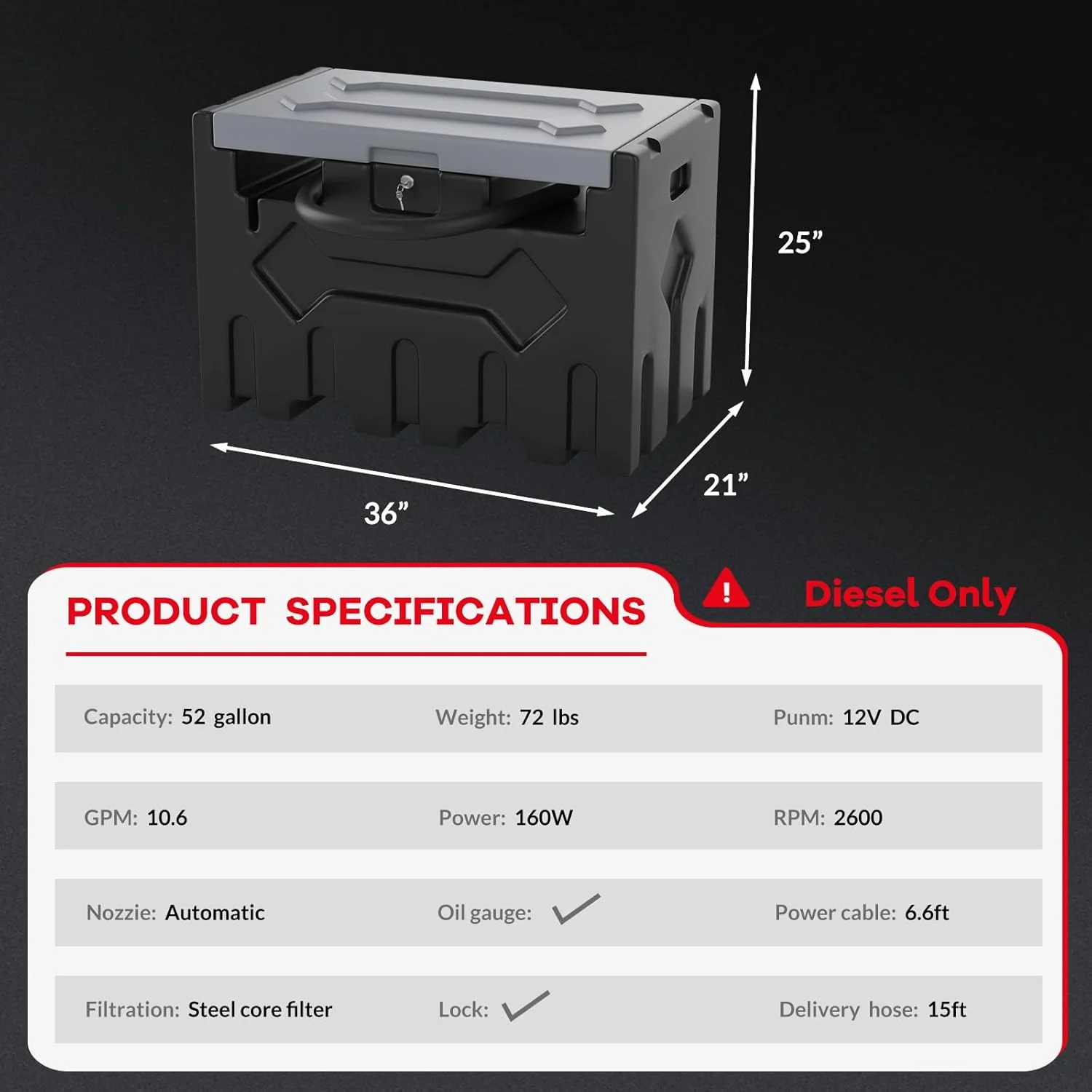 - Powerful Fuel Transfer Pump: Featuring a 12V electric pump with a 10 GPM flow rate, this 52-gallon fuel tank supports efficient refueling. The 15 ft power cord offers flexibility for a wide range of applications, making it ideal for vehicles, machinery, and generators.