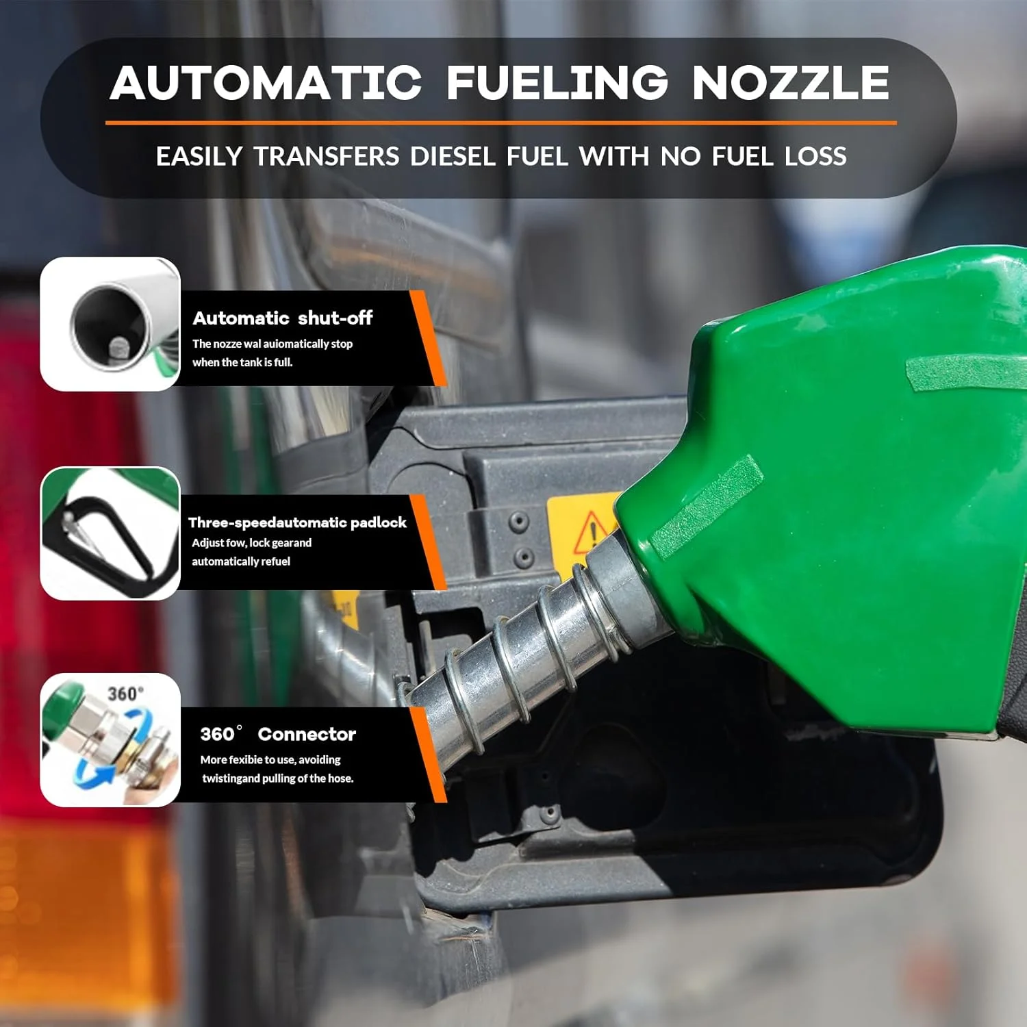 - Auto Shut-Off Nozzle for Safety: The aluminum alloy automatic fuel nozzle cuts off fuel flow when the tank is full, preventing spills and waste. A 360-degree connector minimizes hose twisting and pulling, ensuring safe and efficient operation.