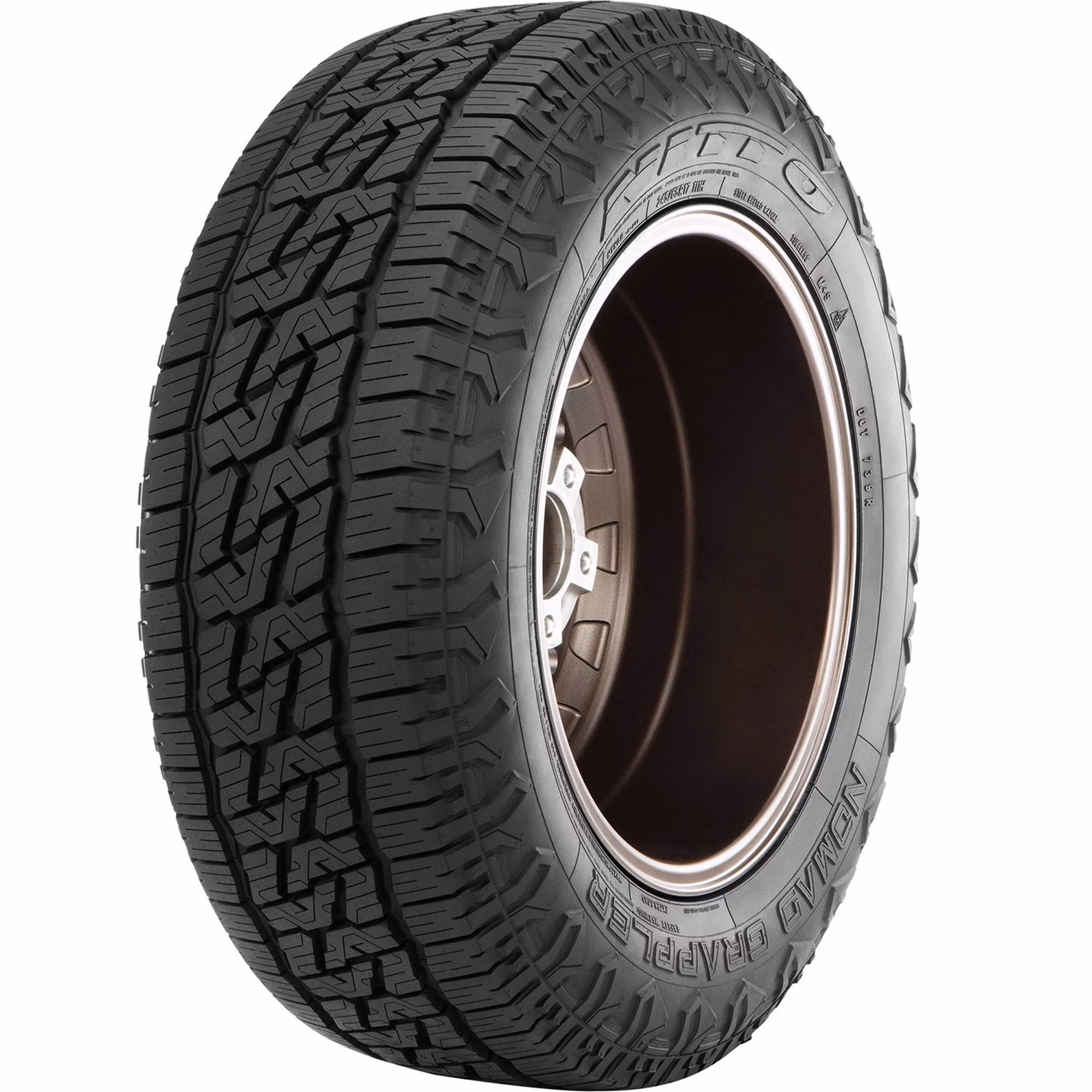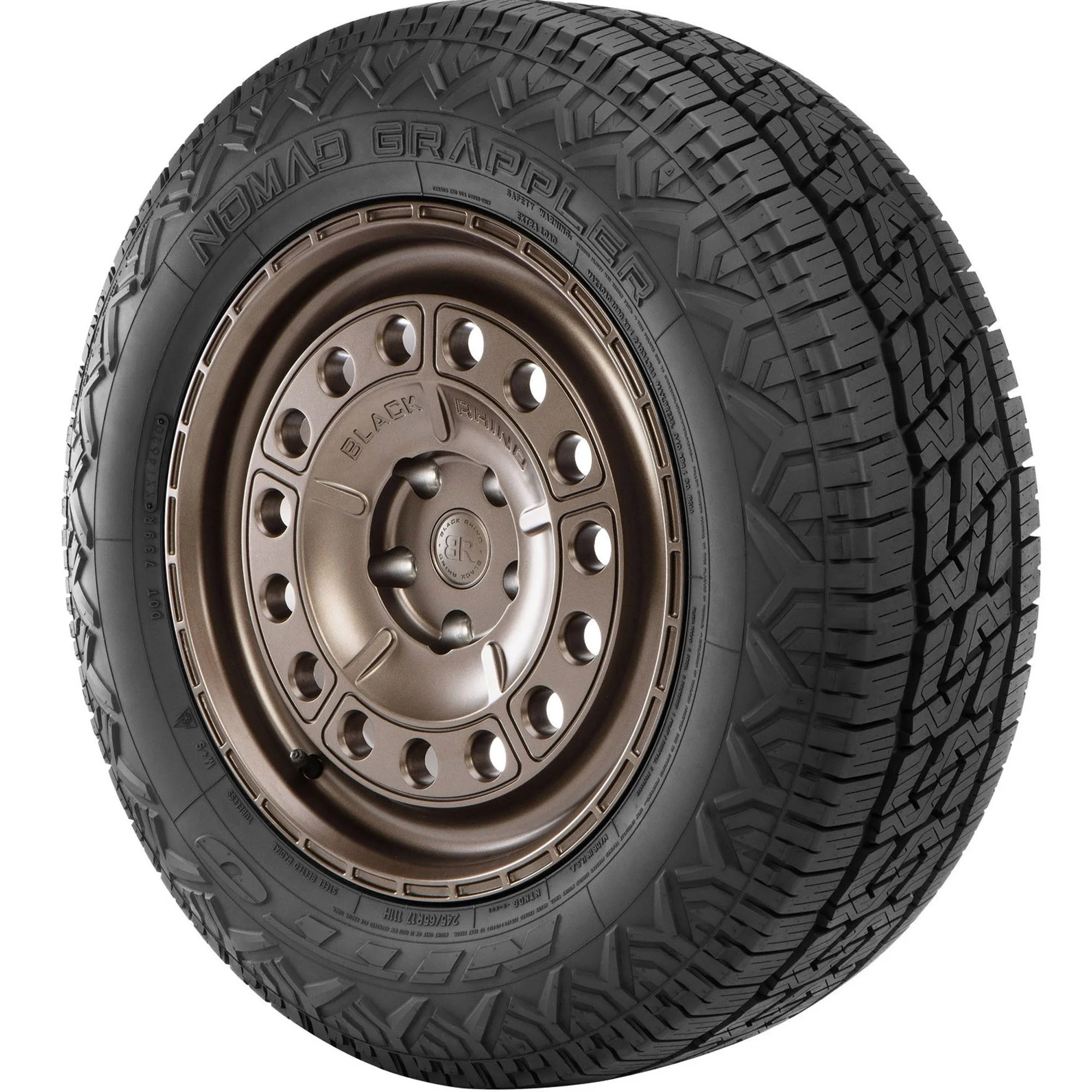 The Nomad Grappler from Nitto is an all-terrain tire that's built for use on CUVs and SUVs and features a special rubber compound that increases wet and snow traction while also reducing braking distances and lowering road noises. Backed by a 60,000 mile limited manufacturer tread life warranty, the Nomad Grappler's staggered sidewall lugs boost off-road traction while tapered blocks keep the tire rigid to increase performance on dry roads.