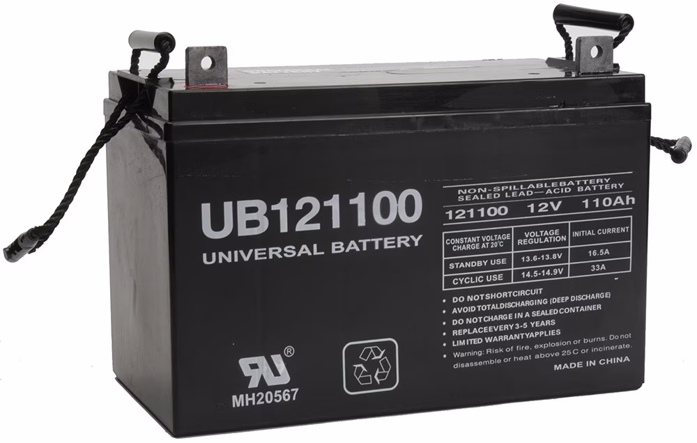 The UB121100 12V 110AH - is a deep cycle marine/RV battery built to the highest of standards by Universal Power Group. This AGM deep cycle battery is spill proof; it can be placed into service on its side!