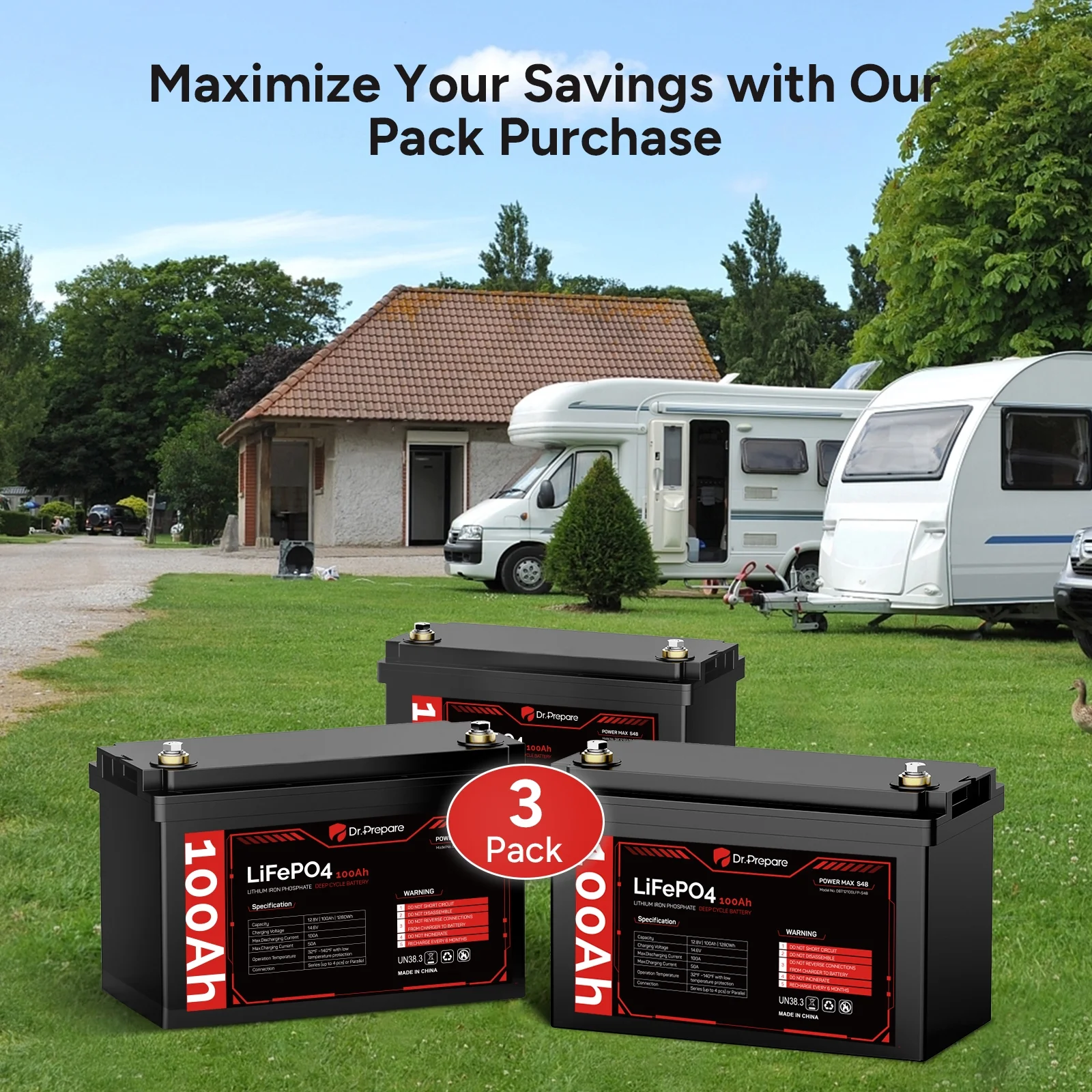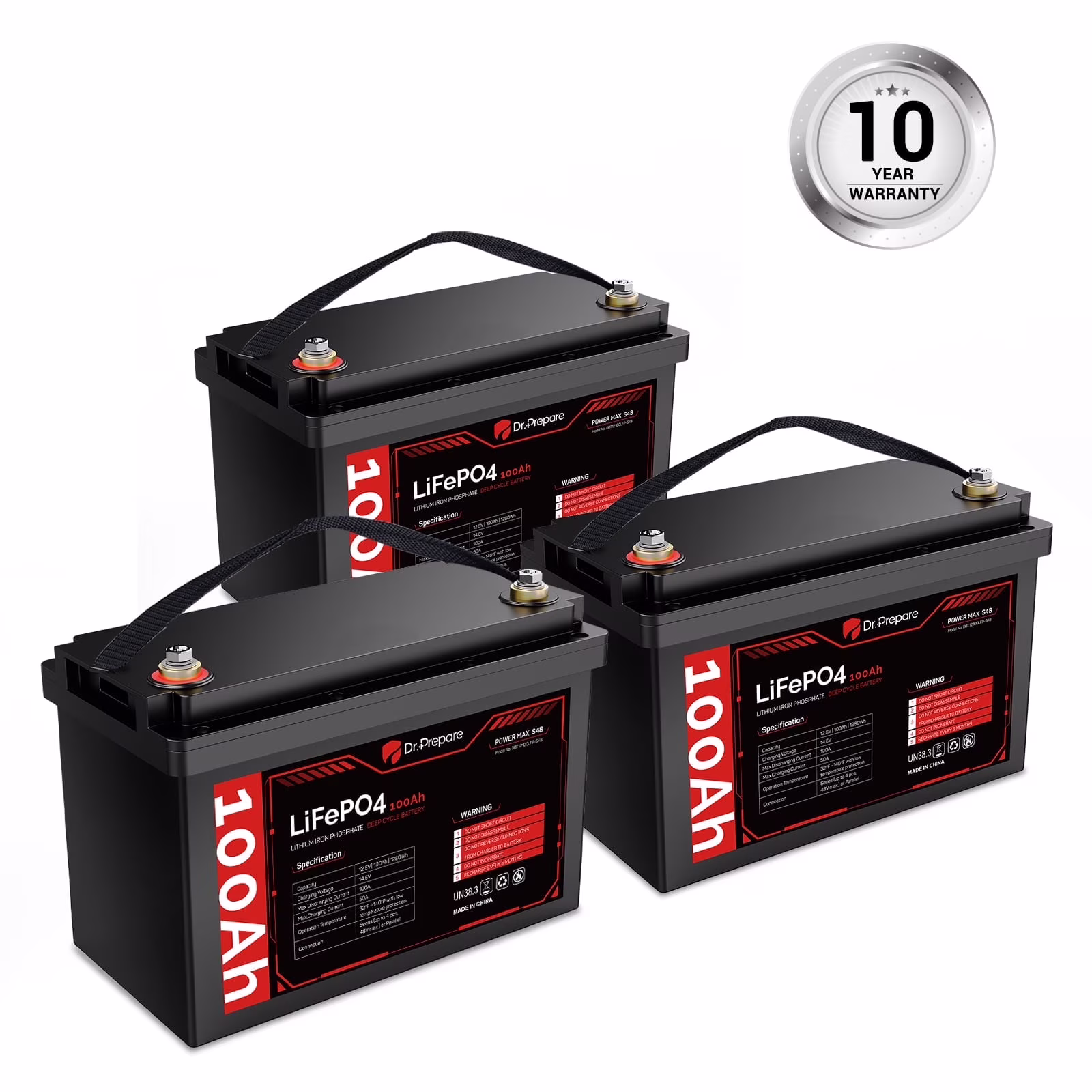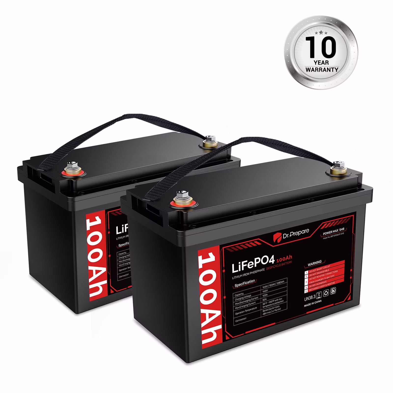 Supported by an industry-leading 10-year warranty and lifespan, our Dr. Prepare 12 volt 100Ah LiFePO4 battery is the ideal choice for various applications including RVs, trolling motors, boats, off-grid cabins, and home backup power storage.
