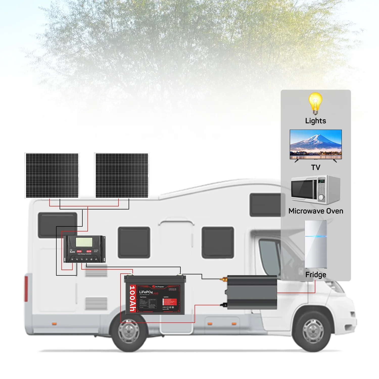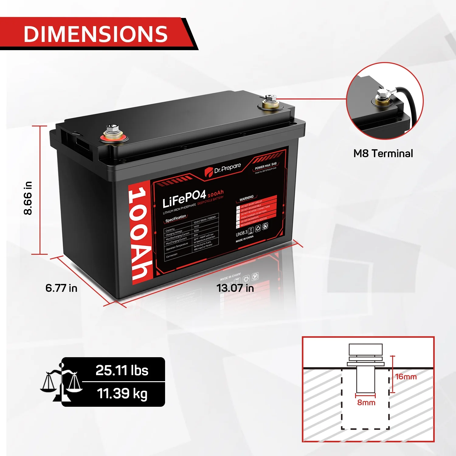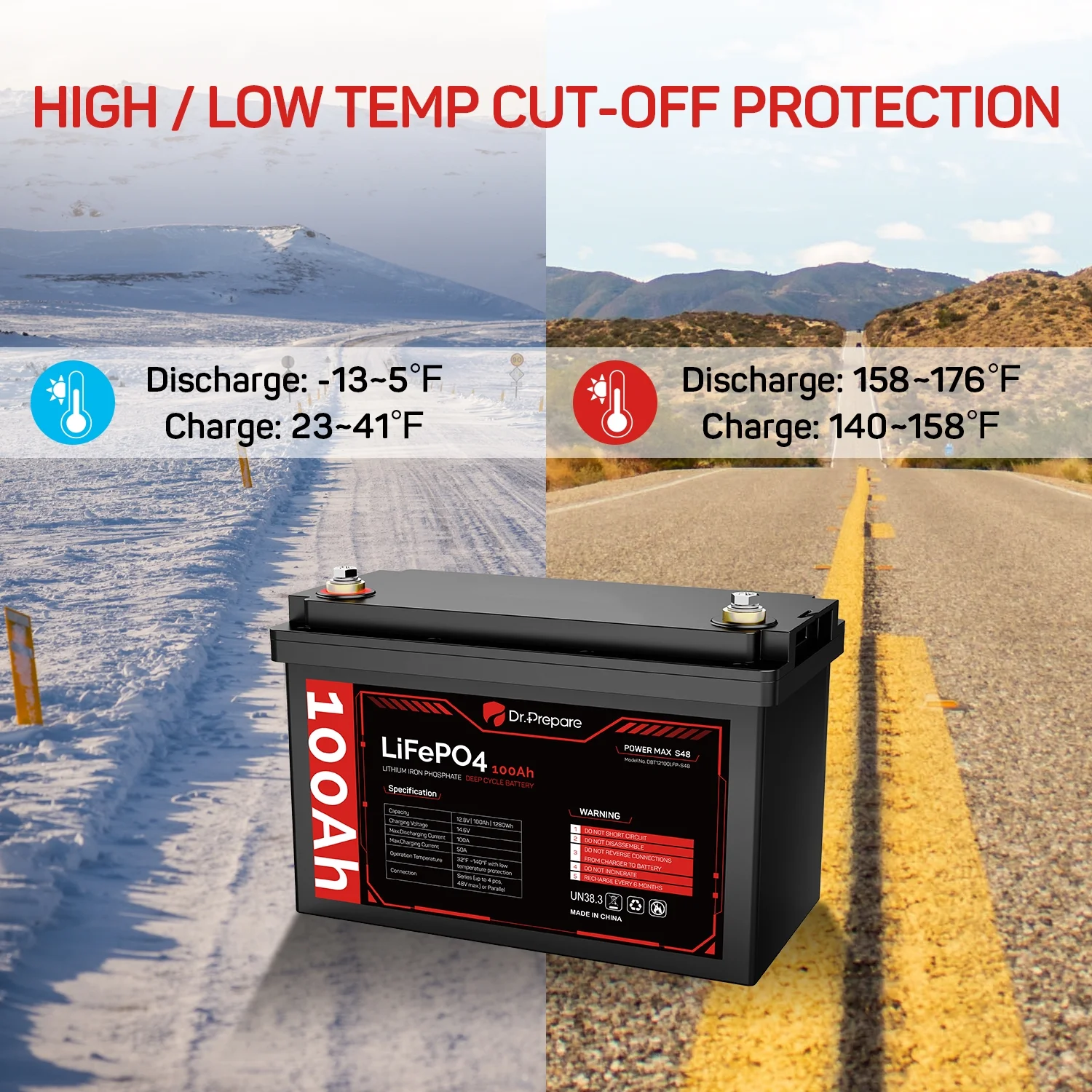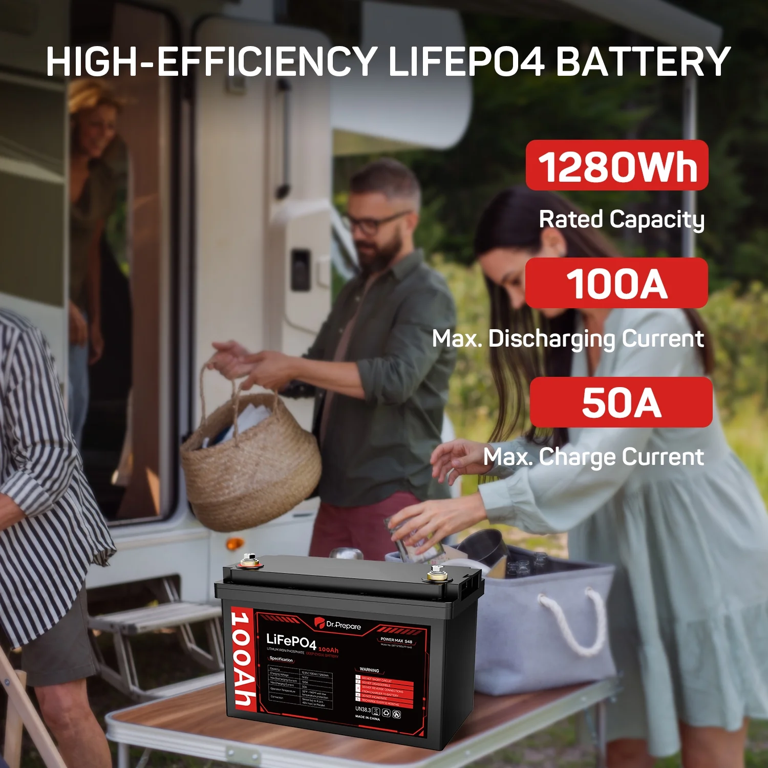 Supported by an industry-leading 10-year warranty and lifespan, our Dr. Prepare 12 volt 100Ah LiFePO4 battery is the ideal choice for various applications including RVs, trolling motors, boats, off-grid cabins, and home backup power storage.