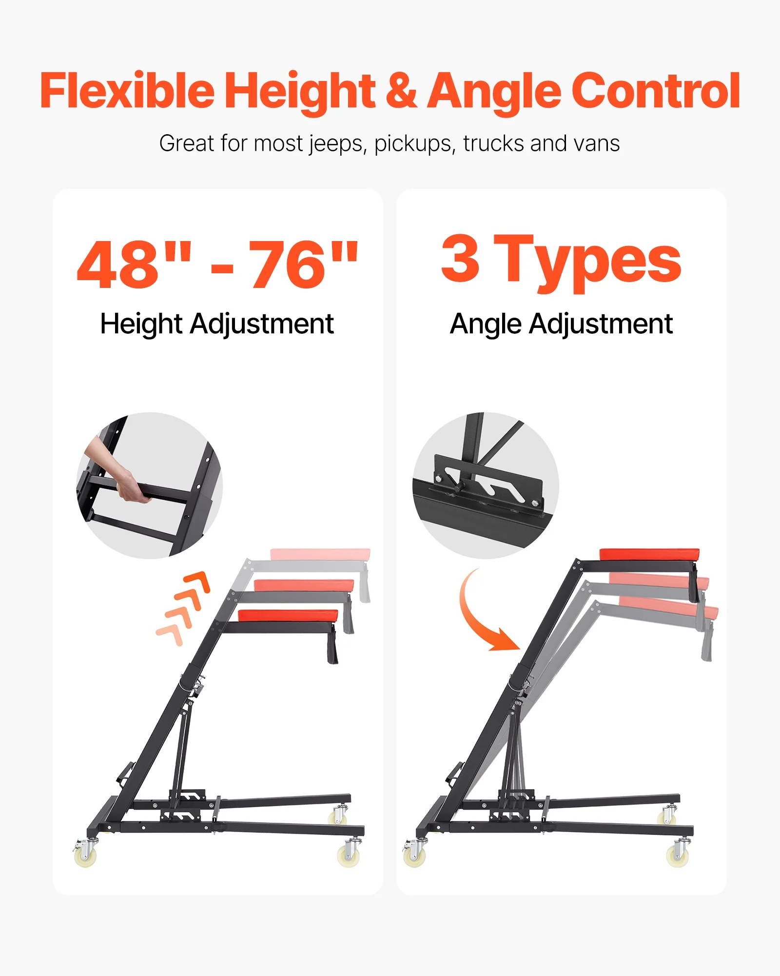 - Flexible Height Adjustments: Our automotive topside creeper offers multi-stage height adjustment options, ranging from 48 to 76 inches (1219-1930 mm). With 3-angle choices, you can work comfortably without straining your body or overstretching your arms. Perfect for engine bay repairs on various vehicles.