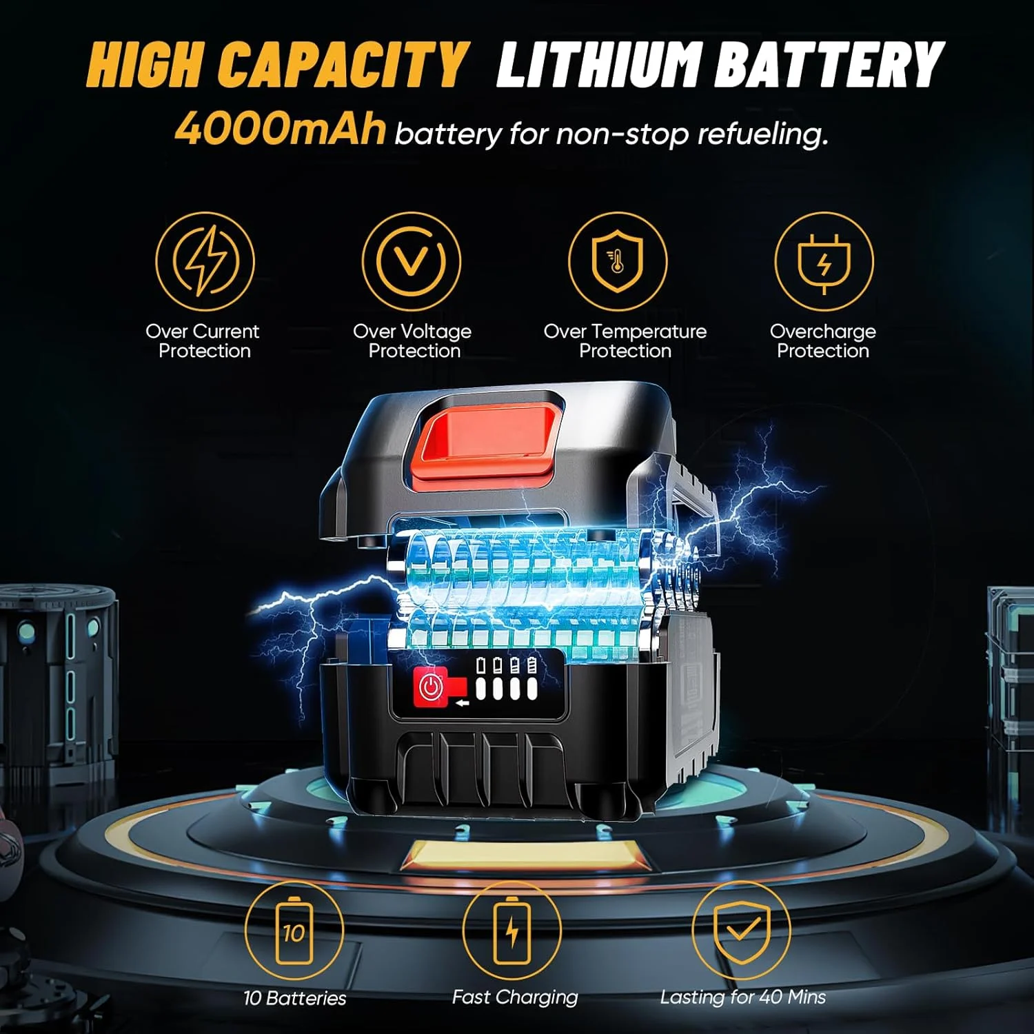 - Powered by included 21V 4.0Ah (4000mAh) Li-ion battery & charger