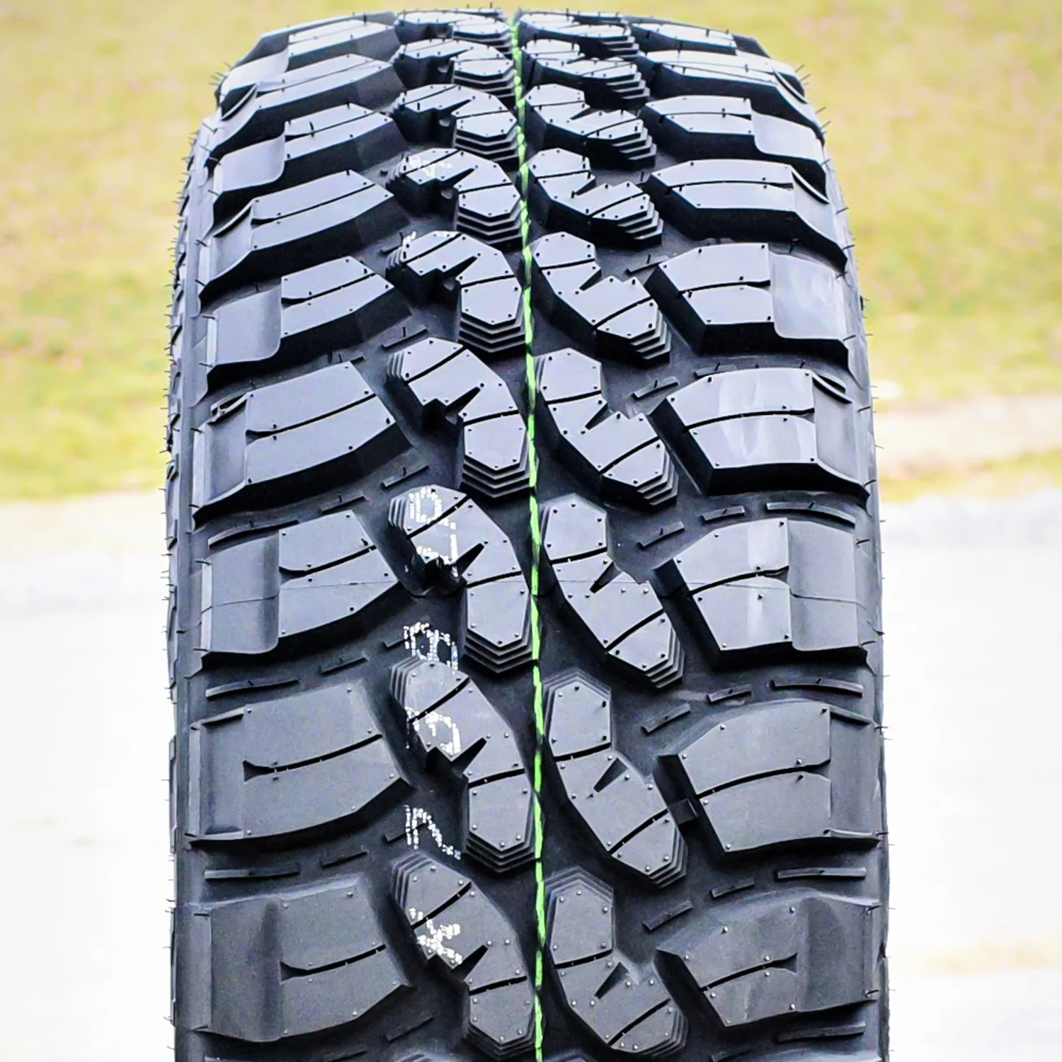 The tire conquers all loose and soft road surfaces as it has excellent mud terrain traction. This enhanced mud terrain traction is the result of the center rib located in the tread pattern, which hinders the mud flow through the footprint. The stopped mud flow provides a clean tread and the tire maintains excellent mud traction. The tire's traction is also enhanced with the self-cleaning ability of the tread itself. The tread blocks clean out mud and snow and eject rocks stuck in the tread grooves, maintaining constant road contact without fail.