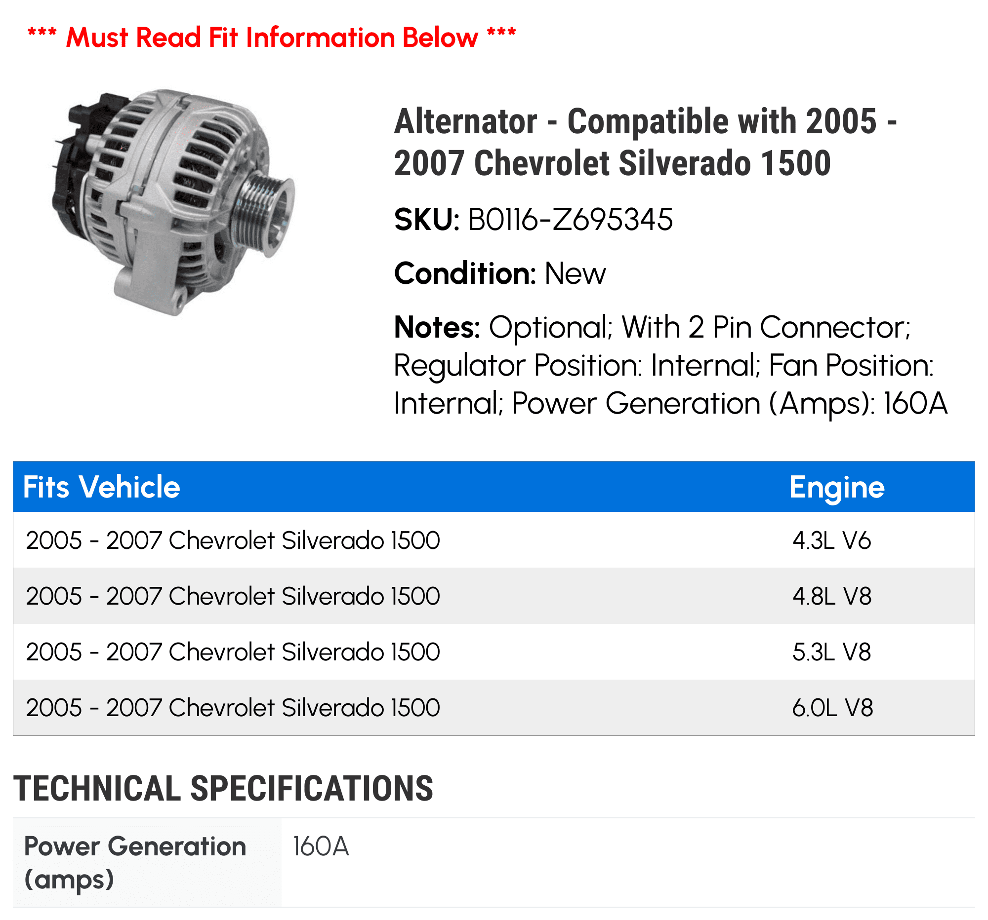 Note: Optional; With 2 Pin Connector; Regulator Position: Internal; Fan Position: Internal; Power Generation (Amps): 160A