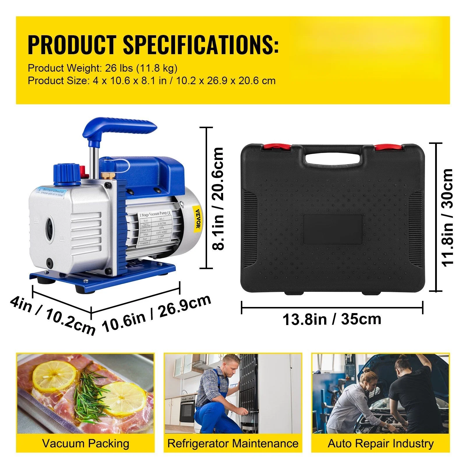 - Easy Monitoring & Cooling: With an oil viewing window, this AC vacuum pump can easily monitor oil levels to avoid oil deficiency. Our vacuum pump tool can cool itself and prevent itself from burning out. The built-in thermal protection prevents the machine from burning and extends the machine's life.