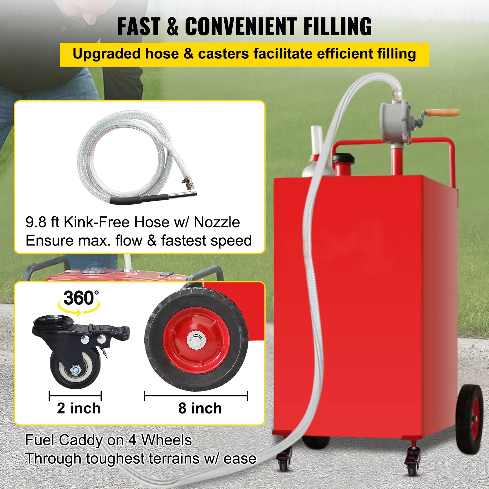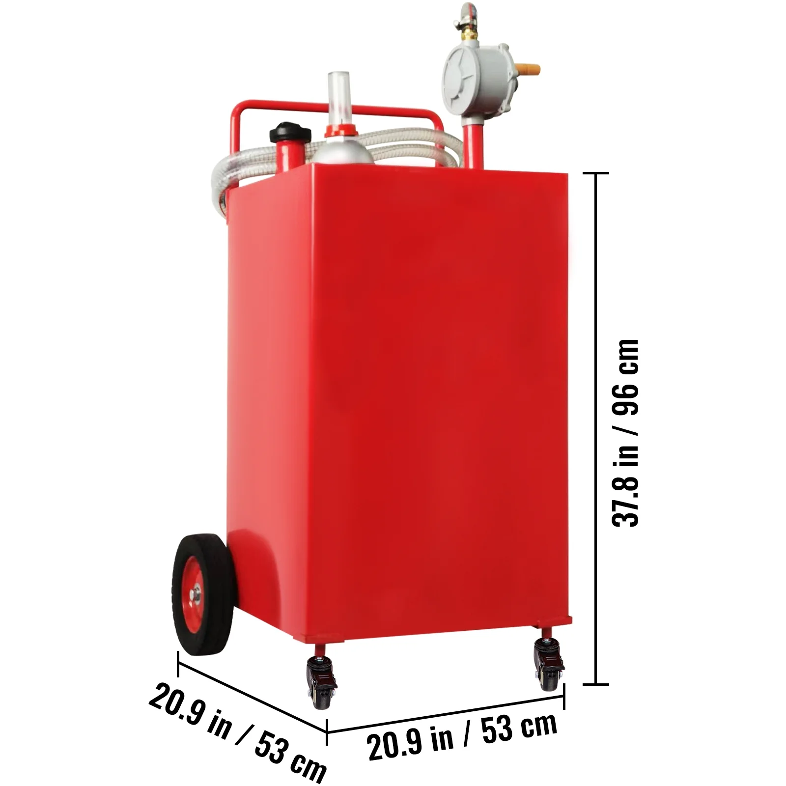 - Effortless Transportation and Easy to Use: Features an anti-static grounding clip to prevent electrostatic discharge, an accurate refueling gauge for quick fuel level checks, and heavy-duty 8-inch wheels with 2-inch casters for easy transport over rough terrain. Includes a filler neck with gas cap, convenient tube holder, and lever push handle