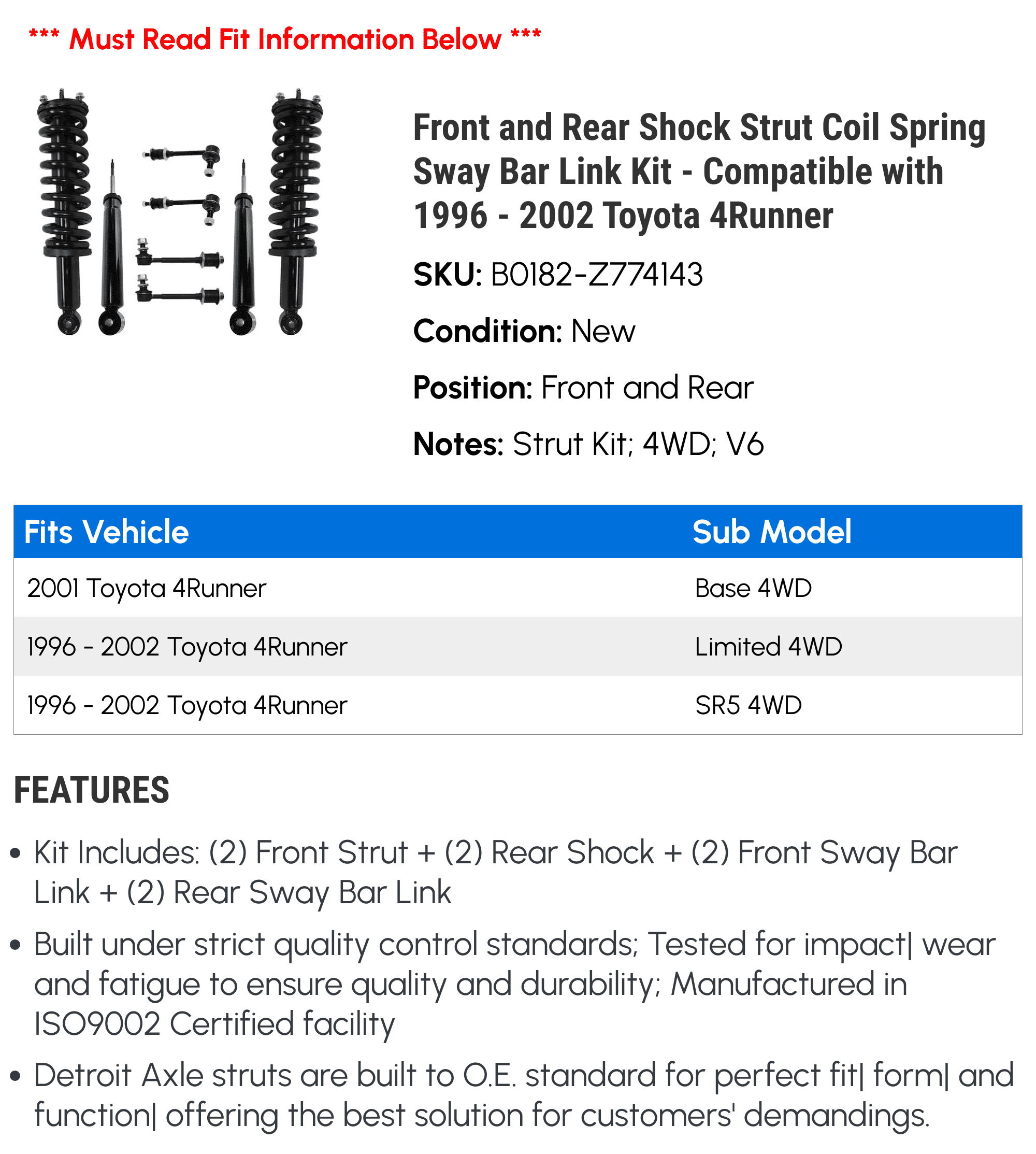 - Kit Includes: (2) Front Strut + (2) Rear Shock + (2) Front Sway Bar Link + (2) Rear Sway Bar Link