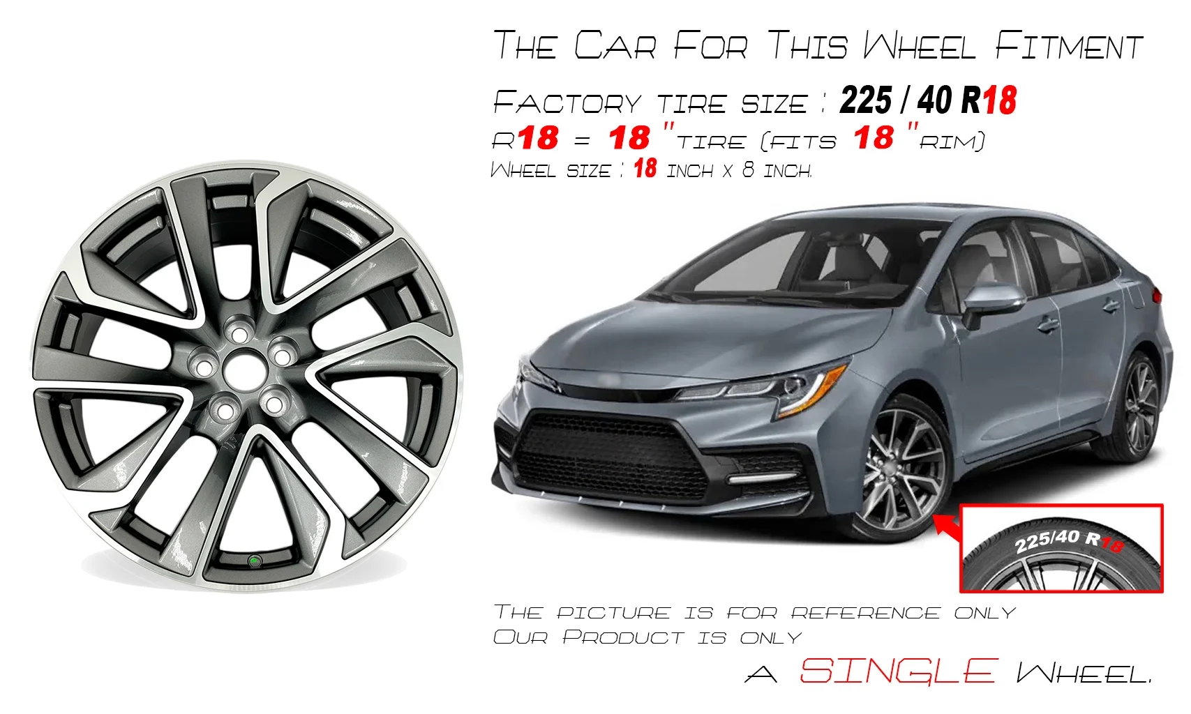 - ? This part will fit these makes and models with these options: ? COROLLA 2019-2022 Hatchback, 18x8 (alloy, 10 spoke), machined and painted (gray inlay) ? OEM Tire Size: 225/40R18 ? Color/Finish: Charcoal Machined