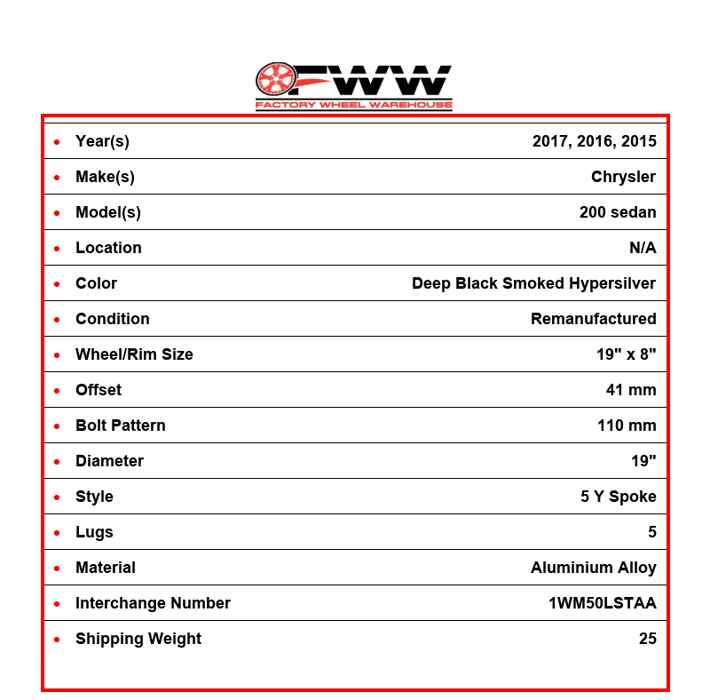 This Factory OEM CHRYSLER Aluminium Alloy 5 Y SPOKE wheel comes stock on 2017, 2016, 2015 CHRYSLER 200 SEDAN. The OEM part number(s) for the rim are 1WM50LSTAA, 560-02515. This is a 5 lug wheel with a 19 inch diameter, width of 8 inch and an offset of 41 mm. The finish on the wheel is DEEP BLACK SMOKED HYPERSILVER.