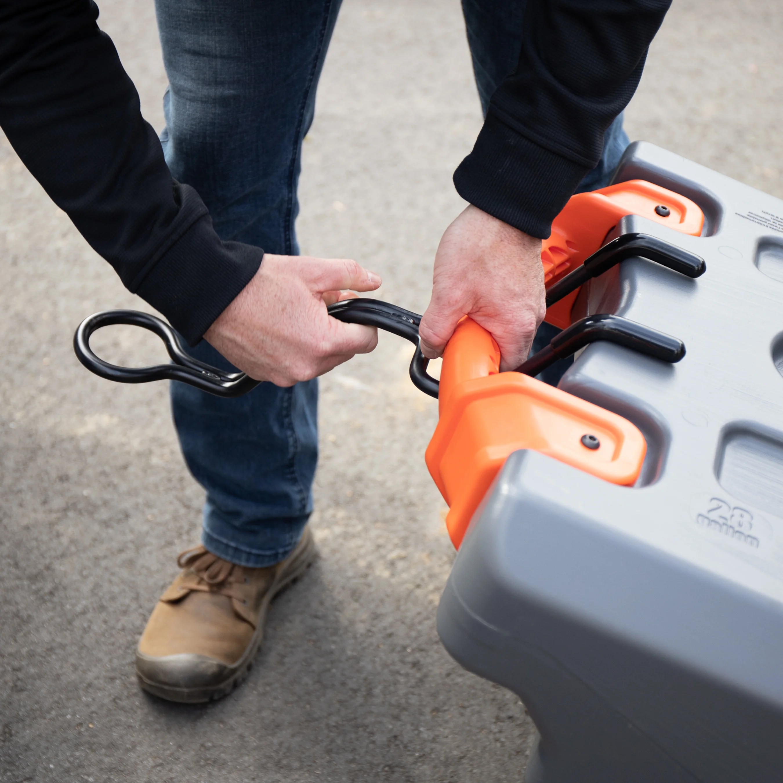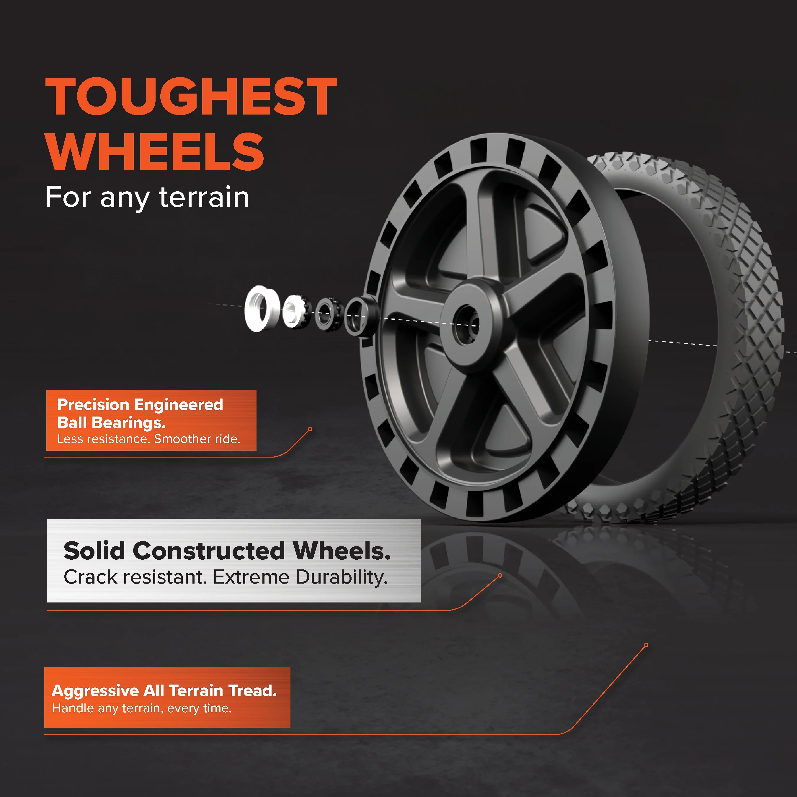 - EFFORTLESS TRANSPORT: Haul your waste with ease with no-flat wheels built for any terrain, an oversized handle for easy maneuvering, & a steel tow adapter for effortless towing behind a truck or golf cart.